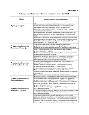 Załącznik 1b Zakres prezentacji, na podstawie załącznika nr 1a do SIWZ. Moduł Wymagania ogólne Wymagania dla modułu Rejestracja/Recepcja Wymagania dla modułu Statystyka Przychodni Wymagania dla modułu Gabinet Lekarski Wymagania dla modułu Rejestracja Poradni Wymagania do zaprezentowania Oferowany system musi umożliwiać równoczesną pracę zarówno w modelu dwuwarstwowym (desktopowym) lub trójwarstwowym (webowym), zależnie od bieżących potrzeb Zamawiającego. Zakres używanych skrótów klawiszowych musi być spójny między wersjami architektur systemu. Pola obligatoryjne, opcjonalne i wypełniane automatycznie muszą być jednoznacznie rozróżnialne przez użytkownika (np. inny kształt, kolor, itp.). System musi udostępniać proces wyszukiwania danych z zastosowaniem znaków specjalnych zastępujących co najmniej fragment wyszukiwanego tekstu lub pojedynczy znak (np. analogicznie do systemu DOS „*” fragment tekstu, „?” – pojedynczy znak) System umożliwia ewidencjonowanie i wydruk oświadczeń pacjenta/opiekuna prawnego potwierdzających uprawnienie do świadczeń opieki zdrowotnej finansowanych ze środków publicznych Moduł uniemożliwia dokonanie ponownego przyjęcia pacjenta przebywającego już w szpitalu. Definiowanie minimalnego zbioru danych, który musi być uzupełniony przed zamknięciem wizyty pacjenta. Blokowanie zamknięcia wizyty pacjenta w przypadku braku Karty Zgłoszenia Choroby Psychicznej/Nowotworowej/ Zakaźnej, jeśli pacjentowi zaewidencjonowano takowe rozpoznanie. Możliwość wprowadzania słownika procedur rozliczeniowych do poszczególnych płatników. Podgląd informacji, jacy pacjenci (co najmniej imię i nazwisko) przebywają aktualnie na oddziale i w całym szpitalu Możliwość obliczania i zatwierdzania ruchu pacjentów w szpitalu. Moduł umożliwia zamknięcie ksiąg bieżącego roku wraz z automatycznym przepisaniem pacjentów przebywających w szpitalu na następny rok. Moduł umożliwia ewidencję nieoddanych historii choroby. Możliwość przyjęcia pacjenta bezpośrednio przez Oddział do szpitala. Monitorowanie stanu obłożenia Oddziału (moduł musi dopuszczać przyjęcie pacjenta nawet, gdy nie ma wolnych łóżek na Oddziale). Tworzenie zbiorczego zapotrzebowania żywnościowego dla pacjentów Oddziału z możliwością przeliczania ilości zamawianych posiłków wg przypisanych pacjentom diet. System umożliwia ewidencję i podgląd limitów przyjęć do poszczególnych poradni. System umożliwia prowadzenie wspólnej numeracji kartotek pacjentów w ramach wszystkich poradni lub oddzielnej numeracji w ramach poszczególnych poradni System umożliwia ewidencjonowanie dodatkowych informacji o pacjencie, które są wyświetlane podczas przyjęcia pacjenta do poradni. W trakcie rejestracji pacjenta moduł umożliwia automatyczny wybór specjalisty oraz termin wizyty. Istnieje możliwość dokonania manualnej zmiany tego terminu oraz wpisania kilku wizyt na ten sam termin. Wymagania dla modułu Poradnia Wymagania dla modułu Dokumentacja Medyczna Wymagania dla modułu Zlecenia medyczne Wymagania dla modułu Rozliczenia z NFZ i komercyjne Wymagania dla modułu Zakażenia Prezentacja wszystkich pacjentów zapisanych na wizytę do danej poradni. Możliwość ewidencji wystawionych recept zgodnie z obowiązującymi przepisami. Możliwość dodawania dowolnych plików powiązanych z danym pacjentem oraz wizytą. Możliwość definiowania przez użytkownika dynamicznego panelu lekarskiego mogącego mieć specyficzny wygląd dla każdego oddziału: • Panel składa się z minimum 4 obszarów, którym użytkownicy w zależności od swoich preferencji mogą przypisywać funkcje lub rejestry z zakresu: • Wykaz pacjentów, • Dane personalne pacjentów, • Zlecenia, • Wyniki, • Elementy historii choroby, • Rozpoznania, • Procedury Medyczne, • Informacje prezentowane w poszczególnych obszarach są ze sobą skorelowane tzn. wybierając z listy danego pacjenta we wszystkich innych obszarach prezentowane są dane przyporządkowane do jego hospitalizacji. Lokalizację poszczególnych obszarów na ekranie można dynamicznie zmieniać z wykorzystaniem funkcji przeciągnij/upuść. Możliwość ewidencji badań przedmiotowych w strukturze hierarchicznej i ich prezentacja za pomocą tzw.”drzewa”. Możliwość przypisania badaniom przedmiotowym wzorów graficznych. Nanoszenie dowolnych informacji na wzór w ramach badania pacjenta(tekst i figury geometryczne). Możliwość wypełnienia automatycznie karty informacyjnej w oparciu o zgromadzone dane o leczeniu (wyniki laboratoryjne, diagnostyczne, rozpoznania, procedury). Moduł umożliwia wstrzymanie wydawania zleconych leków ze względów na skutki uboczne, wycofanie leków bądź z innych przyczyn. Moduł umożliwia wizualizację (za pomocą kolorów) stanu realizacji danego zlecenia. Moduł umożliwia przekazania informacji do laboratorium o fakcie, że pacjent jest osobą leżącą. Moduł umożliwia podgląd wszystkich zleceń na środki farmakologiczne w danej jednostce. Możliwość ewidencjonowania umów zawartych z oddziałami NFZ, w tym import umów ze struktury UMX udostępnianej przez NFZ według aktualnego formatu Możliwość ewidencjonowania umów zawartych przez poszczególne jednostki organizacyjne szpitala lub przychodni: laboratoria, pracownie diagnostyczne, inne. Możliwość raportowania braków w danych niezbędnych do rozliczenia świadczeń. Możliwość zmiany kwalifikacji płatnika za wykonane świadczenia. Moduł automatycznie pobiera z Ruchu Chorych wszystkie dane niezbędne do wyznaczenia JGP . Możliwość ewidencji zgłoszeń zakażeń na oddziale. Możliwość tworzenia szablonów dokumentów wykorzystywanych w komórce zakażeń szpitalnych. Wymagania dla modułu ePacjent Wymagania dla modułu Elektroniczna Dokumentacja Medyczna Wymagania dla modułu Pracownia Diagnostyczna Wymagania dla modułu Apteka Wymagania dla modułu Apteczka O
