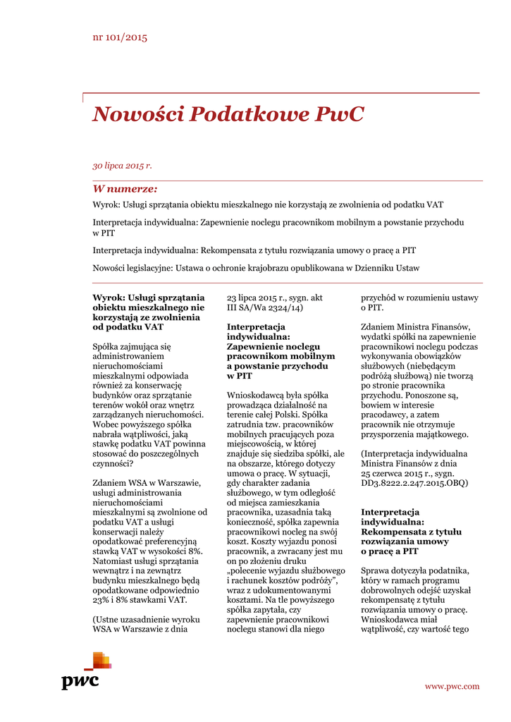 nr 101/2015 Nowości Podatkowe PwC 30 lipca 2015 r. W numerze: Wyrok: Usługi sprzątania obiektu mieszkalnego nie korzystają ze zwolnienia od podatku VAT Interpretacja indywidualna: Zapewnienie noclegu pracownikom mobilnym a powstanie przychodu w PIT Interpretacja indywidualna: Rekompensata z tytułu rozwiązania umowy o pracę a PIT Nowości legislacyjne: Ustawa o ochronie krajobrazu opublikowana w Dzienniku Ustaw Wyrok: Usługi sprzątania obiektu mieszkalnego nie korzystają ze zwolnienia od podatku VAT Spółka zajmująca się administrowaniem nieruchomościami mieszkalnymi odpowiada również za konserwację budynków oraz sprzątanie terenów wokół oraz wnętrz zarządzanych nieruchomości. Wobec powyższego spółka nabrała wątpliwości, jaką stawkę podatku VAT powinna stosować do poszczególnych czynności? Zdaniem WSA w Warszawie, usługi administrowania nieruchomościami mieszkalnymi są zwolnione od podatku VAT a usługi konserwacji należy opodatkować preferencyjną stawką VAT w wysokości 8%. Natomiast usługi sprzątania wewnątrz i na zewnątrz budynku mieszkalnego będą opodatkowane odpowiednio 23% i 8% stawkami VAT. (Ustne uzasadnienie wyroku WSA w Warszawie z dnia 23 lipca 2015 r., sygn. akt III SA/Wa 2324/14) przychód w rozumieniu ustawy o PIT. Interpretacja indywidualna: Zapewnienie noclegu pracownikom mobilnym a powstanie przychodu w PIT Zdaniem Ministra Finansów, wydatki spółki na zapewnienie pracownikowi noclegu podczas wykonywania obowiązków służbowych (niebędącym podróżą służbową) nie tworzą po stronie pracownika przychodu. Ponoszone są, bowiem w interesie pracodawcy, a zatem pracownik nie otrzymuje przysporzenia majątkowego. Wnioskodawcą była spółka prowadząca działalność na terenie całej Polski. Spółka zatrudnia tzw. pracowników mobilnych pracujących poza miejscowością, w której znajduje się siedziba spółki, ale na obszarze, którego dotyczy umowa o pracę. W sytuacji, gdy charakter zadania służbowego, w tym odległość od miejsca zamieszkania pracownika, uzasadnia taką konieczność, spółka zapewnia pracownikowi nocleg na swój koszt. Koszty wyjazdu ponosi pracownik, a zwracany jest mu on po złożeniu druku „polecenie wyjazdu służbowego i rachunek kosztów podróży”, wraz z udokumentowanymi kosztami. Na tle powyższego spółka zapytała, czy zapewnienie pracownikowi noclegu stanowi dla niego (Interpretacja indywidualna Ministra Finansów z dnia 25 czerwca 2015 r., sygn. DD3.8222.2.247.2015.OBQ) Interpretacja indywidualna: Rekompensata z tytułu rozwiązania umowy o pracę a PIT Sprawa dotyczyła podatnika, który w ramach programu dobrowolnych odejść uzyskał rekompensatę z tytułu rozwiązania umowy o pracę. Wnioskodawca miał wątpliwość, czy wartość tego www.pwc.com Nowości Podatkowe PwC świadczenia jest wolna od podatku PIT. W interpretacji indywidualnej organ podatkowy ocenił, że wolne od podatku dochodowego są otrzymane odszkodowania lub zadośćuczynienia, jeżeli ich wysokość lub zasady ustalania wynikają wprost z postanowień układów zbiorowych pracy, innych opartych na ustawie porozumień zbiorowych, regulaminów lub statutów, o których mowa w Kodeksie pracy. Wobec tego, wypłacona rekompensata mająca na celu zadośćuczynienie strat związanych z brakiem możliwości osiągania wynagrodzenia u pracodawcy, korzysta ze zwolnienia z opodatkowania PIT. W konsekwencji, pobrana przez pracodawcę zaliczka na podatek dochodowy z tytułu wypłaconej rekompensaty stanowi nienależnie pobrany podatek przez płatnika, podlegający zwrotowi w wyniku złożenia przez podatniczkę zeznania rocznego o wysokości osiągniętego dochodu w roku podatkowym oraz wniosku o stwierdzenie nadpłaty. (Interpretacja indywidualna DIS w Łodzi z dnia 30 czerwca 2015 r., sygn. IPTPB2/4511167/15-4/PK) Zgodnie ze znowelizowanymi przepisami, rada gminy może wprowadzić opłatę reklamową od umieszczonych tablic reklamowych lub urządzeń reklamowych. Tym samym, podatnicy powinni przygotować się na dodatkowe obciążenia związane z możliwością wprowadzenia od 2016 r. opłaty reklamowej. Nowości legislacyjne: Ustawa o ochronie krajobrazu opublikowana w Dzienniku Ustaw Przepisy w znowelizowanym brzmieniu wchodzą w życie po upływie trzech miesięcy od dnia ogłoszenia, czyli z dniem 11 września 2015 r. W dniu 10 czerwca 2015 r. została ogłoszona ustawa o zmianie niektórych ustaw w związku ze wzmocnieniem narzędzi ochrony krajobrazu. Na mocy tej ustawy do ustawy o podatkach i opłatach lokalnych zostały dodane przepisy regulujące opłatę reklamową. (Źródło: dziennikustaw.gov.pl) Dodatkowe informacje www.pwc.pl Porozmawiajmy W przypadku pytań, prosimy o kontakt: Zespół Zarządzania Wiedzą Działu Prawnopodatkowego PwC www.taxonline.pl Zapraszamy także na Twittera: @pwcpodatki Zastrzeżenie prawne: Publikacja ma jedynie charakter informacyjny i nie stanowi porady podatkowej w rozumieniu polskich przepisów, w szczególności Ustawy z dnia 5 lipca 1996 r. o doradztwie podatkowym. Nie powinni Państwo opierać swoich działań/decyzji na treści informacji zawartych w tej publikacji bez uprzedniego uzyskania profesjonalnej porady. © 2015 PricewaterhouseCoopers Sp. z o.o. Wszystkie prawa zastrzeżone. W tym dokumencie nazwa "PwC" odnosi się do PricewaterhouseCoopers Sp. z o.o., firmy wchodzącej w skład sieci PricewaterhouseCoopers International Limited, z których każda stanowi odrębny i niezależny podmiot prawny.