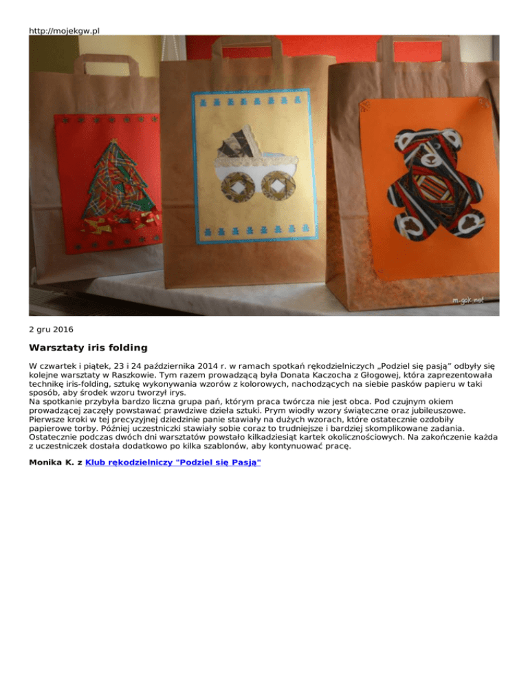 http://mojekgw.pl 2 gru 2016 Warsztaty iris folding W czwartek i piątek, 23 i 24 października 2014 r. w ramach spotkań rękodzielniczych „Podziel się pasją” odbyły się kolejne warsztaty w Raszkowie. Tym razem prowadzącą była Donata Kaczocha z Głogowej, która zaprezentowała technikę iris-folding, sztukę wykonywania wzorów z kolorowych, nachodzących na siebie pasków papieru w taki sposób, aby środek wzoru tworzył irys. Na spotkanie przybyła bardzo liczna grupa pań, którym praca twórcza nie jest obca. Pod czujnym okiem prowadzącej zaczęły powstawać prawdziwe dzieła sztuki. Prym wiodły wzory świąteczne oraz jubileuszowe. Pierwsze kroki w tej precyzyjnej dziedzinie panie stawiały na dużych wzorach, które ostatecznie ozdobiły papierowe torby. Później uczestniczki stawiały sobie coraz to trudniejsze i bardziej skomplikowane zadania. Ostatecznie podczas dwóch dni warsztatów powstało kilkadziesiąt kartek okolicznościowych. Na zakończenie każda z uczestniczek dostała dodatkowo po kilka szablonów, aby kontynuować pracę. Monika K. z Klub rękodzielniczy "Podziel się Pasją"