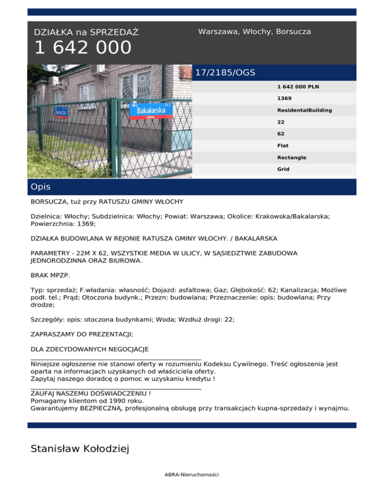 Warszawa, Włochy, Borsucza DZIAŁKA na SPRZEDAŻ 1 642 000 17/2185/OGS 1 642 000 PLN 1369 ResidentalBuilding 22 62 Flat Rectangle Grid Opis BORSUCZA, tuż przy RATUSZU GMINY WŁOCHY Dzielnica: Włochy; Subdzielnica: Włochy; Powiat: Warszawa; Okolice: Krakowska/Bakalarska; Powierzchnia: 1369; DZIAŁKA BUDOWLANA W REJONIE RATUSZA GMINY WŁOCHY. / BAKALARSKA PARAMETRY - 22M X 62, WSZYSTKIE MEDIA W ULICY, W SĄSIEDZTWIE ZABUDOWA JEDNORODZINNA ORAZ BIUROWA. BRAK MPZP. Typ: sprzedaż; F.władania: własność; Dojazd: asfaltowa; Gaz; Głębokość: 62; Kanalizacja; Możliwe podł. tel.; Prąd; Otoczona budynk.; Przezn: budowlana; Przeznaczenie: opis: budowlana; Przy drodze; Szczegóły: opis: otoczona budynkami; Woda; Wzdłuż drogi: 22; ZAPRASZAMY DO PREZENTACJI; DLA ZDECYDOWANYCH NEGOCJACJE _____________________________________________________ Niniejsze ogłoszenie nie stanowi oferty w rozumieniu Kodeksu Cywilnego. Treść ogłoszenia jest oparta na informacjach uzyskanych od właściciela oferty. Zapytaj naszego doradcę o pomoc w uzyskaniu kredytu ! _____________________________________________________ ZAUFAJ NASZEMU DOŚWIADCZENIU ! Pomagamy klientom od 1990 roku. Gwarantujemy BEZPIECZNĄ, profesjonalną obsługę przy transakcjach kupna-sprzedaży i wynajmu. Stanisław Kołodziej ABRA-Nieruchomości tel. 510 208 508 tel. 22 646 50 55 email: [email protected] ABRA-Nieruchomości Powered by TCPDF (www.tcpdf.org)