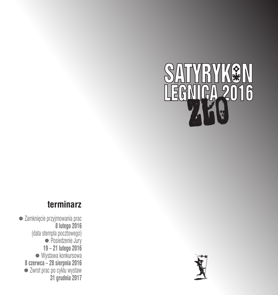 terminarz l Zamknięcie przyjmowania prac 8 lutego 2016 (data stempla pocztowego) l Posiedzenie Jury 19 – 21 lutego 2016 l Wystawa konkursowa 8 czerwca – 28 sierpnia 2016 l Zwrot prac po cyklu wystaw 31 grudnia 2017 NAGRODY Prace konkursowe kwalifikować do wystawy będzie międzynarodowe Jury. Jury przyzna następujące nagrody regulaminowe: GRAND PRIX SATYRYKONU 2016 szczerozłoty kluczyk oraz nagrodę pieniężną w wysokości 8.000 PLN 2 złote medale oraz nagrody pieniężne w wysokości 6.000 PLN 2 srebrne medale oraz nagrody pieniężne w wysokości 5.500 PLN 2 brązowe medale oraz nagrody pieniężne w wysokości 5.000 PLN 4 wyróżnienia po 4.000 PLN każde nagrodę dyrektora Legnickiego Centrum Kultury za fotografię w wysokości 4.000 PLN nagrodę Prezydenta Legnicy w wysokości 4.000 PLN Organizatorzy przewidują również przyznanie nagrody dla Autora najlepszego DEBIUTU wraz z organizacją autorskiej wystawy w Galerii SATYRYKON w ramach programu imprezy Satyrykon 2016. WARUNKI UCZESTNICTWA Międzynarodowa Wystawa SATYRYKON 2016 jest konkursem otwartym. Przedmiotem konkursu są rysunki, grafiki oraz inne dzieła plastyczne i fotograficzne wykonane w dowolnej technice, będące oryginałami – powstałe w ostatnich dwóch latach (2015-16) i zakwalifikowane przez autorów do działów: Uwaga! NAGRODA PODLEGA OPODATKOWANIU ZGODNIE Z OBOWIĄZUJĄCYMI PRZEPISAMI. Warunkiem wypłacenia nagród pieniężnych autorom zagranicznym jest ich przyjazd na otwarcie wystawy, zgłoszenie się po ich odbiór do dnia 15.12.2016 r. lub przekazanie na konto bankowe we wskazanej przez Autora walucie. TEMAT: ZŁO SATYRA I ŻART (preferowane rysunki bez podpisów) PRACE NAGRADZANE NA INNYCH KONKURSACH będą wyłączone z konkursu SATYRYKON. Format prac – maximum A-3 (297 x 420 mm) Prace należy składać lub przesyłać w opakowaniu zapobiegającym uszkodzeniu w terminie do dnia 8 lutego 2016 r. (data stempla pocztowego) na adres: Prawo ostatecznego podziału nagród regulaminowych, zmiany ich wysokości lub ich nieprzyznania oraz nieprzyznania GRAND PRIX SATYRYKONU przysługuje Jury. Decyzje Jury są ostateczne. Wyniki konkursu zostaną ogłoszone 1 marca 2016 r., na stronie internetowej: www.satyrykon.pl PRZYWILEJE UCZESTNIKÓW Międzynarodowa Wystawa SATYRYKON - LEGNICA 2016 Chojnowska 2, Akademia Rycerska, 59-220 Legnica Polska*Poland*Polen*Pologne Organizatorzy nie ponoszą odpowiedzialności za straty powstałe w transporcie. PROSIMY O NIEPRZESYŁANIE PRAC DROGĄ ELEKTRONICZNĄ, GDYŻ NIE BĘDĄ PRZYJMOWANE DO KONKURSU. Udział w konkursie jest bezpłatny. Jednak warunkiem zwrotu prac jest przekazanie na rzecz Galerii Satyrykonu wskazanej przez Autora pracy (prac), co stanowić będzie rekompensatę za koszty przesyłki. W razie niewskazania Autor wyraża zgodę na wybranie przez organizatora dowolnej pracy z nadesłanych na konkurs. Do pracy należy dołączyć zdjęcie lub karykaturę Autora, krótką notę biograficzną i wypełnioną kartę zgłoszenia (PROSZĘ WYPEŁNIĆ PISMEM DRUKOWANYM). Autor wyraża zgodę na publiczne przetwarzanie przesłanych danych i rozpowszechnianie wizerunku. Autorzy prac zakwalifikowanych do wystawy otrzymają bezpłatnie katalog. Organizatorzy zapewniają laureatom bezpłatny udział w imprezie SATYRYKON 2016 w dniach 16-19.06.2016 r. Prace nadesłane na konkurs po zakończeniu wystawy będą eksponowane w kraju i za granicą, a następnie zwrócone uczestnikom konkursu do końca 2017 r. PROSIMY AUTORÓW O ZGŁASZANIE DO BIURA SATYRYKONU WSZELKICH ZMIAN ADRESOWYCH - ADRES ZWROTNY/TELEFON/E-MAIL. POSTANOWIENIA KOŃCOWE Autorzy nadesłanych prac udzielają organizatorom konkursu nieodpłatnie prawa do wystawiania, wykorzystywania na wszelkich polach eksploatacji dla celów reklamowych, zwielokrotniania i wprowadzania do obrotu w formie katalogu SATYRYKONU. Prace nagrodzone przechodzą na własność organizatorów i zostaną włączone do zbiorów Galerii Satyrykonu. Ostateczną instancją decydującą o interpretacji regulaminu są organizatorzy wystawy. Nadesłanie prac na konkurs jest jednoznaczne z wyrażeniem przez Autora zgody na warunki niniejszego regulaminu oraz na upowszechnianie wizerunku Autora w katalogu wystawy pokonkursowej. Organizatorem Międzynarodowej Wystawy SATYRYKON - Legnica 2016 jest LEGNICKIE CENTRUM KULTURY (+4876 72-33-700; e-mail: [email protected] t.pl), a współorganizatorem Fundacja Kulturalno-Społeczna SATYRYKON (+4876 852-23-44; e-mail: [email protected]) - PL 59-220 Legnica, Chojnowska 2.