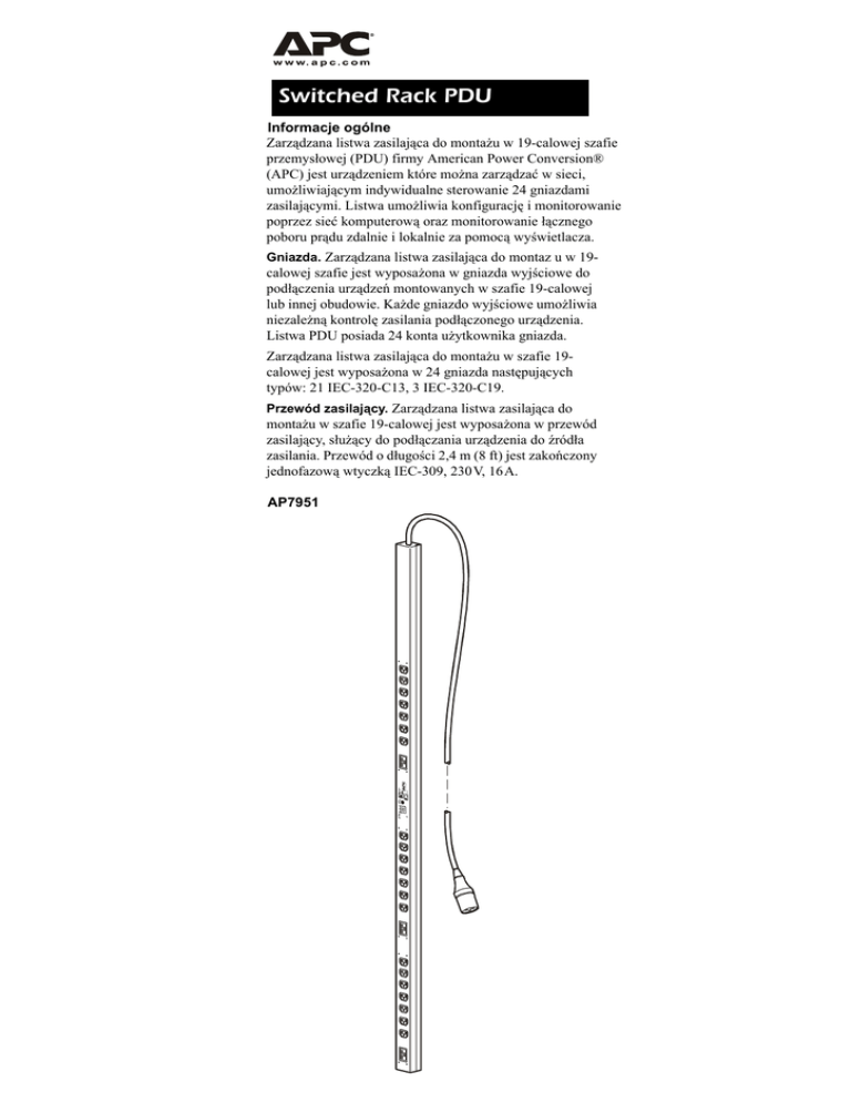 Switched Rack PDU Informacje ogólne Zarządzana listwa zasilająca do montażu w 19-calowej szafie przemysłowej (PDU) firmy American Power Conversion® (APC) jest urządzeniem które można zarządzać w sieci, umożliwiającym indywidualne sterowanie 24 gniazdami zasilającymi. Listwa umożliwia konfigurację i monitorowanie poprzez sieć komputerową oraz monitorowanie łącznego poboru prądu zdalnie i lokalnie za pomocą wyświetlacza. Gniazda. Zarządzana listwa zasilająca do montaz u w 19- calowej szafie jest wyposażona w gniazda wyjściowe do podłączenia urządzeń montowanych w szafie 19-calowej lub innej obudowie. Każde gniazdo wyjściowe umożliwia niezależną kontrolę zasilania podłączonego urządzenia. Listwa PDU posiada 24 konta użytkownika gniazda. Zarządzana listwa zasilająca do montażu w szafie 19calowej jest wyposażona w 24 gniazda następujących typów: 21 IEC-320-C13, 3 IEC-320-C19. Przewód zasilający. Zarządzana listwa zasilająca do montażu w szafie 19-calowej jest wyposażona w przewód zasilający, służący do podłączania urządzenia do źródła zasilania. Przewód o długości 2,4 m (8 ft) jest zakończony jednofazową wtyczką IEC-309, 230V, 16A. AP7951 Parametry techniczne Parametry elektryczne Złącze wejściowe Złącza wyjściowe Napięcie nominalne Tolerancja napięcia wejściowego Częstotliwość na wejściu Jednofazowe złącze IEC-309, 230V, 16A 21 gniazd IEC-320-C13; 3 gniazda IEC-320-C19 230 V ± 10% napięcia nominalnego 47–63 Hz Parametry fizyczne 161,92 ×5,56×4,39 cm (63,75 ×2,19×1,73”) 213.0 × 15.0 × 13.0 cm Wymiary opakowania (84.0 × 6.0 × 5.0”) Ciężar 5,9 kg (13 lb) Ciężar transportowy 6,8 kg (15 lb) Wymiary (W × S× G) Parametry środowiskowe Wysokość (n.p.m.): Eksploatacji: Przechowywania: Temperatura: Eksploatacji: Przechowywania: Wilgotność względna: Eksploatacji: Przechowywania: 0 do 3000 m (0 do 10000 ft) 0 do 15 000 m (0 do 50 000 ft) –5 do 45° C (23 do 113° F) ––25 do 65° C (13 do 149° F) 5 do 95%, bez kondensacji 5 do 95%, bez kondensacji Zgodność z normami Normy EMC EN55022, EN55024, IEC 61000-3-2, IEC 61000-3-3, AS/NZS 3548 Normy bezpieczeństwa CE, VDE, EN 60950 990-1485A-025 08/2004 *990-1485A-025*