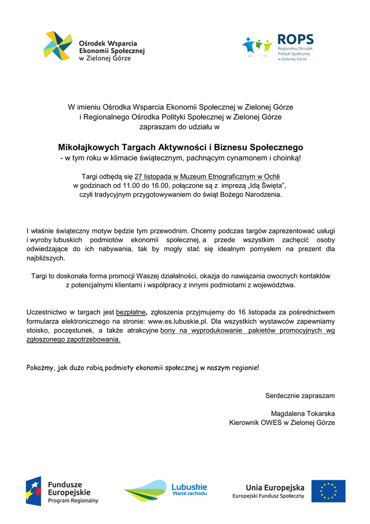 W imieniu Ośrodka Wsparcia Ekonomii Społecznej w Zielonej Górze i Regionalnego Ośrodka Polityki Społecznej w Zielonej Górze zapraszam do udziału w Mikołajkowych Targach Aktywności i Biznesu Społecznego - w tym roku w klimacie świątecznym, pachnącym cynamonem i choinką! Targi odbędą się 27 listopada w Muzeum Etnograficznym w Ochli w godzinach od 11.00 do 16.00, połączone są z imprezą „Idą Święta”, czyli tradycyjnym przygotowywaniem do świąt Bożego Narodzenia. I właśnie świąteczny motyw będzie tym przewodnim. Chcemy podczas targów zaprezentować usługi i wyroby lubuskich podmiotów ekonomii społecznej, a przede wszystkim zachęcić osoby odwiedzające do ich nabywania, tak by mogły stać się idealnym pomysłem na prezent dla najbliższych. Targi to doskonała forma promocji Waszej działalności, okazja do nawiązania owocnych kontaktów z potencjalnymi klientami i współpracy z innymi podmiotami z województwa. Uczestnictwo w targach jest bezpłatne, zgłoszenia przyjmujemy do 16 listopada za pośrednictwem formularza elektronicznego na stronie: www.es.lubuskie.pl. Dla wszystkich wystawców zapewniamy stoisko, poczęstunek, a także atrakcyjne bony na wyprodukowanie pakietów promocyjnych wg zgłoszonego zapotrzebowania. Pokażmy, jak dużo robią podmioty ekonomii społecznej w naszym regionie! Serdecznie zapraszam Magdalena Tokarska Kierownik OWES w Zielonej Górze