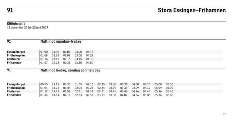 91 Stora Essingen–Frihamnen Giltighetstid 11 december 2016–22 juni 2017 91 Natt mot måndag–fredag Essingetorget Fridhemsplan Centralen Frihamnen 01.00 01.08 01.16 01.37 91 Natt mot lördag, söndag och helgdag Essingetorget Fridhemsplan Centralen Frihamnen 00.55 01.04 01.12 01.34 01.30 01.38 01.45 02.05 01.15 01.24 01.32 01.54 02.00 02.08 02.15 02.35 01.35 01.44 01.52 02.14 03.00 03.08 03.15 03.35 01.55 02.04 02.11 02.33 04.15 04.23 04.30 04.50 02.15 02.24 02.31 02.53 02.35 02.44 02.51 03.13 03.00 03.09 03.16 03.38 03.30 03.39 03.46 04.07 04.00 04.09 04.16 04.36 04.30 04.39 04.46 05.06 05.00 05.09 05.16 05.36 05.30 05.39 05.46 06.06 1 91 Frihamnen–Stora Essingen Giltighetstid 11 december 2016–22 juni 2017 91 Natt mot måndag–fredag Frihamnen Sergels torg Fridhemsplan Essingetorget 01.10 01.29 01.38 01.47 91 Natt mot lördag, söndag och helgdag Frihamnen Sergels torg Fridhemsplan Essingetorget 00.49 01.11 01.21 01.30 01.40 01.59 02.08 02.17 01.09 01.31 01.41 01.50 02.10 02.28 02.37 02.46 01.29 01.51 02.01 02.10 02.40 02.58 03.07 03.16 01.49 02.11 02.21 02.30 03.40 03.57 04.06 04.15 02.10 02.31 02.41 02.50 04.50 05.07 05.16 05.25 02.30 02.51 03.01 03.10 02.50 03.11 03.21 03.30 03.20 03.41 03.50 03.59 03.51 04.11 04.20 04.29 04.22 04.41 04.49 04.58 04.52 05.11 05.19 05.28 05.22 05.41 05.49 05.58 05.52 06.11 06.19 06.28 2 Hållplatser linje 91 Stora Essingen–Frihamnen Hållplatser linje 91 Frihamnen–Stora Essingen zA Essingetorget Östermalmstorg Karlavägen Jungfrugatan Värtavägen Storskärsgatan Kampementsbacken Gärdet Sandhamnsplan Rökubbsgatan Östhammarsgatan Sehlstedtsgatan Frihamnsporten Frihamnen zA Frihamnen Frihamnsporten Sehlstedtsgatan Östhammarsgatan Rökubbsgatan Sandhamnsplan Gärdet Kampementsbacken Storskärsgatan Värtavägen Jungfrugatan Karlavägen Östermalmstorg Nybroplan Kungsträdgården Sergels torg Centralen Blekholmsterrassen Kungsbroplan Scheelegatan S:t Eriks ögonsjukhus S:t Eriksgatan Fridhemsplan Mariebergsgatan Västerbroplan Fyrverkarbacken Wivalliusgatan Lilla Essingen Primusgatan Broparken Flottbrovägen Essingetorget 3 Flottbrovägen Broparken Primusgatan Lilla Essingen Wivalliusgatan Fyrverkarbacken Västerbroplan Mariebergsgatan Fridhemsplan S:t Eriksgatan S:t Eriks ögonsjukhus Scheelegatan Kungsbroplan Blekholmsterrassen Centralen Sergels torg Kungsträdgården Nybroplan