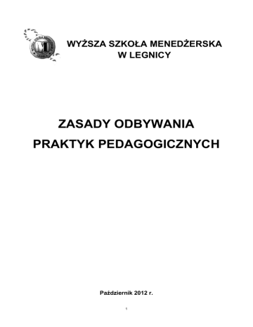 WYŻSZA SZKOŁA MENEDŻERSKA W LEGNICY ZASADY ODBYWANIA PRAKTYK PEDAGOGICZNYCH Październik 2012 r. 1 ZASADY ODBYWANIA PRAKTYK PEDAGOGICZNYCH W WYŻSZEJ SZKOLE MENEDŻERSKIEJ W LEGNICY Wydział Zarządzania i Marketingu Kierunek Pedagogika Studia Pierwszego Stopnia - niestacjonarne I. Postanowienia ogólne 1. Wydział Zarządzania i Marketingu (kierunek Pedagogika) organizuje w ramach programu kształcenia praktyki stanowiące integralną część studiów, działając na podstawie art. 166 ustawy z dnia 27 lipca 2005 r. Prawo o szkolnictwie wyższym, Rozporządzenia Ministra Nauki i Szkolnictwa Wyższego z dnia 4 listopada 2011 r. w sprawie wzorcowych efektów kształcenia, Rozporządzenia Ministra Nauki i Szkolnictwa Wyższego z dnia 17.01.2012 r. w sprawie standardów kształcenia przygotowującego do wykonywania zawodu nauczyciela oraz Regulaminu Studiów w Wyższej Szkole Menedżerskiej w Legnicy. 2. Studenci niestacjonarnych studiów pierwszego stopnia zobowiązani są do odbycia w trakcie studiów praktyki pedagogicznej w wymiarze nie krótszym niż 180 godzin. 3. Na realizację praktyk w ramach studiów licencjackich przewiduje się jako minimum 180 godzin zajęć dydaktycznych, przyjmując następujące przeliczenie: 1) Specjalność: Zintegrowana Edukacja Wczesnoszkolna i Przedszkolna, Pedagogika Opiekuńczo-Prewencyjna (rozpoczęcie studiów w roku akademickim 2010/2011, 2011/2012): a) praktyka pedagogiczna 4-tygodniowa w semestrze 5 (min. 90 godzin), b) praktyka pedagogiczna 4-tygodniowa w semestrze 6 (min. 90 godzin). 2) Specjalność: Zintegrowana Edukacja Wczesnoszkolna i Przedszkolna (rozpoczęcie studiów w roku akademickim 2012/2013 i później): a) praktyka pedagogiczna obserwacyjna w przedszkolu i szkole podstawowej w klasach I - III w semestrze 4 (min. 40 godzin – 2x20 godzin), b) praktyka pedagogiczna obserwacyjno – metodyczna w przedszkolu w semestrze 5 (min. 70 godzin), c) praktyka pedagogiczna obserwacyjno – metodyczna w szkole podstawowej w klasach I - III w semestrze 6 (min. 70 godzin). Praktyka obserwacyjna w placówce edukacji przedszkolnej i w szkole ma na celu zapoznanie studentów ze specyfiką funkcjonowania tego typu placówek, umożliwienie obserwacji zajęć prowadzonych przez doświadczonych nauczycieli, kształtowanie umiejętności analizy czynności dydaktycznych i opiekuńczo – wychowawczych nauczyciela prowadzącego zajęcia, wzbogacenie swojej wiedzy odnośnie metodyki nauczania poszczególnych treści wynikających z podstawy programowej, konfrontację ze zdobytą wiedzą z zakresu przedmiotów pedagogicznych, przygotowanie do dalszych etapów praktyki. 2 Praktyka obserwacyjno-metodyczna w placówce edukacji przedszkolnej i w szkole ma na celu przygotowanie studentów do przyszłej pracy dydaktyczno- wychowawczej i opiekuńczej poprzez obserwację połączoną z kształtowaniem umiejętności samodzielnego prowadzenia zajęć, praktycznego wykorzystywania wiedzy zdobytej podczas studiów do rozwiązywania/projektowania problemów/ działań zarówno w charakterze wychowawczo opiekuńczym, jak i dydaktycznym. 3) Specjalność: Pedagogika Opiekuńczo – Prewencyjna (rozpoczęcie studiów w roku akademickim 2012/2013 i później): a) praktyka pedagogiczna w semestrze 5 (min. 90 godzin), b) praktyka pedagogiczna w semestrze 6 (min. 90 godzin). II. Cele i program praktyk 1. Cele praktyk pedagogicznych: poszerzenie wiedzy zdobytej na studiach i rozwijanie umiejętności jej wykorzystania, poznanie organizacji pracy różnych typów szkół i placówek, a zwłaszcza tych, w których absolwenci mogą znaleźć zatrudnienie, nabycie umiejętności projektowania, prowadzenia i dokumentowania zajęć, nabycie umiejętności prowadzenia obserwacji zajęć i jej dokumentowania, nabycie umiejętności refleksyjnej analizy pracy nauczyciela i uczniów podczas wspólnego omawiania praktyk przez opiekunów praktyk i studentów, doskonalenie umiejętności diagnozowania i rozwiązywania problemów wychowawczych, nabycie umiejętności analizowania własnej pracy i jej efektów oraz pracy dzieci i uczniów. 2. Program praktyk pedagogicznych dla specjalności Zintegrowana Edukacja Wczesnoszkolna i Przedszkolna: Miejsce praktyk – Przedszkole. W ramach tej praktyki studenci: 1) zapoznają się z charakterem pracy w placówce edukacji przedszkolnej, jej strukturą organizacyjną i programową, 2) zapoznają się z podstawową dokumentacją prowadzoną w placówce, 3) poznają zadania i obowiązki nauczycieli zatrudnionych w placówce, 4) obserwują zajęcia edukacyjne prowadzone przez nauczyciela edukacji przedszkolnej, sporządzają notatki i omawiają je z zakładowym opiekunem praktyk, 5) poznają metody dydaktyczne i wychowawcze, które są wprowadzane przez nauczycieli wychowania przedszkolnego do realizacji treści wynikających z podstawy programowej, 6) towarzyszą nauczycielowi edukacji przedszkolnej w trakcie wykonywania przez niego różnego typu zajęć administracyjnych i organizacyjnych (wykonywanie pomocy dydaktycznych, uzupełnianie dziennika, kart obserwacji, przygotowanie zajęć dydaktycznych), 7) wykorzystują wiedzę zdobytą podczas studiów do projektowania wybranych fragmentów zajęć i całych zajęć, 3 8) samodzielnie prowadzą wybrane fragmenty zajęć i całe zajęcia (po wcześniejszym przygotowaniu scenariusza takich zajęć lub części zajęć i uzyskaniu akceptacji ze strony zakładowego opiekuna praktyk), omawiają z zakładowym opiekunem praktyk prowadzone przez siebie zajęcia, 9) uczestniczą (po uzyskaniu zgody dyrektora) w radach pedagogicznych, zebraniach, uroczystościach, które odbywają się na terenie placówki edukacji przedszkolnej, aktywnie włączają się w przygotowanie uroczystości. Miejsce praktyk – Szkołą Podstawowa klasy I – III. W ramach tej praktyki studenci: 1) zapoznają się z charakterem pracy w szkole podstawowej, jej strukturą organizacyjną i programową, 2) zapoznają się z podstaw
