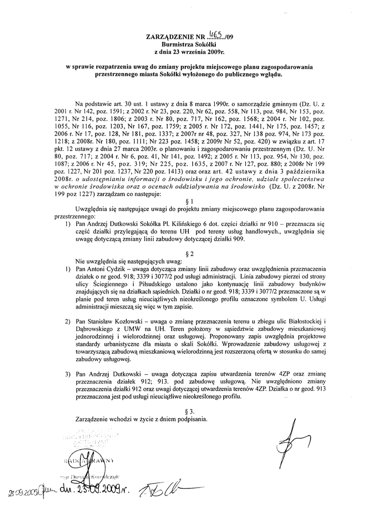 lile:,. ZARZĄDZENIE NR .... ~ ../09 Burmistrza Sokółki z dnia 23 września 2009r. w sprawie rozpatrzenia uwag do zmiany projektu miejscowego planu zagospodarowania przestrzennego miasta Sokółki wyłożonego do publicznego wglądu. Na podstawie art. 30 ust. l ustawy z dnia 8 marca 1990r. o samorządzie gminnym (Dz. U. z 2001 r. Nr 142, poz. 1591; z 2002 r. Nr 23, poz. 220, Nr 62, poz. 558, Nr 113, poz. 984, Nr 153, poz. 1271, Nr 214, poz. 1806; z 2003 r. Nr 80, poz. 717, Nr 162, poz. 1568; z 2004 r. Nr 102, poz. 1055, Nr 116, poz. 1203, Nr 167, poz. 1759; z 2005 r. Nr 172, poz. 1441, Nr 175, poz. 1457; z 2006 r. Nr 17, poz. 128, Nr 181, poz. 1337; z 2007r nr 48, poz. 327, Nr 138 poz. 974, Nr 173 poz. 1218; z 2008r. Nr 180, poz. 1111; Nr 223 poz. 1458; z 2009r Nr 52, poz. 420) w związku z art. 17 pkt. 12 ustawy z dnia 27 marca 2003r. o planowaniu i zagospodarowaniu przestrzennym (Dz. U. Nr 80, poz. 717; z 2004 r. Nr 6, poz. 41, Nr 141, poz. 1492; z 2005 r. Nr 113, poz. 954, Nr 130, poz. 1087; z 2006 r. Nr 45, poz. 319; Nr 225, poz. 1635, z 2007 r. Nr 127, poz. 880; z2008rNr 199 poz. 1227, Nr 201 poz. 1237, Nr 220 poz. 1413) oraz oraz art. 42 ustawy z dnia 3 października 2008r. o udostępnianiu informacji o środowisku i jego ochronie, udziale społeczeństwa w ochronie środowiska oraz o ocenach oddziaływania na środowisko (Dz. U. z 2008r. Nr 199 poz 1227) zarządzam co następuje: §l Uwzględnia się następujące uwagi do projektu zmiany miejscowego planu zagospodarowania przestrzennego: l) Pan Andrzej Dutkowski Sokółka Pl. Kilińskiego 6 dot. części działki nr 910 - przeznacza się część działki przylegającą do terenu UH pod tereny usług handlowych., uwzględnia się uwagę dotyczącą zmiany linii zabudowy dotyczącej działki 909. Nie uwzględnia się następujących uwag: I) Pan Antoni Cydzik - uwaga dotycząca zmiany linii zabudowy oraz uwzględnienia przeznaczenia działek o nr geod. 918; 3339 i 3077/2 pod usługi administracji. Linia zabudowy pierzei od strony ulicy Ściegiennego i Piłsudskiego ustalono jako kontynuację linii zabudowy budynków znajdujących się na działkach sąsiednich. Działki o nr geod. 918; 3339 i 3077/2 przeznaczone są w planie pod teren usług nieuciążliwych nieokreślonego profilu oznaczone symbolem U. Usługi administracji mieszczą się więc w tym zapisie. 2) Pan Stanisław Kozłowski - uwaga o zmianę przeznaczenia terenu u zbiegu ulic Białostockiej i Dąbrowskiego z UMW na UH. Teren położony w sąsiedztwie zabudowy mieszkaniowej jednorodzinnej i wielorodzinnej oraz usługowej. Proponowany zapis uwzględnia projektowe standardy urbanistyczne dla miasta o skali Sokółki. Wprowadzenie zabudowy usługowej z towarzyszącą zabudową mieszkaniową wielorodzinnąjest rozszerzoną ofertą w stosunku do samej zabudowy usługowej. 3) Pan Andrzej Dutkowski - uwaga dotycząca zapisu utwardzenia terenów 4ZP oraz zmianę przeznaczenia działek 912; 913. pod zabudowę usługową. Nie uwzględniono zmiany przeznaczenia działki 912 oraz uwagi dotyczącej utwardzenia terenów 4ZP. Działka o nr geod. 913 przeznaczona jest pod usługi nieuciążliwe nieokreślonego profilu. § 3. Zarządzenie wchodzi w życie z dniem podpisania.