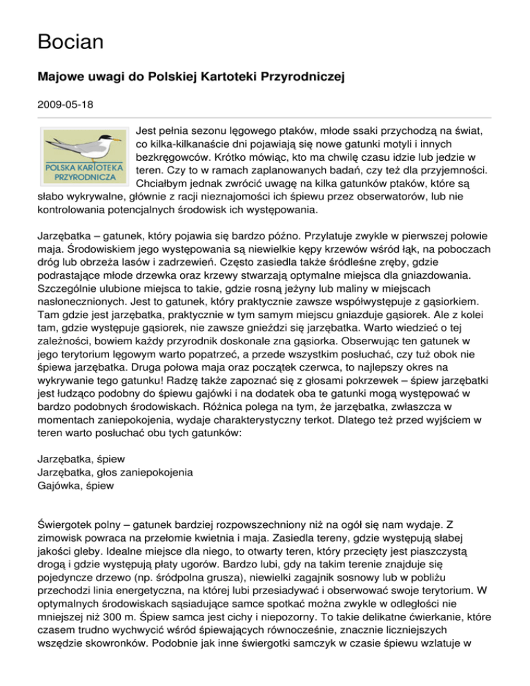 Bocian Majowe uwagi do Polskiej Kartoteki Przyrodniczej 2009-05-18 Jest pełnia sezonu lęgowego ptaków, młode ssaki przychodzą na świat, co kilka-kilkanaście dni pojawiają się nowe gatunki motyli i innych bezkręgowców. Krótko mówiąc, kto ma chwilę czasu idzie lub jedzie w teren. Czy to w ramach zaplanowanych badań, czy też dla przyjemności. Chciałbym jednak zwrócić uwagę na kilka gatunków ptaków, które są słabo wykrywalne, głównie z racji nieznajomości ich śpiewu przez obserwatorów, lub nie kontrolowania potencjalnych środowisk ich występowania. Jarzębatka – gatunek, który pojawia się bardzo późno. Przylatuje zwykle w pierwszej połowie maja. Środowiskiem jego występowania są niewielkie kępy krzewów wśród łąk, na poboczach dróg lub obrzeża lasów i zadrzewień. Często zasiedla także śródleśne zręby, gdzie podrastające młode drzewka oraz krzewy stwarzają optymalne miejsca dla gniazdowania. Szczególnie ulubione miejsca to takie, gdzie rosną jeżyny lub maliny w miejscach nasłonecznionych. Jest to gatunek, który praktycznie zawsze współwystępuje z gąsiorkiem. Tam gdzie jest jarzębatka, praktycznie w tym samym miejscu gniazduje gąsiorek. Ale z kolei tam, gdzie występuje gąsiorek, nie zawsze gnieździ się jarzębatka. Warto wiedzieć o tej zależności, bowiem każdy przyrodnik doskonale zna gąsiorka. Obserwując ten gatunek w jego terytorium lęgowym warto popatrzeć, a przede wszystkim posłuchać, czy tuż obok nie śpiewa jarzębatka. Druga połowa maja oraz początek czerwca, to najlepszy okres na wykrywanie tego gatunku! Radzę także zapoznać się z głosami pokrzewek – śpiew jarzębatki jest łudząco podobny do śpiewu gajówki i na dodatek oba te gatunki mogą występować w bardzo podobnych środowiskach. Różnica polega na tym, że jarzębatka, zwłaszcza w momentach zaniepokojenia, wydaje charakterystyczny terkot. Dlatego też przed wyjściem w teren warto posłuchać obu tych gatunków: Jarzębatka, śpiew Jarzębatka, głos zaniepokojenia Gajówka, śpiew Świergotek polny – gatunek bardziej rozpowszechniony niż na ogół się nam wydaje. Z zimowisk powraca na przełomie kwietnia i maja. Zasiedla tereny, gdzie występują słabej jakości gleby. Idealne miejsce dla niego, to otwarty teren, który przecięty jest piaszczystą drogą i gdzie występują płaty ugorów. Bardzo lubi, gdy na takim terenie znajduje się pojedyncze drzewo (np. śródpolna grusza), niewielki zagajnik sosnowy lub w pobliżu przechodzi linia energetyczna, na której lubi przesiadywać i obserwować swoje terytorium. W optymalnych środowiskach sąsiadujące samce spotkać można zwykle w odległości nie mniejszej niż 300 m. Śpiew samca jest cichy i niepozorny. To takie delikatne ćwierkanie, które czasem trudno wychwycić wśród śpiewających równocześnie, znacznie liczniejszych wszędzie skowronków. Podobnie jak inne świergotki samczyk w czasie śpiewu wzlatuje w powietrze a następnie opada – siada na ziemi lub na ulubione miejsce, jakim jest wierzchołek pojedynczego drzewa, skraj zagajnika sosnowego czy też słup linii energetycznej. Dlatego też zalecam uważne przeglądanie linii energetycznych, na których często ptaki te siadają. Aktywność głosowa świergotka jest największa we wczesnych godzinach rannych (4.00 – 7.00). Później również można go usłyszeć, nawet w samo południe, ale trzeba w odpowiednim miejscu przez chwilę się „pokręcić”. Świergotek polny, śpiew Na koniec chciałbym dodać, że oba wyżej opisane gatunki, jak również i gąsiorek, są zagrożone w Unii Europejskiej i znajdują się w I Załączniku Dyrektywy Ptasiej. Mirosław Rzępała