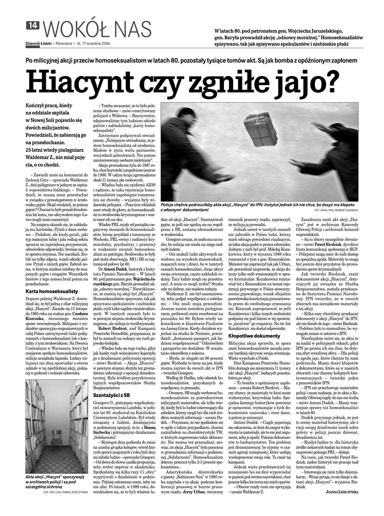 14 WOKÓŁ NAS Dziennik Łódzki đ Panorama đ 16, 17 września 2006 W latach 80. pod patronatem gen. Wojciecha Jaruzelskiego, gen. Baryła prowadził akcję „odnowy moralnej.” Homoseksualistów spisywano, tak jak spisywano spekulantów i niebieskie ptaki Po milicyjnej akcji przeciw homoseksualistom w latach 80. pozostały tysiące tomów akt. Są jak bomba z opóźnionym zapłonem Hiacynt czy zgniłe jajo? Kończył pracę, kiedy na oddziale szpitala w Nowej Soli pojawiło się dwóch milicjantów. Powiedzieli, że zabierają go na przesłuchanie. 25-letni wtedy pielęgniarz Waldemar Z., nie miał pojęcia, o co chodzi. – Zawieźli mnie na komisariat do Zielonej Góry – opowiada Waldemar Z., dziś pielęgniarz w jednym ze szpitali województwa łódzkiego. – Powiedzieli, że muszą mnie przesłuchać w związku z przestępstwem w środowisku gejów. Skąd wiedzieli, że jestem gejem? Chociaż to było ponad dwadzieścia lat temu, nie ukrywałem tego. Łatwo mogli mnie namierzyć. Na miejscu okazało się, że zakładają mu kartotekę. Pytali o dane osobowe. – Podałem, ale kiedy pytali, jaki typ mężczyzn lubię i jaki rodzaj seksu sprawia mi największą przyjemność, odmówiłem odpowiedzi, broniąc się, że to sprawa intymna. Nie naciskali. Zrobili mi tylko zdjęcia, wzięli odciski palców. Pytali o innych gejów. Zabrali notes, w którym miałem telefony do znajomych: gejów i niegejów. Wszystkich facetów z tego notesu brali potem na przesłuchanie. Karta homoseksualisty Dopiero później Waldemar Z. dowiedział się, że był jedną z ofiar milicyjnej akcji „Hiacynt”. Zaczęła się 15 listopada 1985 roku na rozkaz gen. Czesława Kiszczaka, ówczesnego ministra spraw wewnętrznych. Milicjanci z wydziałów operacyjno-rozpoznawczych w całej Polsce zatrzymywali ludzi podejrzanych o homoseksualizm lub o kontakty z tym środowiskiem. Na Dworcu Centralnym w Warszawie, który był miejscem spotkań homoseksualistów, milicja urządzała łapanki. Łódzcy milicjanci nie chcą opowiadać o swoim udziale w tej niechlubnej akcji, godzącej w godność i wolność człowieka. – Trzeba zrozumieć, że to było polecenie służbowe – mówi emerytowany policjant z Widzewa. – Rzeczywiście, zdejmowaliśmy tym ludziom odciski palców i zakładaliśmy „karty homoseksuaslisty”. Zatrzymani podpisywali oświadczenie: „Niniejszym oświadczam, że jestem homoseksualistą od urodzenia. Miałem w życiu wielu partnerów, wszystkich pełnoletnich. Nie jestem zainteresowany osobami nieletnimi“. Akcja prowadzona była do 1987 roku, choć kartoteki uzupełniano jeszcze do 1988. W całym kraju zgromadzono około 11 tysięcy akt osobowych. – Władza bała się epidemii AIDS i sądzono, że taka rejestracja homoseksualistów zapobiegnie rozszerzaniu się choroby – wyjaśnia były widzewski policjant. – Poza tym wkładali nam wtedy do głowy, że homoseksualiści to środowisko kryminogenne i warto mieć ich na oku. Władze PRL miały od początku negatywny stosunek do homoseksualistów, biorąc przykład z towarzyszy ze Wschodu. PRL-owscy i radzieccy kryminolodzy, psychiatrzy i prawnicy w większości uważali homoseksualizm za patologię. Środowiska te były pod stałą obserwacją MO i SB co najmniej od połowy lat 60. Dr Antoni Dudek, historyk z Instytutu Pamięci Narodowej: – W latach 80. pod patronatem gen. Wojciecha Jaruzelskiego gen. Baryła prowadził akcję „odnowy moralnej.” Niewykluczone, że częścią tej akcji był „Hiacynt”. Homoseksualistów spisywano, tak jak spisywano spekulantów i niebieskie ptaki, czyli ludzi nigdzie niezatrudnionych. W tamtych czasach było to w pewnym stopniu środowisko kryminogenne, ale milicja to wyolbrzymiała. Robert Biedroń, szef Kampanii Przeciwko Homofobii, przypuszcza, że był to zamach na rodzący się ruch gejowsko-lesbijski. – Władza bała się tego ruchu, gdyż jak każdy ruch wolnościowy kojarzyła go z działaniami politycznej opozycji – mówi Biedroń. – Akcja „Hiacynt” w pewnym stopniu służyła też gromadzeniu informacji o opozycji demokratycznej. Była źródłem pozyskiwania tajnych współpracowników Służby Bezpieczeństwa. Szantażyści z SB Akta akcji „Hiacynt” spoczywają w archiwach policji i są pod szczególną ochroną FOT. PAP/CAF/PAWEŁ KOPCZYŃSKI Grzegorz O., późniejszy współzałożyciel stowarzyszenia Lambda, w połowie lat 80. studiował na Katolickim Uniwersytecie Lubelskim. Był wtedy związany z ludźmi, działającymi w podziemnej opozycji, m.in. z Hanną Suchocką i późniejszymi działaczami „Solidarności”. – Któregoś dnia podeszła do mnie na uczelni grupka kolegów, wśród których oprócz znajomych z roku byli obcy mi młodzi ludzie – opowiada Grzegorz. – Od słowa do słowa i padła propozycja, żeby zrobić imprezę w akademiku. Spotkaliśmy się kilka razy. Ci „obcy” wypytywali o działalność w podziemiu. Później ostrzeżono mnie, żeby im nie ufać. Po latach, w 1989 roku, dowiedziałem się, że to byli właśnie lu- Policja chętnie podrzuciłaby akta akcji „Hiacynt” do IPN. Instytut jednak ich nie chce, bo dosyć ma kłopotu z własnymi dokumentami FOT. PAPA/EPA/ROBERT GHEMENT dzie od akcji „Hiacynt”. Szantażowali gejów, że jeśli nie zgodzą się na współpracę z SB, zostaną zdemaskowani w środowisku. Grzegorz uważa, że uszło mu na sucho, bo milicja nie miała na niego żadnych haków. – Oni szukali ludzi aktywnych zawodowo, na wysokich stanowiskach, mających żony i dzieci, bo w tamtych czasach homoseksualiści, chcąc ukryć swoją orientację, często zakładali rodziny. Tacy ludzie mogli się przestraszyć. A mnie co mogli zrobić? Studia szły mi dobrze, nie miałem rodziny. Waldemar Z. nie był szantażowany, żeby podjął współpracę z esbekami: – Oni znali moją przeszłość. Jeszcze zanim zostałem pielęgniarzem, próbowali mnie zwerbować na początku lat 80. Byłem wtedy zakonnik