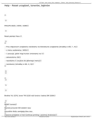 AZ Trade - toner, tonery, folie, urządzenia :: Żoliborz - Wola, Warszawa, Okopowa 47 Help - Reset urządzeń, tonerów, bębnów PHILIPS 6020 / 6050 / 6080 Reset pamięci faxu: - Przy włączonym urządzeniu naciskamy na klawiaturze urządzenia (strzałkę w dół, *, #) - z menu wybieramy: SOS1 - 1 pozycja, gdzie miga kursor zmieniamy na 1 - zatwierdzmy OK - naciskamy C (wyjście do głównego menu) - naciskamy (strzałkę w dół, #, 8) Brother HL-2270, toner TN-2220 rest tonera i bebna DR-2200 RESET tonera Nacisnij przycisk GO siedem razy wszystkie diody zamigają dwa razy maszyna przejdzie w tryb Continue printing i powinna drukowac http://www.aztrade.pl Powered by Joomla! Wygenerowano: 8 March, 2017, 06:38 AZ Trade - toner, tonery, folie, urządzenia :: Żoliborz - Wola, Warszawa, Okopowa 47 RESET bębna po wlozeniu tonera wraz z bebnem przy otwartej pokrywie naciśnij i przytrzymaj GO przez 4 sekundy, az wszystkie diody sie zaswieca, gdy wszystkie się zaswieca, puszczamy przycisk GO, zamykamy pokrywe DCP-7055 reset bębna Put the new drum unit and toner cartridge assembly in the machine. Press Clear to reset the drum counter before closing the front cover. For models with FAX functions: To confirm you are installing a new drum unit, press 1. For models without FAX functions: To confirm you are installing a new drum unit, press the Up Arrow Key. When the LCD shows Accepted, close the front cover. Reset tonera w Brother DCP - 7055 , 7057 , 7060 , 7065 , 7070 http://www.aztrade.pl Powered by Joomla! Wygenerowano: 8 March, 2017, 06:38 AZ Trade - toner, tonery, folie, urządzenia :: Żoliborz - Wola, Warszawa, Okopowa 47 Reset tonera TN-2220 w MFC 7360 / 7460 / 7860 Reset bębna DR-2200 w MFC 7360 / 7460 / 7860 - Make sure that the machine is turned on. - Open the front cover. - Press Clear or Clear/Back on the control panel. NOTE: The layout of a control panel differs depending on the model, but the Clear or Clear/Back button is located on the right side of the LCD screen as shown in illustration. - Do one of the following. - If your Brother machine has a numeric keypad: Press 1 to reset the drum counter. - If your Brother machine doesn't have a numeric keypad: Press the Up Arrow Key to reset the drum counter. - When the LCD shows Accepted, close the front cover. http://www.aztrade.pl Powered by Joomla! Wygenerowano: 8 March, 2017, 06:38 AZ Trade - toner, tonery, folie, urządzenia :: Żoliborz - Wola, Warszawa, Okopowa 47 Aby zresetować bęben DR-3100 w Brother 8460 / 8860 należy: - Przy włączonym urządzeniu. - Otworzyć przednia klapę - Wyciągnąć bęben z tonerem - Włożyć z powrotem, ale nie zamykając klapy - nacisnąć przycisk Clear/Back - na wyświetlaczu pojawi się napis: Replace Drum?" - wybieramy Yes http://www.aztrade.pl Powered by Joomla! Wygenerowano: 8 March, 2017, 06:38 AZ Trade - toner, tonery, folie, urządzenia :: Żoliborz - Wola, Warszawa, Okopowa 47 Brother DCP-7030 drum reset Zamontuj nowy zespół bębna i wkładu tonera do urządzenia. przy otwartej klapie Naciśnij Clear/Back (Wyczyść/Cofnij). Dla urządzeń MFC: Aby potwierdzić instalację nowego bębna, wciśnij 1. Dla urządzeń DCP: Aby potwierdzić instalację nowego bębna, wciśnij strzałkę Up (Góra). Gdy wyświetlacz LCD pokaże AKCEPTACJA, zamknij pokrywę przednią. http://www.aztrade.pl Powered by Joomla! Wygenerowano: 8 March, 2017, 06:38 AZ Trade - toner, tonery, folie, urządzenia :: Żoliborz - Wola, Warszawa, Okopowa 47 Drum reset brother 7010 Opis ze strony firmy BROTHER Dlaczego komunikat "CHANGE DRUM " w dalszym ciągu pojawiają się na wyświetlaczu LCD mojej maszyny Brother, po tym jak otrzymuje nowy bęben? Opis Ten komunikat będzie nadal wyświetlany, jeżeli licznik bębna nie będzie zresetowany. Aby wyzerować licznik bębna, postępuj zgodnie z instrukcjami poniżej. 1. Otwórz przednią pokrywę. 2. Naciśnij (przytrzymaj) klawisz Opcje na panelu sterowania. Na wyświetlaczu pojawi się "REPLACE DRUM - 1.YES 2.NO". 3. Naciśnij 1, aby zresetować bęben. 4. Zamknij przednią pokrywę. http://www.aztrade.pl Powered by Joomla! Wygenerowano: 8 March, 2017, 06:38 AZ Trade - toner, tonery, folie, urządzenia :: Żoliborz - Wola, Warszawa, Okopowa 47 Brother MFC-7840, reset bębna DR-2100 - Make sure that the machine is turned on. - Open the front cover. - Press Clear or Clear/Back on the control panel. NOTE: The layout of a control panel differs depending on the model, but the Clear or Clear/Back button is located on the right side of the LCD screen as shown in illustration. - Do one of the following. - If your Brother machine has a numeric keypad: Press 1 to reset the drum counter. - If your Brother machine doesn't have a numeric keypad: Press the Up Arrow Key to reset the drum counter. - When the LCD shows Accepted, close the front cover. http://www.aztrade.pl Powered by Joomla! Wygenerowano: 8 March, 2017, 06:38 AZ Trade - toner, tonery, folie, urządzenia :: Żoliborz - Wola, Warszawa, Okopowa 47 Brother HL 2140 reset drum if it's a drum life error then you either need to replace it and/or reset the counter. to reset the drum counter, open the fron cover, hold down the start button until all lights lit up. then release the button and shut the front cover. Brother MFC-9840 MFC-9440 Toner Reset (TN-135) 1. With power on, open the toner access main door. You will get a “Cover is Open” message on the LCD. 2. Press the “Clear/Back” button and you will be taken to the toner “Reset Menu” http://www.aztrade.pl Powered by Joomla! Wygenerowano: 8 March, 2017, 06:38 AZ Trade - toner, tonery, folie, urządzenia :: Żoliborz - Wola, Warszawa, Okopowa 47 3. You can then scroll through the reset options for the printer’s toner cartridges: 1. B.TNR-S – Black toner small cartridge (TN-110) 2. B.TNR-H – Black toner high-capacity cartridge (TN-115) 3. C.TNR-S – Cyan toner small cartridge (TN-110) 4. C.TNR-H – Cyan toner high-capacity cartridge (TN-115) 5. M.T
