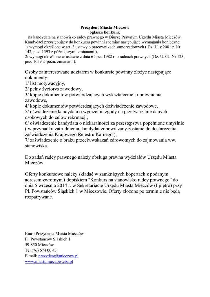 Prezydent Miasta Mieczów ogłasza konkurs: na kandydata na stanowisko radcy prawnego w Biurze Prawnym Urzędu Miasta Mieczów. Kandydaci przystępujący do konkursu powinni spełniać następujące wymagania konieczne: 1/ wymogi określone w art. 3 ustawy o pracownikach samorządowych ( Dz. U. z 2001 r. Nr 142, poz. 1593 z późniejszymi zmianami ), 2/ wymogi określone w ustawie z dnia 6 lipca 1982 r. o radcach prawnych (Dz. U. 02. Nr 123, poz. 1059 z późn. zmianami). Osoby zainteresowane udziałem w konkursie powinny złożyć następujące dokumenty: 1/ list motywacyjny, 2/ pełny życiorys zawodowy, 3/ kopie dokumentów potwierdzających wykształcenie i uprawnienia zawodowe, 4/ kopie dokumentów potwierdzających doświadczenie zawodowe, 5/ oświadczenie kandydata o wyrażeniu zgody na przetwarzanie danych osobowych do celów rekrutacji, 6/ oświadczenie kandydata o niekaralności za przestępstwa popełnione umyślnie ( w przypadku zatrudnienia, kandydat zobowiązany zostanie do dostarczenia zaświadczenia Krajowego Rejestru Karnego ), 7/ zaświadczenie o braku przeciwwskazań zdrowotnych do zajmowania ww. stanowiska. Do zadań radcy prawnego należy obsługa prawna wydziałów Urzędu Miasta Mieczów. Oferty konkursowe należy składać w zamkniętych kopertach z podanym adresem zwrotnym i dopiskiem "Konkurs na stanowisko radcy prawnego” do dnia 5 września 2014 r. w Sekretariacie Urzędu Miasta Mieczów (I piętro) przy Pl. Powstańców Śląskich 1 w Mieczowie. Oferty złożone po terminie nie będą rozpatrywane. Biuro Prezydenta Miasta Mieczów Pl. Powstańców Śląskich 1 59-850 Mieczów Tel.(76) 674 00 43 E mail: [email protected] www.miastomieczow.cba.pl