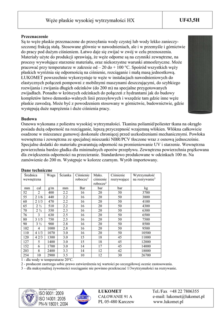 Węże płaskie wysokiej wytrzymałości HX UF43,5H Przeznaczenie Są to węże płaskie przeznaczone do przesyłania wody czystej lub wody lekko zanieczyszczonej frakcją stałą. Stosowane głównie w nawodnieniach, ale i w przemyśle i górnictwie do pracy pod dużym ciśnieniem. Łatwo daje się zwijać w zwój w celu przenoszenia. Materiały użyte do produkcji sprawiają, że węże odporne są na czynniki zewnętrzne, na procesy wywołujące starzenie materiału, oraz niekorzystne warunki atmosferyczne. Może pracować przy temperaturze w zakresie od – 20 do + 100 °C. Spośród wszystkich węży płaskich wyróżnia się odpornością na ciśnienie, rozciąganie i małą masą jednostkową. ŁUKOMET powszechnie wykorzystuje te węże w instalacjach nawodnieniowych do elastycznych połączeń pompowni z mobilnymi maszynami deszczującymi, do szybkiego rozwijania i zwijania długich odcinków (do 200 m) na specjalne przygotowanych zwijadłach. Ponadto w krótszych odcinkach do połączeń z hydrantami jak do budowy kompletów łatwo demonko-walnych linii przesyłowych i wszędzie tam gdzie inne węże płaskie zawodzą. Może być z powodzeniem stosowany w górnictwie, budownictwie, gdzie występują duże naprężenia i duże ciśnienia pracy. Budowa Osnowa wykonana z poliestru wysokiej wytrzymałości. Tkanina poliamid/poliester tkana na okrągło posiada dużą odporność na rozciąganie, lepszą przyczepność wzajemną włókien. Włókna całkowicie osadzone w mieszance gumowej doskonale chroniącej przed uszkodzeniami mechanicznymi. Powłoka wewnętrzna i zewnętrzna ze specjalnej mieszanki NBR/PCV tłoczone wraz z osnową jednocześnie. Specjalne dodatki do materiału gwarantują odporność na promieniowanie UV i starzenie. Wewnętrzna powierzchnia bardzo gładka dla minimalnych oporów przepływu. Zewnętrzna powierzchnia prążkowana dla zwiększenia odporności na przecieranie. Standardowo produkowane w odcinkach 100 m. Na zamówienie do 200 m. Występuje w kolorze czarnym. Wyrób importowany. Dane techniczne Średnica wewnętrzna Waga Ścianka Ciśnienie robocze1 Maks. ciśnienie robocze2 bar 20 20 20 20 20 20 20 20 20 20 18 18 17 12 12 Ciśnienie rozrywające Wytrzymałość na rozrywanie3 mm cal g/m mm Bar bar kg 52 2 400 2.2 16 50 3700 55 2 1/6 440 2.2 16 50 3800 60 2 1/3 470 2.2 16 50 4100 65 2½ 510 2.2 16 50 4300 70 2¾ 550 2.3 16 50 6300 76 3 630 2.5 16 50 6500 80 3 1/5 750 2.5 16 50 7500 90 3½ 900 2.8 16 50 8500 102 4 1000 2.8 16 50 9500 110 4 1/3 1070 3.0 16 50 10500 120 4 2/3 1300 3.0 15 45 11000 127 5 1400 3.0 15 45 12000 152 6 1700 3.0 14 45 14000 203 8 2400 3.3 14 42 18000 254 10 2900 3.5 10 30 26700 1 - dla wody w temperaturze 20°C. 2 - producent zastrzega sobie prawo zatwierdzenia tej wartości po szczegółowej ocenie zastosowania. 3 – dla maksymalnej żywotności rozciąganie nie powinno przekraczać 1/3wytrzymałości na rozrywanie. ŁUKOMET CAŁOWANIE 91 A PL 05-480 Karczew Tel./Fax +48 22 7806355 e-mail: [email protected] www.lukomet.pl