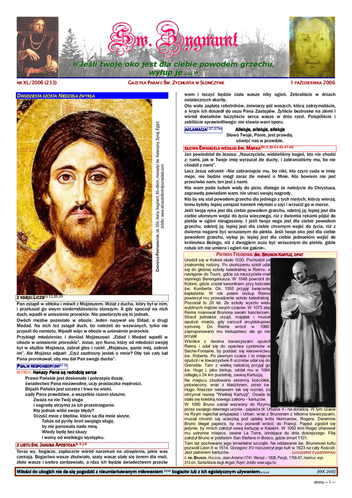 Sw. Zygmunt «Jeśli twoje oko jest dla ciebie powodem grzechu, wyłup je …» NR XL/2006 (23 (233) GAZETKA PARAFII ŚW. ZYGMUNTA W SŁOMCZYNIE CHRYSTUS PANTOKRATOR , ok. 550, ikona, fragment, 85×45cm, monastyr św. Katarzyny, Synaj, Egipt; źródło: www.shroudofturin4journalists.com DWUDZIESTA SZÓSTA NIEDZIELA ZWYKŁA Z KSIĘGI LICZBLb 11,25-29 Pan zstąpił w obłoku i mówił z Mojżeszem. Wziął z ducha, który był w nim, i przekazał go owym siedemdziesięciu starszym. A gdy spoczął na nich duch, wpadli w uniesienie prorockie. Nie powtórzyło się to jednak. Dwóch mężów pozostało w obozie. Jeden nazywał się Eldad, a drugi Medad. Na nich też zstąpił duch, bo należeli do wezwanych, tylko nie przyszli do namiotu. Wpadli więc w obozie w uniesienie prorockie. Przybiegł młodzieniec i doniósł Mojżeszowi: „Eldad i Medad wpadli w obozie w uniesienie prorockie”. Jozue, syn Nuna, który od młodości swojej był w służbie Mojżesza, zabrał głos i rzekł: „Mojżeszu, panie mój, zabroń im”. Ale Mojżesz odparł: „Czyż zazdrosny jesteś o mnie? Oby tak cały lud Pana prorokował, oby mu dał Pan swego ducha”. P SALM RESPONSORYJNYPs 19 REFREN: Nakazy Pana są radością serca Prawo Pańskie jest doskonałe i pokrzepia duszę, świadectwo Pana niezawodne, uczy prostaczka mądrości. Bojaźń Pańska jest szczera i trwa na wieki, sądy Pana prawdziwe, a wszystkie razem słuszne. Zważa na nie Twój sługa i nagrodę otrzyma za ich przestrzeganie. Kto jednak widzi swoje błędy? Oczyść mnie z błędów, które są dla mnie skryte. Także od pychy broń swojego sługę, by nie panowała nade mną. Wtedy będę bez skazy i wolny od wielkiego występku. Z LISTU ŚW. JAKUBA APOSTOŁAJk 5,1-6 Teraz wy, bogacze, zapłaczcie wśród narzekań na utrapienia, jakie was czekają. Bogactwo wasze zbutwiało, szaty wasze stały się żerem dla moli, złoto wasze i srebro zardzewiało, a rdza ich będzie świadectwem przeciw 1 PAŹDZIERNIKA 2006 wam i toczyć będzie ciała wasze niby ogień. Zebraliście w dniach ostatecznych skarby. Oto woła zapłata robotników, żniwiarzy pól waszych, którą zatrzymaliście, a krzyk ich doszedł do uszu Pana Zastępów. Żyliście beztrosko na ziemi i wśród dostatków tuczyliście serca wasze w dniu rzezi. Potępiliście i zabiliście sprawiedliwego: nie stawia wam oporu. AKLAMACJAJ 17,17ba Alleluja, alleluja, alleluja Słowo Twoje, Panie, jest prawdą, uświęć nas w prawdzie. SŁOWA EWANGELII WEDŁUG ŚW. MARKAMk 9,38-43.45.47-48 Jan powiedział do Jezusa: „Nauczycielu, widzieliśmy kogoś, kto nie chodzi z: nami, jak w Twoje imię wyrzucał złe duchy, i zabranialiśmy mu, bo nie chodził z nami”. Lecz Jezus odrzekł: «Nie zabraniajcie mu, bo nikt, kto czyni cuda w imię moje, nie będzie mógł zaraz źle mówić o Mnie. Kto bowiem nie jest przeciwko nam, ten jest z nami. Kto wam poda kubek wody do picia, dlatego że należycie do Chrystusa, zaprawdę powiadam wam, nie utraci swojej nagrody. Kto by się stał powodem grzechu dla jednego z tych małych, którzy wierzą, temu byłoby lepiej uwiązać kamień młyński u szyi i wrzucić go w morze. Jeśli twoja ręka jest dla ciebie powodem grzechu, odetnij ją; lepiej jest dla ciebie ułomnym wejść do życia wiecznego, niż z dwiemia rękami pójść do piekła w ogień nieugaszony. I jeśli twoja noga jest dla ciebie powodem grzechu, odetnij ją; lepiej jest dla ciebie chromym wejść do życia, niż z dwiema nogami być wrzuconym do piekła. Jeśli twoje oko jest dla ciebie powodem grzechu, wyłup je; lepiej jest dla ciebie jednookim wejść do królestwa Bożego, niż z dwojgiem oczu być wrzuconym do piekła, gdzie robak ich nie umiera i ogień nie gaśnie». PATRON TYGODNIA: ŚW. BRUNON KARTUZ, OPAT Urodził się w Kolonii około 1030. Pochodził ze znakomitej rodziny. Po ukończeniu szkół udał się do głośnej szkoły katedralnej w Reims, a następnie do Tours, gdzie za nauczyciela miał słynnego Berengariusza. W 1048 powrócił do Kolonii, gdzie został kanonikiem przy kościele św. Kuniberta. Ok. 1055 przyjął święcenia kapłańskie. W rok potem biskup Reims powierzył mu prowadzenie szkoły katedralnej. Pozostał tu 20 lat. Ze szkoły wyszło wielu wybitnych mężów owych czasów. W 1075 abp Reims mianował Brunona swoim kanclerzem. Stracił jednakże urząd, majątek i musiał opuścić miasto, gdy zarzucił arcybiskupowi symonię. Do Reims wrócił w 1080: zaproponowano mu biskupstwo; ale go nie przyjął. Wkrótce z dwoma towarzyszami opuścił Reims i udał się do opactwa cystersów w Seche-Fontaine, by poddać się kierownictwu św. Roberta. Po pewnym czasie i to miejsce opuścił i w towarzystwie 8 uczniów udał się do Grenoble. Tam z wielką radością przyjął go św. Hugo i, jako biskup, oddał mu w 1084 odległą o 24 km pustelnię, zwaną Kartuzją. Na miejscu zbudowano skromny kościółek, poświęcony, wraz z klasztorem, przez św. Hugo. Klasztor niebawem tak się rozrósł, że otrzymał nazwę "Wielkiej Kartuzji". Osada ta stała się kolebką nowego zakonu - kartuzów. W 1090 Bruno został wezwany do Rzymu przez swojego dawnego ucznia - papieża bł. Urbana II - na doradcę. W tym czasie na Rzym najechał antypapież i Urban, wraz z Brunonem z kilkoma towarzyszami, musiał chronić się ucieczką pod opiekę króla Normanów, Rogera. Daremnie Bruno błagał papieża, by mu pozwolił wrócić do Francji. Papież zgodził się jedynie, by mnich założył nową kartuzję w Kalabrii. W 1092 król Roger ofiarował mu ustronne miejsce, zwane La Torre, istniejące do dnia dzisiejszego. Filię założył Bruno w pobliskim San Stefano in Bosco, gdzie zmarł 1101. Tam też pochowano jego śmiertelne szczątki. Na oddawanie św. Brunonowi kultu pozwolił Leon X w 1514. Grzegorz XV rozszerzył jego kult w 1623 na cały Kościół. Jest patronem kartuzów. (uroczystość 6 października) il. ŚW . BRUNON , HOUDON , Jean-Antoine (1741, Wer