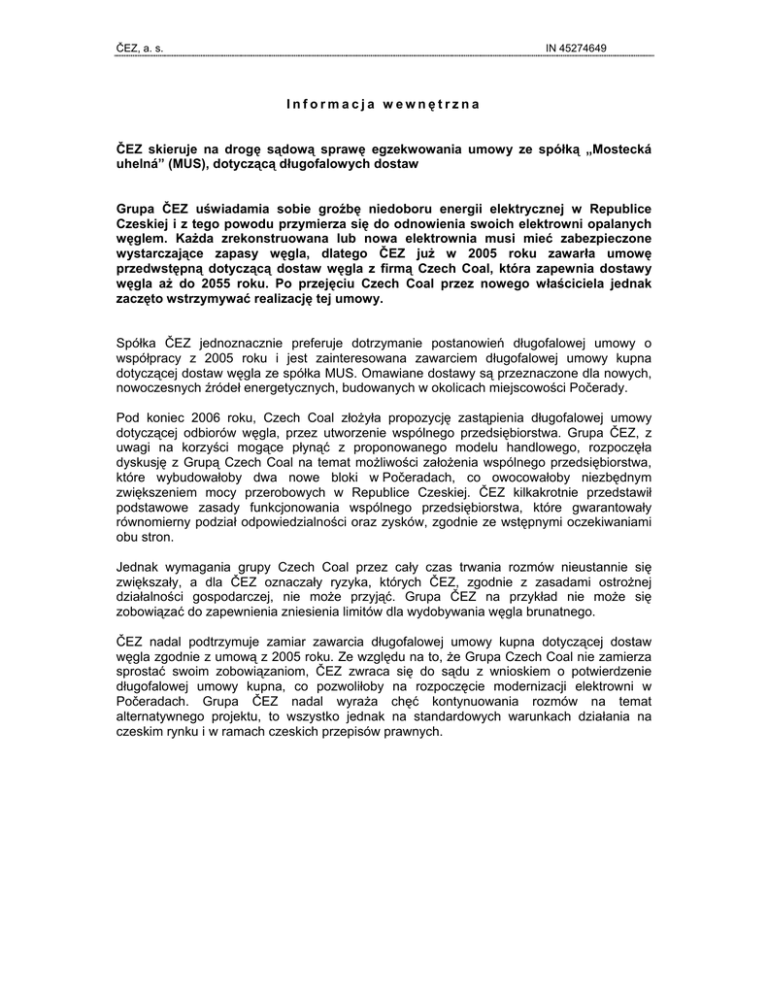 ČEZ, a. s. IN 45274649 Informacja wewnętrzna ČEZ skieruje na drogę sądową sprawę egzekwowania umowy ze spółką „Mostecká uhelná” (MUS), dotyczącą długofalowych dostaw Grupa ČEZ uświadamia sobie groźbę niedoboru energii elektrycznej w Republice Czeskiej i z tego powodu przymierza się do odnowienia swoich elektrowni opalanych węglem. Każda zrekonstruowana lub nowa elektrownia musi mieć zabezpieczone wystarczające zapasy węgla, dlatego ČEZ już w 2005 roku zawarła umowę przedwstępną dotyczącą dostaw węgla z firmą Czech Coal, która zapewnia dostawy węgla aż do 2055 roku. Po przejęciu Czech Coal przez nowego właściciela jednak zaczęto wstrzymywać realizację tej umowy. Spółka ČEZ jednoznacznie preferuje dotrzymanie postanowień długofalowej umowy o współpracy z 2005 roku i jest zainteresowana zawarciem długofalowej umowy kupna dotyczącej dostaw węgla ze spółka MUS. Omawiane dostawy są przeznaczone dla nowych, nowoczesnych źródeł energetycznych, budowanych w okolicach miejscowości Počerady. Pod koniec 2006 roku, Czech Coal złożyła propozycję zastąpienia długofalowej umowy dotyczącej odbiorów węgla, przez utworzenie wspólnego przedsiębiorstwa. Grupa ČEZ, z uwagi na korzyści mogące płynąć z proponowanego modelu handlowego, rozpoczęła dyskusję z Grupą Czech Coal na temat możliwości założenia wspólnego przedsiębiorstwa, które wybudowałoby dwa nowe bloki w Počeradach, co owocowałoby niezbędnym zwiększeniem mocy przerobowych w Republice Czeskiej. ČEZ kilkakrotnie przedstawił podstawowe zasady funkcjonowania wspólnego przedsiębiorstwa, które gwarantowały równomierny podział odpowiedzialności oraz zysków, zgodnie ze wstępnymi oczekiwaniami obu stron. Jednak wymagania grupy Czech Coal przez cały czas trwania rozmów nieustannie się zwiększały, a dla ČEZ oznaczały ryzyka, których ČEZ, zgodnie z zasadami ostrożnej działalności gospodarczej, nie może przyjąć. Grupa ČEZ na przykład nie może się zobowiązać do zapewnienia zniesienia limitów dla wydobywania węgla brunatnego. ČEZ nadal podtrzymuje zamiar zawarcia długofalowej umowy kupna dotyczącej dostaw węgla zgodnie z umową z 2005 roku. Ze względu na to, że Grupa Czech Coal nie zamierza sprostać swoim zobowiązaniom, ČEZ zwraca się do sądu z wnioskiem o potwierdzenie długofalowej umowy kupna, co pozwoliłoby na rozpoczęcie modernizacji elektrowni w Počeradach. Grupa ČEZ nadal wyraża chęć kontynuowania rozmów na temat alternatywnego projektu, to wszystko jednak na standardowych warunkach działania na czeskim rynku i w ramach czeskich przepisów prawnych.