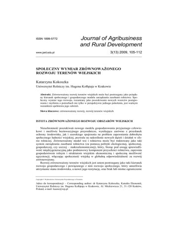 ISSN 1899-5772 Journal of Agribusiness and Rural Development www.jard.edu.pl 3(13) 2009, 105-112 SPOŁECZNY WYMIAR ZRÓWNOWAŻONEGO ROZWOJU TERENÓW WIEJSKICH Katarzyna Kokoszka Uniwersytet Rolniczy im. Hugona Kołłątaja w Krakowie Abstrakt. Zrównoważony rozwój terenów wiejskich może być postrzegany jako pożądany kierunek społecznego i gospodarczego modelu zarządzania zasobami rolnictwa. Społeczny wymiar tego rozwoju, rozumiany jako poszukiwanie nowych wzorców postępowania i myślenia o potrzebach nie tylko w perspektywie jednego pokolenia, jest ważnym warunkiem spełnienia jego założeń. Słowa kluczowe: zrównoważony rozwój, rozwój terenów wiejskich ISTOTA ZRÓWNOWAŻONEGO ROZWOJU OBSZARÓW WIEJSKICH Nieuchronność poszukiwań nowego modelu gospodarowania przyjaznego człowiekowi i możliwie bezinwazyjnego przyrodniczo, wynikająca zarówno z przesłanek ochrony środowiska, jak i szerokiego spojrzenia na problem zapewnienia dobrobytu społecznego ludności wiejskiej, pozwala na nakreślenie nowych dążeń i działań w sferze rolniczej. Zrównoważony model wsi i rolnictwa może być traktowany jako taki system zarządzania zasobami rolnictwa (za pomocą polityki ekologicznej, społecznej, gospodarczej, czy szerzej – makroekonomicznej), który, biorąc pod uwagę sprawiedliwość międzygeneracyjną jako podstawowy komponent przyszłości rolnictwa, zapewnia gospodarstwom rolnym i strukturom wiejskim ekonomiczną i społeczną możliwość egzystencji, włączając społeczność wiejską w globalną odpowiedzialność za rozwój zrównoważony. Rozwój zrównoważony terenów wiejskich jest zatem postrzegany jako taki kierunek rozwoju gospodarczego i powiązanego z nim rozwoju społecznego, który umożliwia utrzymanie stanu środowiska, a nawet jego restytucję, oraz brak lub istotne ograniczenie Copyright © Wydawnictwo Uniwersytetu Przyrodniczego w Poznaniu Adres do korespondencji – Corresponding author: dr Katarzyna Kokoszka, Katedra Ekonomii, Uniwersytet Rolniczy im. Hugona Kołłątaja w Krakowie, Al. Mickiewicza 21, 31-120 Kraków, Poland, e-mail: [email protected] 106 K. Kokoszka negatywnych nieodwracalnych zjawisk w nim zachodzących, przy jednoczesnej eksploatacji zasobów naturalnych, realizacji inwestycji, tworzenia techniki i technologii służących pomnażaniu gospodarczych, przyrodniczych i społecznych podstaw zaspokajania potrzeb obecnego i przyszłych pokoleń ludzi [Dubiel 1998]. Rozszerzeniu zainteresowań i poszukiwaniom sposobów umożliwienia rozwoju gospodarczego z zachowaniem zasobów ma służyć reorientacja polityki środowiskowej i gospodarczej stymulowana przez rozwój nowych technologii przyjaznych środowisku [Domański 1992]. Czynnikiem sprzyjającym takim przekształceniom jest także zmiana mentalności i sposobu patrzenia na relację gospodarka – środowisko. Sprzeczność między tymi elementami nie istnieje, jeśli weźmiemy pod uwagę fakt, iż specyfika problemów środowiska (jego zachowanie dla przyszłych pokoleń, ochrona i restytucja) musi być rozpatrywana jako zadanie szeroko pojętego rozwoju społecznego będącego jednocześnie ważnym czynnikiem osiągania wzrostu w całej gospodarce [Leszczyński 1985]. Rozwój zrównoważony może być także traktowany jako takie wykorzystywanie danego wolumenu zasobów (kapitału ludzkiego, surowców naturalnych), które nie powoduje jego uszczuplenia w perspektywie czasowej [Bojo 1992]. Zakłada się tutaj możliwość rekompensaty przyszłym pokoleniom strat z tytułu zmniejszania się kapitału naturalnego przez odpowiednie inwestycje powiększające zasób kapitału antropogenicznego [Czaja i Fiedor 2000]. Zrównoważony rozwój może być również ujmowany jako harmonizacja czterech ładów [Borys 1998]: – ekonomicznego, – społecznego, – ekologicznego, – przestrzennego, co wyraźnie wskazuje na to, że na zrównoważony rozwój należy patrzeć nie jak na stan, lecz na proces, który wymaga kontroli i sterowania różnymi czynnikami, a zatem kwestią zasadniczą jest wybór linii rozwoju opartej na minimalizowaniu strat oraz maksymalizowaniu korzyści (optymalizacji). Gospodarowanie zasobami ekonomicznymi obejmuje kapitał pieniężny, kapitał uprzedmiotowiony oraz techniki i technologie umożliwiające powiększenie kapitału podporządkowane przede wszystkim kategorii efektywności ekonomicznej. Przez pojęcie harmonizowania ładu społecznego rozumie się procesy powiększania i ograniczania wielkości zasobów ludzkich, kształtowanie ich jakości obejmującej stosunek do pracy oraz kwalifikacje, przeciwstawianie się procesom dehumanizacji i depersonalizacji, postrzeganie człowieka nie w kategoriach generowania zysku, ale w kategoriach podkreślających jego człowieczeństwo. Gospodarowanie kapitałem przyrodniczym dotyczy norm korzystania z kapitału przyrodniczego oraz opracowania mechanizmów przeciwdziałających szeroko rozumianym procesom zawłaszczania tego kapitału. Elementem łączącym procesy gospodarcze i społeczne jest przestrzeń. Harmonijny rozwój tego wymiaru ma polegać na kompleksowym planowaniu przestrzennym i zarządzaniu zasobami powierzchni Ziemi oraz zarządzaniu ekosystemami wrażliwymi, przez co rozumie się przeciwdziałanie pustynnieniu i suszom, zrównoważony rozwój systemów górskich, promowanie trwałego i zrównoważonego rozwoju rolnictwa i wsi oraz urbanizację [Piontek 2002]. Journal of Agribusiness and Rural Development Społeczny wymiar zrównoważonego rozwoju terenów wiejskich 107 Harmonizowanie podzbiorów zrównoważonego rozwoju, jakimi są łady: społeczny, ekonomiczny, ekologiczny i przestrzenny przesądza o powodzeniu realizacji głównych celów tej koncepcji rozwoju. Kształtowanie się sieci powiązań pomiędzy poszczególnymi elementami wymaga jednocześnie odpowiedniej „wewnętrznej” jakości każdego z nich. ŁAD SPOŁECZNY JAKO NIEZBĘDNY ELEMENT ZRÓWNOWAŻONEGO ROZWOJU OBSZARÓW