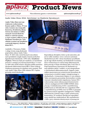 Product News 24 października 2016 www.aplauzaudio.pl Niecodzienna gazeta z nowościami [email protected] Audio Video Show 2016: Sennheiser na Stadionie Narodowym Audio Video Show jest największym wydarzeniem branży audio w Polsce. W tym roku wystawa ma swoją jubileuszową, dwudziestą edycję. Zawsze ma miejsce w kilku znanych warszawskich hotelach w centrum miasta, a część wystawy odbywa się na Stadionie Narodowym. Tam właśnie wystawi się Sennheiser z gwiazdą imprezy, słuchawkami HE 1. Audiofile z Warszawy, Polski i całego świata znają doskonale poprzednie edycje Audio Video Show. W 2015 roku wśród licznych niecodziennych produktów mogli między innymi posłuchać legendarnych słuchawek z 1991 roku, Sennheiser Orpheus. Wówczas było już wiadomo, że Sennheiser powróci z następcą tej słynnej konstrukcji. I w marcu 2016 roku miała miejsce oficjalna polska premiera słuchawek elektrostatycznych HE 1, które tradycję Orpheusa przenoszą na zupełnie nowy poziom. Podczas Audio Video Show 2016 właśnie HE 1 będzie gwiazdą wśród słuchawek. Reprodukcja dźwięków, które są tak naturalne, jak jest to tylko możliwe: wraz z nowym systemem słuchawkowym HE 1 firma Sennheiser przybliżyła się do tego ideału bardziej, niż ktokolwiek wcześniej. Serce wzmacniacza to osiem lamp elektronowych, które pracują w klasie określanej jako Cool Class A. Prąd znamionowy kierowany do słuchawek wynosi zaledwie około 5 woltów, co jest niespotykane w słuchawkach elektrostatycznych. Sygnał z materiałem muzycznym jest symetrycznie przesyłany do wzmacniacza wysokich napięć, zintegrowanego w słuchawkach, i wzmacniany dopiero w tym miejscu. Takie rozwiązanie gwarantuje ekstremalnie wysoką wierność charakterystyki impulsowej. System HE 1 wykorzystuje osiem referencyjnych konwerterów cyfrowo-analogowych ESS SABRE ES9018, które pracują z rozdzielczością 32 bit i częstotliwością próbkowania aż 384 kHz lub też z sygnałami DSD z częstotliwością 2,8 MHz oraz 5,6 MHz w przypadku symetrycznych sygnałów analogowych. Układy elektroniczne systemu mają w pełni symetryczną konstrukcję. W rezultacie dźwięk jest reprodukowany niemal bez zniekształceń: dla częstotliwości 1 kHz i przy ciśnieniu akustycznym wynoszącym Aplauz Sp. z o. o. KRS: 0000179872 REGON: 015566419 NIP (VAT No): 1181710940 kapitał (wpłacony w całości): 200 000 PLN nr ewidencyjny GIOŚ: E0010285W BANK HANDLOWY w WARSZAWIE SA nr konta: 87 1030 1582 0000 0008 5177 7008 ® 100 decybeli, całkowite zniekształcenia harmoniczne systemu wynoszą zaledwie 0,01%. Podczas Audio Video Show będzie można skorzystać z kilkuminutowej sesji odsłuchowej systemu HE 1. Wraz ze słuchawkami pracować będzie audiofilskiej klasy odtwarzacz i DAC marki Accuphase, dzięki uprzejmości jej polskiego dystrybutora, firmy Nautilus. Oczywiście to niejedyne gwiazdy, które będą obecne w sali Sennheisera na Audio Video Show. Niewątpliwym zainteresowaniem będą się cieszyć także inne modele słuchawek Sennheisera: audiofilskie HD 800 S, HD 800 i HD 700, kultowe otwarte HD 650 i HD 600, zamknięte HD 630VB oraz cała linia MOMENTUM. Ponadto grać będą audiofilskie wzmacniacze słuchawkowe HDVD 800. Ale to nie wszystko. W tym roku na stanowisku Sennheisera obecne będą także wszystkie najważniejsze linie słuchawek konsumenckich, takich jak nowe serie HD 500, HD 400 oraz HD 200 czy linia URBANITE. AUDIO VIDEO SHOW 2016 4-6 listopada 2016 Stadion Narodowy, Warszawa Sennheiser Polska: sala nr 141 Informacje i bilety: audioshow.pl sennheiser.pl Aplauz Sp. z o. o. KRS: 0000179872 REGON: 015566419 NIP (VAT No): 1181710940 kapitał (wpłacony w całości): 200 000 PLN nr ewidencyjny GIOŚ: E0010285W BANK HANDLOWY w WARSZAWIE SA nr konta: 87 1030 1582 0000 0008 5177 7008 ® Firmy Aplauz oraz Sennheiser udostępniają niniejsze zdjęcia wyłącznie do publikacji prasowych. Jakiekolwiek inne użycie jest naruszeniem prawa. Przekazanie zdjęć osobom trzecim jest możliwe jedynie za zgodą firm Aplauz i Sennheiser.