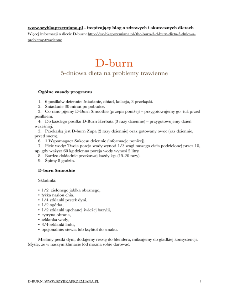 www.szybkaprzemiana.pl - inspirujący blog o zdrowych i skutecznych dietach Więcej informacji o diecie D-burn: http://szybkaprzemiana.pl/the-burn-3-d-burn-dieta-5-dniowaproblemy-trawienne D-burn 5-dniowa dieta na problemy trawienne Ogólne zasady programu 1. 6 posiłków dziennie: śniadanie, obiad, kolacja, 3 przekąski. 2. Śniadanie 30 minut po pobudce. 3. Co rano pijemy D-Burn Smoothie (przepis poniżej) – przygotowujemy go tuż przed posiłkiem. 4. Do każdego posiłku D-Burn Herbata (3 razy dziennie) – przygotowujemy dzień wcześniej. 5. Przekąską jest D-burn Zupa (2 razy dziennie) oraz gotowany owoc (raz dziennie, przed snem). 6. 1 Wspomagacz Sukcesu dziennie (informacje poniżej). 7. Picie wody: Twoja porcja wody wynosi 1/3 wagi naszego ciała podzielonej przez 10, np. gdy ważysz 60 kg dzienna porcja wody wynosi 2 litry. 8. Bardzo dokładnie przeżuwaj każdy kęs (15-20 razy). 9. Śpimy 8 godzin. D-burn Smoothie Składniki: • • • • • • • • • 1/2 zielonego jabłka obranego, łyżka nasion chia, 1/4 szklanki pestek dyni, 1/2 ogórka, 1/2 szklanki upchanej świeżej bazylii, cytryna obrana, szklanka wody, 3/4 szklanki lodu, opcjonalnie: stewia lub ksylitol do smaku. Mielimy pestki dyni, dodajemy resztę do blendera, miksujemy do gładkiej konsystencji. Myślę, że w naszym klimacie lód można sobie darować. D-BURN, WWW.SZYBKAPRZEMIANA.PL )1 D-burn Herbata Składniki: • • • • • • 18 szklanek wody, 10 torebek herbaty z lukrecji, 10 łyżeczek cynamonu, 10 torebek herbaty miętowej, kawałek posiekanego świeżego imbiru, 6 łyżek siemienia lnianego Wszystkie składniki wrzuć do garnka i postaw na ogniu. Gdy zawrze, gotuj jeszcze do 15 minut na małym ogniu. Odcedź. Przechowuj w lodówce do 5 dni. Rada czytelniczki Ady: Zrobiłam jak mówiła Haylie, wyszło źle. Zaparzcie zioła, odcedźcie płyn. Dodajcie siemię lniane, zaparzcie od nowa. W innym wypadku śluz z siemienia pochłonie zioła i będzie to nieciekawie wyglądać. D-burn Zupa Składniki na 10 porcji (1 porcja=2 szklanki): • 10 szklanek wody • 4,5 szklanek pokrojonego kalafiora, • 3 całe dymki posiekane, • 2 szklanki zielonej fasolki szparagowej, • 1 szklanka szparagów (usunąć twarde końce), • 1 szklanka natki pietruszki lub kolendry, • 2 ząbki czosnku posiekane, • 1 zielona papryka pokrojona na kawałki, • 1-2 papryczki jalapeño posiekane, • puszka pomidorów, • 1 litr wywaru z warzyw (tradycyjną włoszczyznę ugotować z listkiem laurowym i zielem angielskim, odcedzić), • ½ główki selera pokrojonej, • ½ główki czerwonej kapusty posiekanej, • 2 łyżki tamari, • 1/2 łyżeczki suszonego oregano, • 1/2 łyżeczki suszonego tymianek, • 1/2 łyżeczki suszonego rozmaryn, • 2 łyżeczki soli morskiej. Wszystkie składniki oprócz soli wrzucamy do garnka i na średnim ogniu doprowadzamy do wrzenia. Zmniejszamy ogień i gotujemy pod przykryciem przez 2 godziny. 5 minut przed końcem gotowania dodajemy sól. Zupę można jeść na ciepło lub na zimno. Można ją też zmiksować na krem. Przechowywać w lodówce do 5 dni. Można zamrozić w porcjach po 2 szklanki (tyle je się na jeden posiłek). D-BURN, WWW.SZYBKAPRZEMIANA.PL )2 Owoce na przekąskę wieczorną (do wyboru) Gruszka, gruszka azjatycka, zielone jabłko, papaja, ananas, śliwki. Owoce zawsze ugotowane. Porcja: pół owocu typu gruszka lub pół szklanki pokrojonych owoców typu ananas. Pakiet jedzenia bez ograniczeń D-burn zupa, D-burn Herbata, marchew, kiszona kapusta, kiszone ogórki, jarmuż, kimchi, cytryny, limonki Wspomagacze Sukcesu Jeden wybrany wspomagacz dziennie obowiązkowo, ale można wykonać ich więcej dla lepszych efektów. • 30 minut intensywnych ćwiczeń kardio, czyli takich, które przyspieszają puls, np. bieganie, jazda na rowerze, aerobik, szybki taniec (można taką 30-minutową sesję powtórzyć 3 x dziennie), • sok z aloesu naturalny bez cukru i innych niepożądanych dodatków – 1/4 szklanki dziennie dodane do porannego smoothie, • herbata z pau d’arco (roślina z Ameryki Połudnowej) – dostępna przez Internet, • fenkuł, czyli koper włoski na surowo – szklanka świeżego do dowolnego posiłku, • 1-2 łyżki octu jabłkowego + szklanka wody w temperaturze pokojowej, • kiszone ogórki, kiszona kapusta – do posiłków, • olejki eteryczne – oregano, gałka muszkatołowa, kardamon, goździki (kilka kropel wymieszać z niewielką ilością nierafinowanego oleju kokosowego, można w rękach lub w miseczce, masować tą miksturą brzuch lub każdy obszar, gdzie zbiera się twardy tłuszcz), • medytacja, • refleksologia skierowana na obszar płuc i klatki piersiowej, • sucha sauna, • masaż gorącymi kamieniami, • zielona pszenica. Przepisy na lunch i kolację H. Pomroy, autorka programu diety podaje szereg przepisów na użytek D-burn, jednak nie ma obowiązku trzymać się ich, można ułożyć własne na podstawie listy produktów Dburn. Dlatego też nie zamieszczam jej przepisów z wyjątkiem łososia w koprem włoskim, ponieważ są wieloskładnikowe i czasochłonne, a już samo zrobienie herbaty i zupy to trochę roboty. Podane przeze mnie przepisy pozwolą zaoszczędzić czas i są w 100% zgodne z wymogami programu. D-BURN, WWW.SZYBKAPRZEMIANA.PL )3 Dzień 1. 1. 30 minut po pobudce, śniadanie: D–Burn Smoothie (porcja wg przepisu) i D-Burn Herbata (szklanka) 2. Przekąska – D-Burn Zupa + 25% wody 3. Lunch: D-Burn Herbata (szklanka) + danie + 25% wody 4.Przekąska – D-Burn Zupa + 25% wody 5. Kolacja: D–Burn Herbata (szklanka) + danie + 25% wody 6. Przekąska: 1/2 szklanki pokrojonych śliwek ugotowanych Dzień 2. 1. 30 minut po pobudce, śniadanie: D-Burn Smoothie (porcja wg przepisu) i D-Burn Herbata (szklanka) 2. Przekąska – D-Burn Zupa + 25% wody 3. Lunch: D-Burn Herbata (szklanka) + danie + 25% wody 4.Przekąska – D-Burn Zupa + 25% wody 5. Kolacja: D-Burn Herbata (szklanka) + danie + 25%