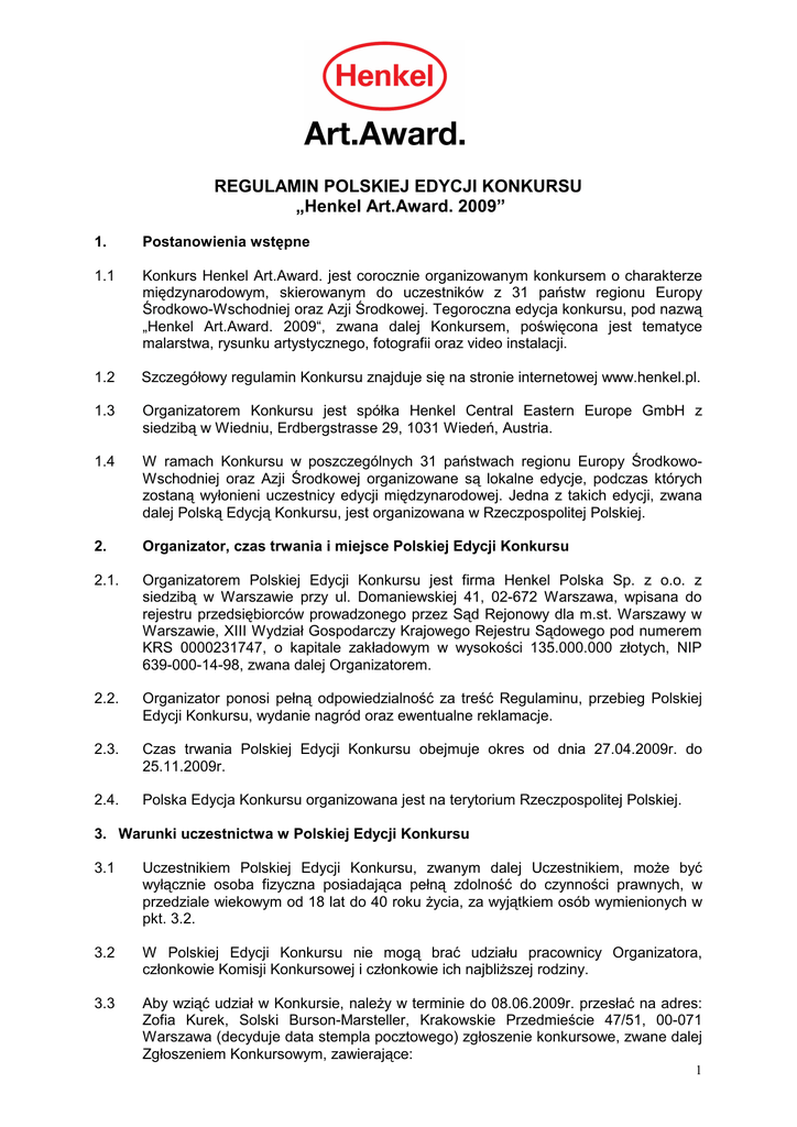 REGULAMIN POLSKIEJ EDYCJI KONKURSU „Henkel Art.Award. 2009” 1. Postanowienia wstępne 1.1 Konkurs Henkel Art.Award. jest corocznie organizowanym konkursem o charakterze międzynarodowym, skierowanym do uczestników z 31 państw regionu Europy Środkowo-Wschodniej oraz Azji Środkowej. Tegoroczna edycja konkursu, pod nazwą „Henkel Art.Award. 2009“, zwana dalej Konkursem, poświęcona jest tematyce malarstwa, rysunku artystycznego, fotografii oraz video instalacji. 1.2 Szczegółowy regulamin Konkursu znajduje się na stronie internetowej www.henkel.pl. 1.3 Organizatorem Konkursu jest spółka Henkel Central Eastern Europe GmbH z siedzibą w Wiedniu, Erdbergstrasse 29, 1031 Wiedeń, Austria. 1.4 W ramach Konkursu w poszczególnych 31 państwach regionu Europy ŚrodkowoWschodniej oraz Azji Środkowej organizowane są lokalne edycje, podczas których zostaną wyłonieni uczestnicy edycji międzynarodowej. Jedna z takich edycji, zwana dalej Polską Edycją Konkursu, jest organizowana w Rzeczpospolitej Polskiej. 2. Organizator, czas trwania i miejsce Polskiej Edycji Konkursu 2.1. Organizatorem Polskiej Edycji Konkursu jest firma Henkel Polska Sp. z o.o. z siedzibą w Warszawie przy ul. Domaniewskiej 41, 02-672 Warszawa, wpisana do rejestru przedsiębiorców prowadzonego przez Sąd Rejonowy dla m.st. Warszawy w Warszawie, XIII Wydział Gospodarczy Krajowego Rejestru Sądowego pod numerem KRS 0000231747, o kapitale zakładowym w wysokości 135.000.000 złotych, NIP 639-000-14-98, zwana dalej Organizatorem. 2.2. Organizator ponosi pełną odpowiedzialność za treść Regulaminu, przebieg Polskiej Edycji Konkursu, wydanie nagród oraz ewentualne reklamacje. 2.3. Czas trwania Polskiej Edycji Konkursu obejmuje okres od dnia 27.04.2009r. do 25.11.2009r. 2.4. Polska Edycja Konkursu organizowana jest na terytorium Rzeczpospolitej Polskiej. 3. Warunki uczestnictwa w Polskiej Edycji Konkursu 3.1 Uczestnikiem Polskiej Edycji Konkursu, zwanym dalej Uczestnikiem, moŜe być wyłącznie osoba fizyczna posiadająca pełną zdolność do czynności prawnych, w przedziale wiekowym od 18 lat do 40 roku Ŝycia, za wyjątkiem osób wymienionych w pkt. 3.2. 3.2 W Polskiej Edycji Konkursu nie mogą brać udziału pracownicy Organizatora, członkowie Komisji Konkursowej i członkowie ich najbliŜszej rodziny. 3.3 Aby wziąć udział w Konkursie, naleŜy w terminie do 08.06.2009r. przesłać na adres: Zofia Kurek, Solski Burson-Marsteller, Krakowskie Przedmieście 47/51, 00-071 Warszawa (decyduje data stempla pocztowego) zgłoszenie konkursowe, zwane dalej Zgłoszeniem Konkursowym, zawierające: 1 3.3.1 curriculum vitae oraz podsumowanie kariery artystycznej Uczestnika – edukacja i wystawy (w języku angielskim lub niemieckim) 3.3.2 pracę konkursową spełniającą kryteria jednej z definicji malarstwa, rysunku artystycznego, fotografii lub video instalacji, oraz spełniającą następujące wymogi formalne: jedno zgłoszenie moŜe zawierać od 5 do 10 prac, przesłanych w postaci fotografii, teczek lub katalogów artystycznych (ich maksymalny format to A3), slajdów i DVD, nie będących oryginałami prac. 3.3.3 kwestionariusz osobowy, znajdujący się na stronie www.henkel.pl, zawierający: 3.3.3.1 czytelne dane kontaktowe Uczestnika (imię, nazwisko, adres, telefon, data i miejsce urodzenia, narodowość), 3.3.3.2 podpisane czytelnie oświadczenia Uczestnika Polskiej Edycji Konkursu: 3.3.3.2.1 „WyraŜam zgodę na wykorzystanie przez Henkel Polska Sp. z o.o. z siedzibą w Warszawie oraz Henkel Central Eastern Europe GmbH z siedzibą w Wiedniu moich danych osobowych umieszczonych na niniejszym kwestionariuszu osobowym wchodzącym w skład Zgłoszenia Konkursowego wyłącznie w celu przeprowadzenia polskiej i międzynarodowej edycji Konkursu „Henkel Art.Award. 2009” oraz w celu wydania nagród w obu wymienionych wyŜej edycjach. Niniejsza zgoda obejmuje równieŜ przekazanie Pracy konkursowej, zgłoszonej przeze mnie w ramach polskiej edycji wyŜej wymienionego Konkursu, do Henkel Central Eastern Europe GmbH z siedzibą w Wiedniu oraz stanowi jednocześnie moje zgłoszenie do udziału w międzynarodowej edycji Konkursu. 3.3.3.2.2 „Zapoznałem się z regulaminem Konkursu i wyraŜam zgodę na jego treść.” 3.3.3.3 oświadczenie Organizatora: „Uczestnik polskiej edycji Konkursu ma prawo wglądu do swoich danych i prawo ich poprawiania. Dane osobowe umieszczone na niniejszym kwestionariuszu osobowym wchodzącym w skład Zgłoszenia Konkursowego będą przetwarzane zgodnie z wymaganiami Ustawy o ochronie danych osobowych oraz towarzyszących jej rozporządzeń. Administrator informuje, Ŝe podanie danych jest dobrowolne.”, 3.3.3.4 podpisane czytelnie oświadczenie Uczestnika wyraŜające zgodę na nieodpłatne zaprezentowanie Prac konkursowych Uczestnika, zarówno podczas wystawy i/lub wystaw Prac konkursowych na terytorium Rzeczypospolitej Polskiej, jak równieŜ w Wiedniu/Austria w okresie od 1 sierpnia 2009 r. do 31 grudnia 2009r. 3.4 Prace konkursowe nie mogą nawiązywać ani tematycznie, ani graficznie do Organizatora. W szczególności nie będą miały związku z wprowadzanymi przez Organizatora do obrotu produktami oraz nie będą się umyślnie odwoływać do elementów graficznych wizerunku korporacyjnego (np. logo, korporacyjna kolorystyka, etc). 3.5 Prace konkursowe muszą być stworzone nie wcześniej niŜ 01.01.2006 r. 3.6 Zgłoszenia Konkursowe wypełnione nieprawidłowo bądź w sposób niepełny (np. nie zawierające choćby jednego z elementów wymaganych niniejszym Regulaminem) 2 bądź teŜ Zgłoszenia Konkursowe wypełnione nieczytelnie albo złoŜone po upływie okresu trwania Polskiej Edycji Konkursu nie będą brały udziału w Konkursie. 3.7 Osoba biorąca udział w Polskiej Edycji Konkursu będzie miała prawo przedstawić do Polskiej Edycji Konkursu dowolną liczbę Zgłoszeń Konkursowych. Za jedno Zgłoszenie Konkursowe uwaŜać się będzie wyłącznie jedno Zgłos