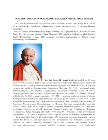 ROK 2015 - BOGATY W WAŻNE ROCZNICE DLA POLSKI I DLA EUROPY 2015 rok przyniesie wiele ważnych dla Polski i Europy rocznic. Mija wtedy m.in. 70. lat od wyzwolenia KL Auschwitz i zakończenia II wojny światowej oraz 75. rocznica Zbrodni Katyńskiej. Rok 2015 został ustanowiony przez Sejm, uchwałą z dn. 5 grudnia 2014r., Rokiem św. Jana Pawła II ( 10. rocznica śmierci), Jana Długosza (600. rocznica urodzin), a także Rokiem Teatru Publicznego z racji 250. rocznicy powstania najstarszego w Polsce Teatru Narodowego w Warszawie. Św. Jan Paweł II (Karol Wojtyła) urodził się 18 maja 1920 r. w Wadowicach. Jego ojciec był zawodowym wojskowym. Matka Karola zmarła 13 kwietnia 1929 r. Dziewięcioletnim chłopcem zajął się ojciec. We wrześniu 1930 r. Karol zdał egzamin do męskiego Państwowego Gimnazjum Śląskiego. W 1938 r. rozpoczął studia polonistyczne na Uniwersytecie Jagiellońskim, przerwane wybuchem wojny. W czasie okupacji pracował jako robotnik w kamieniołomach w Zakrzówku i w fabryce "Solvay" w Krakowie. W 1941 r. zmarł mu ojciec. W 1942 r. rozpoczął studia na tajnym Wydziale Teologicznym Uniwersytetu Jagiellońskiego, ukończył je po wojnie w 1946 roku i z rąk Kardynała Adama Sapiehy otrzymał święcenia kapłańskie. Do 1948 roku odbywał studia na Papieskim Uniwersytecie Dominikańskim w Rzymie. Pierwszą duszpasterską placówką księdza Karola była mała, wiejska parafia Niegowić niedaleko Bochni. W 1949 roku arcybiskup Sapieha przydzielił Karolowi Wojtyle parafię św. Floriana na Kleparzu w Krakowie. Sakrę biskupią otrzymał w 1958 roku. W 1964 roku został arcybiskupem krakowskim, a w 1967 kardynałem. Brał aktywny udział w Soborze Watykańskim II. Po śmierci Jana Pawła I, 16 października 1978 roku został wybrany na papieża i przyjął imiona Jan Paweł II. Był pierwszym od 455 lat papieżem nie -Włochem i pierwszym Polakiem na Stolicy Piotrowej. Pontyfikat Jana Pawła II upływał pod znakiem posługi na rzecz ekumenizmu, cywilizacji miłości, wolności wzorowanej na Eucharystii. Odwiedził większość krajów świata - z tej racji zwany jest "papieżem pielgrzymem" - odbył ponad 100 zagranicznych podróży duszpasterskich. Jan Paweł II zmarł 2 kwietnia 2005 roku o godzinie 21:37. Po śmierci papieża wielu duchownych i wiernych dodało mu nowy przydomek, nazywając go Janem Pawłem Wielkim. Tylko trzech papieży w historii kościoła katolickiego nosiło taki przydomek. Jan Paweł II został pochowany 8 kwietnia 2005 roku w Watykanie. Jan Długosz herbu Wieniawa (1415-1480): kanonik krakowski, historyk, dyplomata. Piastował funkcję kanclerza biskupa krakowskiego Zbigniewa Oleśnickiego. Od 1467 roku wychowawca synów królewskich na dworze Kazimierza Jagiellończyka. Od roku 1436 był kanonikiem krakowskim, a od 1480 roku arcybiskupem lwowskim. Napisał między innymi pierwszą wybitną syntezę w hagiografii polskiej „Historia Polonica (1455-1480)”, a także „Roczniki, czyli kroniki sławnego Królestwa Polskiego”. Jest autorem opisów źródłowych i wizerunków herbów polskich: „Insignia seu clenodia incliti Regni Poloniae”, a także statystycznego opisu beneficjów Kościoła w Małopolsce. Był głównym fundatorem klasztoru i kościoła na Skałce. W roku 1471 sprowadził tutaj zakonników św. Pawła Pierwszego Pustelnika (Paulinów) z Jasnej Góry, gdzie ci przebywają do dziś. W geście dziękczynnym został obdarzony dyplomem konfraterni tegoż zakonu. Po śmierci jego ciało złożono w urnie w kościele skałecznym, a w 1880 roku prochy tego wielkiego Polaka przeniesiono do Krypty Zasłużonych na Skałce i złożono w kamiennym sarkofagu. Teatr publiczny narodził się w Polsce w 1765 r. wraz z powołaniem przez króla Stanisława Augusta Poniatowskiego Teatru Narodowego. To był ważny krok dla budowy mecenatu państwa nad powszechnie dostępną kulturą, a zarazem niepodważalne świadectwo udziału Polski w procesie kształtowania nowoczesnej, demokratycznej Europy. Dziś bezpośrednimi spadkobiercami ówczesnego Teatru Narodowego są Teatr Narodowy w Warszawie, Teatr Wielki – Opera Narodowa oraz sieć ponad stu teatrów – instytucji artystycznych – dotowanych obecnie ze środków publicznych. Kulminacja obchodów przypadnie 19 listopada. Tego dnia odbędzie się premiera "Kordiana" Juliusza Słowackiego w reżyserii Jana Englerta.