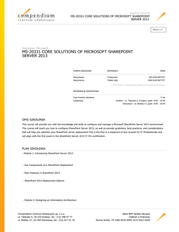 Szkolenie Microsoft MS-20331 CORE SOLUTIONS OF MICROSOFT SHAREPOINT SERVER 2013 Strona 1 z 5 Szkolenie: Microsoft MS-20331 CORE SOLUTIONS OF MICROSOFT SHAREPOINT SERVER 2013 FORMA SZKOLENIA MATERIAŁY CENA Stacjonarne Tradycyjne 950 EUR NETTO* Stacjonarne Tablet ctab 1050 EUR NETTO* *(+VAT zgodnie z obowiązującą stawką w dniu wystawienia faktury) INFORMACJE DODATKOWE Czas trwania szkolenia 5 dni Lokalizacje Kraków - ul. Tatarska 5, II piętro, godz. 9:00 - 16:00 Warszawa - ul. Bielska 17, godz. 9:00 - 16:00 OPIS SZKOLENIA This course will provide you with the knowledge and skills to configure and manage a Microsoft SharePoint Server 2013 environment. This course will teach you how to configure SharePoint Server 2013, as well as provide guidelines, best practices, and considerations that will help you optimize your SharePoint server deployment.This is the first in a sequence of two courses for IT Professionals and will align with the first exam in the SharePoint Server 2013 IT Pro certification. PLAN SZKOLENIA - Module 1: Introducing SharePoint Server 2013 - Key Components of a SharePoint Deployment - New Features in SharePoint 2013 - SharePoint 2013 Deployment Options - Module 2: Designing an Information Architecture Compendium Centrum Edukacyjne sp. z o.o. ul. Tatarska 5, 30-103 Kraków, tel.: (12) 298 47 77 ul. Bielska 17, 02-394 Warszawa, tel.: (22) 417 41 70 Bank BPH Spółka Akcyjna Oddział w Krakowie Numer konta: 74 1060 0076 0000 3210 0022 6028 Szkolenie Microsoft MS-20331 CORE SOLUTIONS OF MICROSOFT SHAREPOINT SERVER 2013 Strona 2 z 5 - Identifying Business Requirements - Understanding Business Requirements - Organizing Information in SharePoint 2013 - Planning for Discoverability - Module 3: Designing a Logical Architecture - Overview of SharePoint 2013 Logical Architecture - Documenting Your Logical Architecture - Module 4: Designing a Physical Architecture - Designing Physical Components for SharePoint Deployments - Designing Supporting Components for SharePoint Deployments - SharePoint Farm Topologies - Mapping a Logical Architecture Design to a Physical Architecture Design - Module 5: Installing and Configuring SharePoint Server 2013 - Installing SharePoint Server 2013 - Scripting Installation and Configuration Compendium Centrum Edukacyjne sp. z o.o. ul. Tatarska 5, 30-103 Kraków, tel.: (12) 298 47 77 ul. Bielska 17, 02-394 Warszawa, tel.: (22) 417 41 70 Bank BPH Spółka Akcyjna Oddział w Krakowie Numer konta: 74 1060 0076 0000 3210 0022 6028 Szkolenie Microsoft MS-20331 CORE SOLUTIONS OF MICROSOFT SHAREPOINT SERVER 2013 Strona 3 z 5 - Configuring SharePoint Server 2013 Farm Settings - Module 6: Creating Web Applications and Site Collections - Creating Web Applications - Configuring Web Applications - Creating and Configuring Site Collections - Module 7: Planning and Configuring Service Applications - Introduction to Service Application Architecture - Creating and Configuring Service Applications - Module 8: Managing Users and Permissions - Authorization in SharePoint 2013 - Managing Access to Content - Module 9: Configuring Authentication for SharePoint 2013 - Overview of Authentication Compendium Centrum Edukacyjne sp. z o.o. ul. Tatarska 5, 30-103 Kraków, tel.: (12) 298 47 77 ul. Bielska 17, 02-394 Warszawa, tel.: (22) 417 41 70 Bank BPH Spółka Akcyjna Oddział w Krakowie Numer konta: 74 1060 0076 0000 3210 0022 6028 Szkolenie Microsoft MS-20331 CORE SOLUTIONS OF MICROSOFT SHAREPOINT SERVER 2013 Strona 4 z 5 - Configuring Federated Authentication - Configuring Server-to-Server Authentication - Module 10: Securing a SharePoint 2013 Deployment - Securing the Platform - Configuring Farm-Level Security - Module 11: Managing Taxonomy - Managing Content Types - Understanding Term Stores and Term Sets - Managing Term Stores and Term Sets - Module 12: Configuring User Profiles - Configuring the User Profile Service Application - Managing User Profiles and Audiences - Module 13: Configuring Enterprise Search - Understanding the Search Service Architecture Compendium Centrum Edukacyjne sp. z o.o. ul. Tatarska 5, 30-103 Kraków, tel.: (12) 298 47 77 ul. Bielska 17, 02-394 Warszawa, tel.: (22) 417 41 70 Bank BPH Spółka Akcyjna Oddział w Krakowie Numer konta: 74 1060 0076 0000 3210 0022 6028 Szkolenie Microsoft MS-20331 CORE SOLUTIONS OF MICROSOFT SHAREPOINT SERVER 2013 Strona 5 z 5 - Configuring Enterprise Search - Managing Enterprise Search - Module 14: Monitoring and Maintaining a SharePoint 2013 Environment - Monitoring a SharePoint 2013 Environment - Tuning and Optimizing a SharePoint Environment - Planning and Configuring Caching - Troubleshooting a SharePoint 2013 Environment WYMAGANIA DLA UCZESTNIKA An ideal candidate will have at least one year of experience with deploying and administering multiple SharePoint 2010 farms across a large enterprise. Because many customers skipped upgrading from SharePoint 2007, a candidate can also have at least 2 years of experience with SharePoint 2007 and knowledge of the differences between 2007 and 2010, particularly the Service Application model. A candidate can demonstrate the following skills: Software management in a Windows 2008 R2 enterprise server or Windows Server 2012 environment. Deploying and managing applications natively, virtually and in the cloud. Administering Internet Information Services (IIS). Configuring Active Directory for use in authentication, authorization and as a user store. Managing an application remotely using Windows PowerShell 2.0. Connecting applications to Microsoft SQL Server. Implementing Claims-based Security. CERTYFIKATY The participants will obtain Microsoft certificates. PROWADZĄCY Microsoft Certified Trainer. Compendium Centrum Edukacyjne sp. z o.o. ul. Tatarska 5, 30-103 Kraków, tel.: (12) 298 47 77 ul. Bielska 17, 02-394 Warszawa, tel.: (22) 417 41 70 Bank BPH Spółka Akcyjna Oddział w Krakowie Numer konta: 74 1060 0076 0000 3210 0022 6028