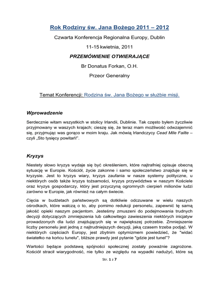Rok Rodziny św. Jana Bożego 2011 – 2012 Czwarta Konferencja Regionalna Europy, Dublin 11-15 kwietnia, 2011 PRZEMÓWIENIE OTWIERAJĄCE Br Donatus Forkan, O.H. Przeor Generalny Temat Konferencji: Rodzina św. Jana Bożego w służbie misji. Wprowadzenie Serdecznie witam wszystkich w stolicy Irlandii, Dublinie. Tak często byłem życzliwie przyjmowany w waszych krajach; cieszę się, że teraz mam możliwość odwzajemnić się, przyjmując was gorąco w moim kraju. Jak mówią Irlandczycy Cead Mile Failte – czyli „Sto tysięcy powitań!”. Kryzys Niestety słowo kryzys wydaje się być określeniem, które najtrafniej opisuje obecną sytuację w Europie. Kościół, życie zakonne i samo społeczeństwo znajduje się w kryzysie. Jest to kryzys wiary, kryzys zaufania w nasze systemy polityczne, u niektórych osób także kryzys tożsamości, kryzys przywództwa w naszym Kościele oraz kryzys gospodarczy, który jest przyczyną ogromnych cierpień milionów ludzi zarówno w Europie, jak również na całym świecie. Cięcia w budżetach państwowych są dotkliwie odczuwane w wielu naszych ośrodkach, które walczą o to, aby pomimo redukcji personelu, zapewnić tę samą jakość opieki naszym pacjentom. Jesteśmy zmuszeni do podejmowania trudnych decyzji dotyczących zmniejszenia lub całkowitego zawieszenia niektórych inicjatyw prowadzonych dla ludzi znajdujących się w największej potrzebie. Zmniejszenie liczby personelu jest jedną z najtrudniejszych decyzji, jaką czasem trzeba podjąć. W niektórych częściach Europy, jest zbytnim optymizmem powiedzieć, że "widać światełko na końcu tunelu", bliższe prawdy jest pytanie "gdzie jest tunel”? Wartości będące podstawą spójności społecznej zostały poważnie zagrożone. Kościół stracił wiarygodność, nie tylko ze względu na wypadki nadużyć, które są Str. 1 z 7 przestępstwem, ale przede wszystkim ze względu na błędne podejście władz kościoła do tego problemu w przeszłości. Ta sytuacja niestety odbiła się na nas wszystkich. Pozytywne strony Zanim popadniemy w całkowitą depresję, trzeba zauważyć, że są także powody do nadziei. W języku chińskim istnieją dwa piktogramy, które razem tworzą słowo kryzys: jeden oznacza szkodę a drugi możliwość. My, Europejczycy, jesteśmy prężnymi ludźmi, możemy zatem przemienić obecny kryzys w szansę, by stać się silniejszymi, bardziej zjednoczonymi i odpowiedzialnymi. Naszym powołaniem jest kształtowanie przyszłości Nie można przecenić tego, jak ważna jest dla nas ta Czwarta Konferencja Regionalna Europy. Nikt nie spodziewa się, że rozwiążemy problemy Europy, ale musimy wskazać kierunek, nakreślić nowe ramy naszej misji w tych burzliwych i niespokojnych czasach, w których żyjemy. Wierzę, że przetrwanie Zakonu i jego misji Szpitalnictwa zależy od podejmowanych przez nas decyzji. Spoczywa na nas ogromna odpowiedzialność dania profetycznej odpowiedzi na sytuację, w której się znajdujemy. Naszym powołaniem i obowiązkiem jest kształtowanie przyszłości. Zebraliśmy się tutaj, nie tylko po to, by rozmawiać o przyszłości naszych ośrodków opieki zdrowotnej i społecznej, ale także o przyszłości posługi Kościoła. Wspólna kultura, język i misja Konferencja ta odbywa się w roku poświęconym Rodzinie św. Jana Bożego. Mamy nadzieję, że będzie ona zastrzykiem świeżej energii i nada nową dynamikę misji bonifraterskiej. Jest ona ważnym narzędziem w procesie odnowy. Ostatnie trzy konferencje odegrały znaczącą rolę w promowaniu i w rozwoju międzyregionalnej współpracy, na wielu poziomach tj. formacja, praca w sieci, współpraca bliźniacza, realizacja wspólnych projektów, wymiana między personelem itd. Doprowadziło to do zacieśnienia więzi między prowincjami i poszczególnymi osobami a także do umocnienia tożsamość Regionu Europy. Liczba braci wciąż spada, podczas gdy liczba współpracowników nieustannie wzrasta. Niektórzy pytają "gdyby było po tysiąc braci w każdej z prowincji naszego Zakonu, czy wtedy współpracownicy byliby także uznani za współodpowiedzialnych za misję św. Jana Bożego?" Niestety, nie znam odpowiedzi na to pytanie, Str. 2 z 7 pamiętajmy jednak, że na mocy naszego powołania, musimy odpowiedzieć na wezwanie Soboru Watykańskiego II, który wezwał do tego, by włączać świeckich w struktury zarządzania. Czy jesteśmy braćmi czy współpracownikami naszym zadaniem, w tych niespokojnych i trudnych czasach, jest bycie kierującym światłem, współczującą obecnością, przewodnikami moralnymi oraz ludźmi wiary i nadziei. Najlepszym sposobem zapewnienia ciągłości trwania charyzmatu św. Jana Bożego w przyszłości jest zacieśnienie współpracy międzyprowincjalnej. Trzeba zauważyć dwa aspekty tej sytuacji: z jednej strony jesteśmy rozproszeni w wielu krajach, mówimy różnymi językami, pochodzimy z różnych kultur i środowisk, z drugiej jednak strony łączy nas wspólny język szpitalnictwa i braterstwa. Oba te aspekty ubogacają nas wszystkich. Ważne jest, abyśmy kontynuowali zarówno współpracę, jaki i zacieśnianie więzi między regionami. Misja Rodziny św. Jana Bożego Tematem tej Konferencji Regionalnej jest Misja Rodziny św. Jana Bożego. To oznacza, że jesteśmy grupą ludzi zaangażowanych w realizację wspólnej misji. W dysfunkcyjnej rodzinie trudno zrealizować wspólny plan. Jest to bardzo ważne, abyśmy wiedzieli, kim jesteśmy i jaka jest nasza misja. Karol Darwin powiedział, że to nie ci najinteligentniejsi lub najmocniejsi, są zdolni do przetrwania, lecz ci, którzy są zdolni do przemiany. Musimy nieustannie się odnawiać, abyśmy mogli realizowali w przyszłości wizję i marzenie św. Jana Bożego. Liderzy w Zakonie będą musieli posiadać umiejętność słuchania, prowadzenia dialogu i zdolność podejmowania decyzji. Odnowę można porównać do kompasu, który wskazuje kierunek ku przyszł