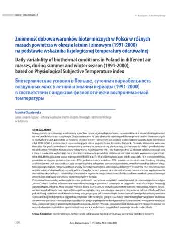 BIOKLIMATOLOGIA © Blue Sparks Publishing Group Zmienność dobowa warunków biotermicznych w Polsce w różnych masach powietrza w okresie letnim i zimowym (1991-2000) na podstawie wskaźnika fizjologicznej temperatury odczuwalnej Daily variability of biothermal conditions in Poland in different air masses, during summer and winter season (1991-2000), based on Physiological Subjective Temperature index Биотермические условия в Польше, суточная вариабельность воздушных масс в летний и зимний периоды (1991-2000) в соответствии с индексом физиологически воспринимаемой температуры Monika Okoniewska Zakład Geografii Fizycznej i Ochrony Krajobrazów, Instytut Geografii, Uniwersytet Kazimierza Wielkiego w Bydgoszczy STRESZCZENIE Masy powietrza wpływając w odmienny sposób w poszczególnych porach roku na warunki termiczne oddziałują również na warunki klimatu odczuwalnego. Opracowanie ma na celu zbadanie przebiegu dobowego warunków biotermicznych w różnych masach powietrza w Polsce w okresie letnim i zimowym. Do analizy wykorzystane zostały dane terminowe z lat 1991-2000 z sześciu stacji reprezentujących różne regiony kraju: Koszalin, Białystok, Poznań, Warszawa, Wrocław, Rzeszów. Na podstawie danych temperatury powietrza, temperatury punktu rosy, zachmurzenia nieba i prędkości wiatru obliczono wskaźnik temperatury odczuwanej fizjologicznie (PST) dla każdego dnia w okresie kalendarzowego lata i zimy, a następnie wybierając dni z określonymi masami powietrza obliczono wartości średnie wymienionego wskaźnika. Wskaźnik obliczony został w programie BioKlima 2.5. W analizie ograniczono się do podziału na 4 masy powietrza: powietrze arktyczne, polarno-morskie – PPm, polarno-kontynentalne – PPk i powietrze zwrotnikowe. Przebieg dobowy analizowano w tych przypadkach, gdy przez całą dobę zalegała ta sama masa powietrza, określona według założeń klasyfikacji geograficznej. Przeprowadzone analizy dotyczyły określenia przebiegów dobowych wskaźnika PST, procentowego udziału odczuć cieplnych występujących w różnych masach powietrza w okresie letnim i zimowym oraz występowania wartości maksymalnych i minimalnych wskaźnika. Wybrane miejscowości umożliwiły zbadanie rozkładu przestrzennego zmienności dobowej warunków biotermicznych w Polsce. Przeprowadzone analizy wskazują że latem w godzinach nocnych we wszystkich masach powietrza przeważają odczucia typu „zimno”. Nieco bardziej zróżnicowane warunki występują w godzinach dziennych. W przypadku mas arktycznych dominują odczucia typu„chłodno”. Masy polarno-morskie z kolei są masami, w których warunki termiczne są najbardziej zbliżone do warunków komfortowych, przy czym w Polsce północnej są to masy warunkujące również występowanie odczuć chłodu, w Polsce południowej natomiast obok komfortu masy te są przyczyną odczuwania ciepła. Masy zwrotnikowe i polarno-kontynentalne są masami najcieplejszymi i w ciągu dnia przynoszą odczucia typu gorąco, a w Polsce południowej bardzo gorąco. W okresie zimowym w godzinach nocnych w przypadku mas arktycznych i polarno-kontynentalnych zanotowano występowanie odczuć typu „bardzo zimno”, w pozostałych masach odczucia „zimno”. W ciągu dnia natomiast dominującym rodzajem odczuć we wszystkich masach powietrza są odczucia zimna, a w sporadycznych przypadkach pojawiają się odczucia chłodu. Słowa kluczowe: bioklimatologia, temperatura odczuwana fizjologicznie, masy powietrza, przebieg dobowy 134 Acta Balneologica TOM LV, Nr 2 (132) /2013 Zmienność dobowa warunków biotermicznych w Polsce w różnych masach powietrza w okresie letnim i zimowym (1991-2000) SUMMARY The influence of air masses on thermal conditions varies between seasons. This is also true in case of biothermal conditions. The purpose of this paper is to evaluate daily cyclic behaviour of biothermal conditions in different air masses in Poland using direct comparison data for summer and winter seasons. The analysis uses data from six geographically dispersed stations; Koszalin, Białystok, Poznań, Warszawa, Wrocław, and Rzeszów. The data was gathered in time frames covering calendar summers and winters from 1991 to 2000. Based on air temperature, dew point, cloud cover and wind speed physiological subjective temperature (PST, ºC) was calculated. Next, days with particular air masses were chosen and the PST averaged. The index was calculated in BioKlima ver. 2.5. Air masses were divided into four groups: arctic air (PA), maritime polar air (PPm), continental polar air (PPk) and tropical air (PZ). Data was only included where air mass remained consistent over a 24 hour period. The analysis contains evaluation of daily cycle of Physiological Subjective Temperature, the frequency of occurrence of thermal sensations in different air masses and appearance of minimal and maximal values of the index. The chosen cities enabled us to research the spatial range of daily variability of the biothermal conditions in Poland. The analysis show that there is a domination of the cold sensations at night hours during summer in all air masses. Day hours were more variable. The cool sensations are dominant in arctic masses. The comfortable conditions occurred in polar maritime masses however in the northern part of Poland this kind of masses cause cool conditions, whereas in the southern warm conditions. Polar continental and tropical masses are the warmest and they cause hot sensations, and in the southern part of Poland very hot sensations. There were very cold sensations in arctic and polar continental air masses at night hours during winter. The other masses in the same period caused cold sensations. There is domination of cold sensations during day hours in all types of air masses and cool sensations occurs occasional
