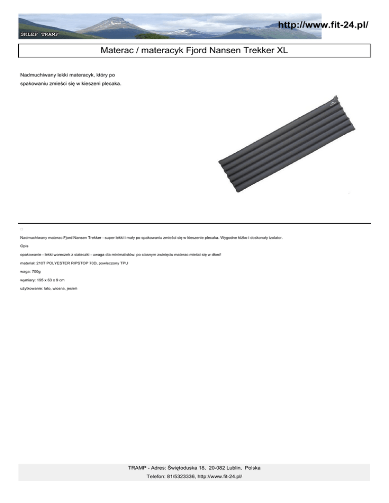 http://www.fit-24.pl/ Materac / materacyk Fjord Nansen Trekker XL Nadmuchiwany lekki materacyk, który po spakowaniu zmieści się w kieszeni plecaka. Nadmuchiwany materac Fjord Nansen Trekker - super lekki i mały po spakowaniu zmieści się w kieszenie plecaka. Wygodne łóżko i doskonały izolator. Opis opakowanie - lekki woreczek z siateczki - uwaga dla minimalistów: po ciasnym zwinięciu materac mieści się w dłoni! materiał: 210T POLYESTER RIPSTOP 70D, powleczony TPU waga: 700g wymiary: 195 x 63 x 9 cm użytkowanie: lato, wiosna, jesień TRAMP - Adres: Świętoduska 18, 20-082 Lublin, Polska Telefon: 81/5323336, http://www.fit-24.pl/