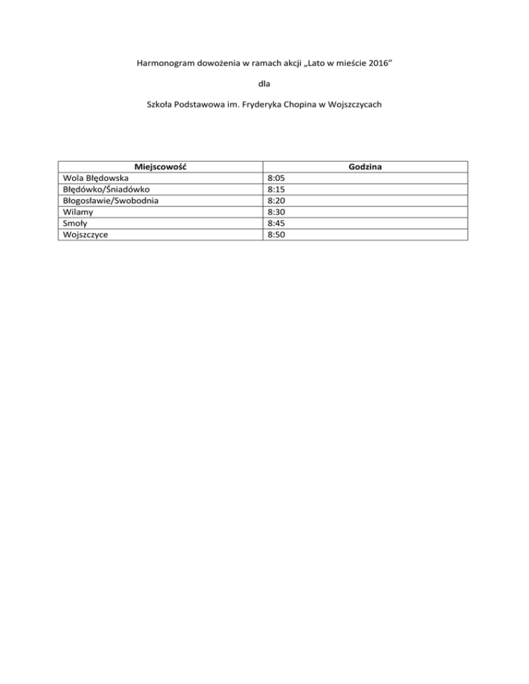 Harmonogram dowożenia w ramach akcji „Lato w mieście 2016” dla Szkoła Podstawowa im. Fryderyka Chopina w Wojszczycach Miejscowość Wola Błędowska Błędówko/Śniadówko Błogosławie/Swobodnia Wilamy Smoły Wojszczyce Godzina 8:05 8:15 8:20 8:30 8:45 8:50