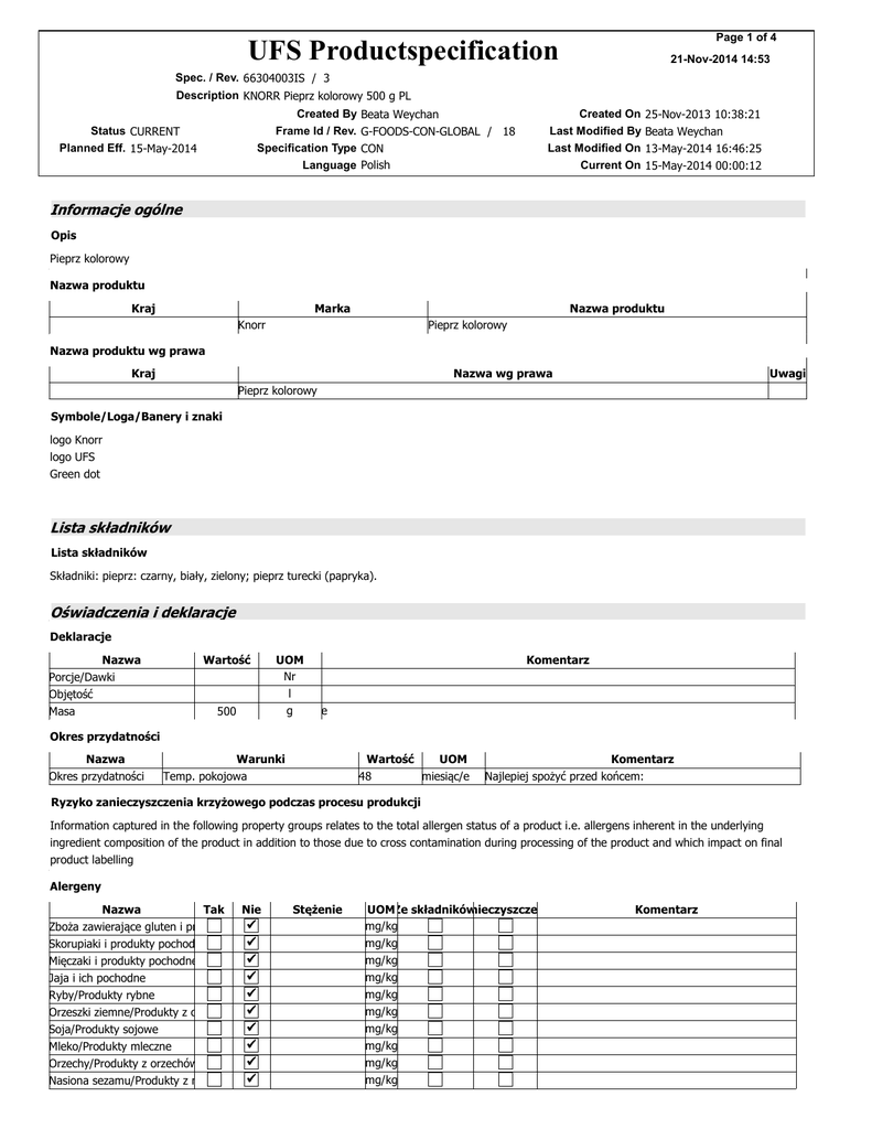 Page 1 of 4 UFS Productspecification 21-Nov-2014 14:53 Spec. / Rev. 66304003IS / 3 Description KNORR Pieprz kolorowy 500 g PL Created By Frame Id / Rev. Specification Type Language Status CURRENT Planned Eff. 15-May-2014 Beata Weychan G-FOODS-CON-GLOBAL / 18 CON Polish Created On Last Modified By Last Modified On Current On 25-Nov-2013 10:38:21 Beata Weychan 13-May-2014 16:46:25 15-May-2014 00:00:12 Informacje ogólne Opis Pieprz kolorowy Nazwa produktu Kraj Marka Nazwa produktu Knorr Pieprz kolorowy Nazwa produktu wg prawa Kraj Nazwa wg prawa Uwagi Pieprz kolorowy Symbole/Loga/Banery i znaki logo Knorr logo UFS Green dot Lista składników Lista składników Składniki: pieprz: czarny, biały, zielony; pieprz turecki (papryka). Oświadczenia i deklaracje Deklaracje Nazwa Porcje/Dawki Objętość Masa Wartość 500 UOM Nr l g Komentarz e Okres przydatności Nazwa Okres przydatności Warunki Temp. pokojowa Wartość UOM miesiąc/e 48 Komentarz Najlepiej spożyć przed końcem: Ryzyko zanieczyszczenia krzyżowego podczas procesu produkcji Information captured in the following property groups relates to the total allergen status of a product i.e. allergens inherent in the underlying ingredient composition of the product in addition to those due to cross contamination during processing of the product and which impact on final product labelling Alergeny Nazwa Tak Nie Stężenie Zboża zawierające gluten i produkty pochodne Skorupiaki i produkty pochodne Mięczaki i produkty pochodne Jaja i ich pochodne Ryby/Produkty rybne Orzeszki ziemne/Produkty z orzeszków ziemnych Soja/Produkty sojowe Mleko/Produkty mleczne Orzechy/Produkty z orzechów Nasiona sezamu/Produkty z nasion sezamu UOMZe składników Zanieczyszczenie mg/kg mg/kg mg/kg mg/kg mg/kg mg/kg mg/kg mg/kg mg/kg mg/kg Komentarz Page 2 of 4 UFS Productspecification 21-Nov-2014 14:53 Spec. / Rev. 66304003IS / 3 Description KNORR Pieprz kolorowy 500 g PL Created By Frame Id / Rev. Specification Type Language Status CURRENT Planned Eff. 15-May-2014 Beata Weychan G-FOODS-CON-GLOBAL / 18 CON Polish Created On Last Modified By Last Modified On Current On 25-Nov-2013 10:38:21 Beata Weychan 13-May-2014 16:46:25 15-May-2014 00:00:12 Alergeny [Continued] Nazwa Tak Nie Stężenie Siarczyny (=> 10mg/kg) Siarczyny (<10mg/kg) Seler Musztarda/Produkty z gorczycy Łubin i produkty pochodne UOMZe składników Zanieczyszczenie mg/kg mg/kg mg/kg mg/kg mg/kg Komentarz Diety - zagwarantowane Nazwa Wegańska Lakto-ovo-wegetariańska Lakto-wegetariańska Tak Nie Komentarz Tak Nie Komentarz Produkt wolny od: Nazwa Napromienianie Mięso Alkohol Meat acc. to Dir 2001/101/EC Deklaracje 500 g e Oświadczenia Nazwa Oświadczenie Oświadczenie Oświadczenie Oświadczenie Oświadczenie Oświadczenie Oświadczenie Oświadczenie Oświadczenie Oświadczenie Oświadczenie Oświadczenie Oświadczenie Oświadczenie Oświadczenie Opis 1. 2. 3. 4. 5. 6. 7. 8. 9. 10ŁATWE DOZOWANIE 11MASA NETTO 500 g 12. 13. 14. 15. Oświadczenia / Orzeczenia (FoP- serving suggestion next to the picture) Propozycja zastosowania Instrukcje Sposób przygotowania not applicable Warunki przechowywania Przechowywać w suchym, chłodnym i zaciemnionym miejscu. Uwagi Page 3 of 4 UFS Productspecification 21-Nov-2014 14:53 Spec. / Rev. 66304003IS / 3 Description KNORR Pieprz kolorowy 500 g PL Status CURRENT Planned Eff. 15-May-2014 Created By Frame Id / Rev. Specification Type Language Beata Weychan G-FOODS-CON-GLOBAL / 18 CON Polish Created On Last Modified By Last Modified On Current On 25-Nov-2013 10:38:21 Beata Weychan 13-May-2014 16:46:25 15-May-2014 00:00:12 Instrukcje bezpieczeństwa not applicable Utylizacja not applicable Informacje żywieniowe na opakowanie [Produkt wprowadzany do obrotu] Inf. żywieniowe na produkt wprowadzany do obrotu Nazwa Wielkość porcji 100 G Wartość Wartości Energia Energia Białko Węglowodany Węglowodany w tym Tłuszcz Tłuszcz w tym Błonnik Sód Woda Sól Cecha kJ kcal Cukry Kwasy nasycone Pokarmowy as NaCl Składniki odżywcze Energia Energia Białko Węglowodany Węglowodany w tym Tłuszcz Tłuszcz w tym Tłuszcz w tym Cholesterol Błonnik Sód Woda Sól Cecha kJ kcal Cukry Kwasy nasycone trans Pokarmowy as NaCl na 100 UOM g produktu wprowadzanegona do100 obrotu ml produktu kJ 1300 kcal 320 g 11 g 56 g 53 g 3,0 g 0,6 g 14 g 0,02 g 12 g 0,05 Wskazane dzienne spożycie 8400 2000 50 260 90 70 20 % 15 16 22 22 59 4 3 N/A N/A 6 <1 Reference Intake * % referencyjnej wartości spożycia dla przeciętnej osoby dorosłej (8400 kJ/2000 kcal) Informacje żywieniowe na opakowanie [Na przygotowany produkt] Reference Intake * % referencyjnej wartości spożycia dla przeciętnej osoby dorosłej (8400 kJ/2000 kcal) na porcję 1300 320 11 56 53 3,0 0,6 14 0,02 12 0,05 oznaczenie GDA GDA GDA GDA GDA GDA GDA GDA GDA GDA GDA GDA GDA UFS Productspecification Page 4 of 4 21-Nov-2014 14:53 Spec. / Rev. 66304003IS / 3 Description KNORR Pieprz kolorowy 500 g PL Status CURRENT Planned Eff. 15-May-2014 Created By Frame Id / Rev. Specification Type Language Dane kontaktowe Kontakt www.ufs.com Unilever Food Solutions Unilever Polska Sp. z o.o. Al. Jerozolimskie 134 02-305 Warszawa (phone symbol) 800 66 11 11 (pon. - pt. 8:00-16:00) Beata Weychan G-FOODS-CON-GLOBAL / 18 CON Polish Created On Last Modified By Last Modified On Current On 25-Nov-2013 10:38:21 Beata Weychan 13-May-2014 16:46:25 15-May-2014 00:00:12