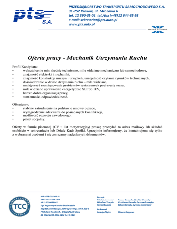 PRZEDSIĘBIORSTWO TRANSPORTU SAMOCHODOWEGO S.A. 31-752 Kraków, ul. Mrozowa 6 tel. 12 390-32-01 tel./fax (+48) 12 644-65-93 e-mail: [email protected] www.pts.auto.pl Oferta pracy - Mechanik Utrzymania Ruchu Profil Kandydata: • wykształcenie min. średnie techniczne, mile widziane mechaniczne lub samochodowe, • znajomość elektryki i mechaniki, • znajomość konstrukcji maszyn i urządzeń, umiejętność czytania rysunków technicznych, • doświadczenie w dziale utrzymania ruchu – mile widziane, • umiejętność rozwiązywania problemów technicznych pod presją czasu, • mile widziane uprawnienie energetyczne SEP do 1kV, • bardzo dobra organizacja pracy, • sumienność, odpowiedzialność. Oferujemy: • stabilne zatrudnienie na podstawie umowy o pracę, • wynagrodzenie adekwatne do posiadanych kwalifikacji, • możliwość rozwoju zawodowego, • pakiet socjalny. Oferty w formie pisemnej (CV + list motywacyjny) proszę przesyłać na adres mailowy lub składać osobiście w sekretariacie lub Dziale Kadr Spółki. Uprzejmie informujemy, że kontaktujemy się tylko z wybranymi osobami i nie zwracamy nadesłanych dokumentów. NIP: 678-005-60-30 REGON: 350361959 KRS: 0000088642 Sąd Rejonowy Kraków-Śródmieście Kapitał zakładowy w pełni opłacony: 1.054.800 zł PKO Bank Polski S.A., Oddział 6/Kraków 82 1020 2892 0000 5402 0411 9343 Zarząd: Michał Jurowski Wiesław Trzepla Tomasz Bogucki Prezes Zarządu, Dyrektor Generalny V-ce Prezes Zarządu, Dyrektor Operacyjny Członek Zarządu, Dyrektor Ekonomiczny Prokurenci: Jadwiga Piątek Główna Księgowa