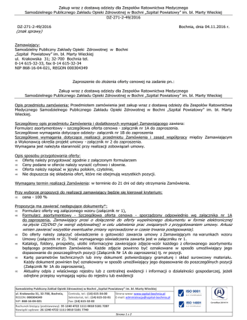 Zakup wraz z dostawą odzieży dla Zespołów Ratownictwa Medycznego Samodzielnego Publicznego Zakładu Opieki Zdrowotnej w Bochni „Szpital Powiatowy” im. bł. Marty Wieckiej DZ-271-2-49/2016 DZ-271-2-49/2016 Bochnia, dnia 04.11.2016 r. (znak sprawy) Zamawiający: Samodzielny Publiczny Zakłady Opieki Zdrowotnej w Bochni „Szpital Powiatowy” im. bł. Marty Wieckiej ul. Krakowska 31; 32-700 Bochnia tel. 0-14 615-32-33, fax 0-14 615-32-34 NIP 868-16-04-021, REGON 000304349 Zaproszenie do złożenia oferty cenowej na zadanie pn.: Zakup wraz z dostawą odzieży dla Zespołów Ratownictwa Medycznego Samodzielnego Publicznego Zakładu Opieki Zdrowotnej w Bochni „Szpital Powiatowy” im. bł. Marty Wieckiej Opis przedmiotu zamówienia: Przedmiotem zamówienia jest zakup wraz z dostawą odzieży dla Zespołów Ratownictwa Medycznego Samodzielnego Publicznego Zakładu Opieki Zdrowotnej w Bochni „Szpital Powiatowy” im. bł. Marty Wieckiej. Szczegółowy opis przedmiotu Zamówienia i dodatkowych wymagań Zamawiającego zawiera: Formularz asortymentowy – szczegółowa oferta cenowa - załącznik nr 1A do zaproszenia. Szczegółowe wymagania dotyczące odzieży- załącznik nr 1B do zaproszenia Szczegółowe wymagania dotyczące realizacji przedmiotu Zamówienia i zasad współpracy między Zamawiającym a Wykonawcą określa projekt umowy - załącznik nr 2 do zaproszenia. Wymagana jest należyta staranność przy realizacji zobowiązań umowy. Opis sposobu przygotowania oferty: • Ofertę należy przygotować zgodnie z załączonym formularzem • Ceny podane w ofercie należy wyrazić cyfrowo i słownie. • Oferta należy napisać w języku polskim, czytelnie, • Nie dopuszcza się składania ofert, które nie obejmują wszystkich pozycji. Wymagany termin realizacji Zamówienia: w terminie do 21 dni od daty otrzymania Zamówienia. Przy wyborze propozycji do realizacji zamawiający będzie się kierował kryterium: • cena - 100 % Propozycja ma zawierać następujące dokumenty*: • Formularz oferty wg załączonego wzoru (załącznik nr 1), • Formularz asortymentowy - Szczegółowa oferta cenowa - sporządzony odpowiednio wg załącznika nr 1A do zaproszenia. Zamawiający prosi o dołączenie do oferty wypełnionego dokumentu w formie elektronicznej na płycie CD/DVD (w wersji edytowalnej) w celu ułatwienia prac związanych z przygotowaniem umowy. Arkusz winien zawierać wszystkie ewentualne zmiany wprowadzone w czasie trwania postępowania). • • • • Do oferty należy załączyć oświadczenie o gotowości zawarcia umowy z Zamawiającym na warunkach wzoru Umowy (załącznik nr 2). Treść wymaganego oświadczenia zawarta jest w załączniku nr 1. Katalogi, foldery, prospekty, ulotki informacyjne zawierające zdjęcie-wzór każdego z oferowanego asortymentu będącego przedmiotem Zamówienia. Każde zdjęcie powinno być oznakowane w sposób umożliwiający jego dopasowanie do poszczególnych pozycji (Załącznik Nr 1A do zaproszenia) tj. nr pozycji. Kartę parametrów technicznych lub inny dokument potwierdzający gramaturę i skład surowcowy materiału. Każdy dokument powinien być oznakowany w sposób umożliwiający jego dopasowanie do poszczególnych pozycji (Załącznik Nr 1A do zaproszenia), Aktualny odpis z właściwego rejestru lub z centralnej ewidencji i informacji o działalności gospodarczej, jeżeli odrębne przepisy wymagają wpisu do rejestru lub ewidencji Samodzielny Publiczny Zakład Opieki Zdrowotnej w Bochni „Szpital Powiatowy” im. bł. Marty Wieckiej ul. Krakowska 31, 32-700, Bochnia, REGON: 000304349 NIP: 868-16-04-021 Centrala, tel.: (14) 615-34-00 Sekretariat, tel.: (14) 615-32-01 Fax: (14) 615-32-02 Strona www: www.szpital-bochnia.pl E-mail: [email protected] Rachunek bieżący (podstawowy): 35 1240 4722 1111 0010 5181 7287 Nawiązki sądowe: 26 1240 4722 1111 0010 5181 7740 Strona 1 z 2 Zakup wraz z dostawą odzieży dla Zespołów Ratownictwa Medycznego Samodzielnego Publicznego Zakładu Opieki Zdrowotnej w Bochni „Szpital Powiatowy” im. bł. Marty Wieckiej DZ-271-2-49/2016 UWAGA! • w przypadku wskazania przez Wykonawcę dostępności oświadczeń lub dokumentów, w formie elektronicznej pod określonymi adresami internetowymi ogólnodostępnych i bezpłatnych baz danych, Zamawiający pobiera samodzielnie z tych baz danych wskazane przez Wykonawcę oświadczenia lub dokumenty, • w przypadku wskazania przez Wykonawcę oświadczeń lub dokumentów, które znajdują się w posiadaniu Zamawiającego, korzysta z posiadanych oświadczeń lub dokumentów, o ile są one aktualne. Opis sposobu obliczania ceny w składanej propozycji cenowej: W cenę propozycji należy wliczyć: • Wartość dostawy określoną w oparciu o przedmiot zamówienia, • Obowiązujący podatek od towarów i usług. Cena podana przez zleceniobiorcę za świadczoną dostawę/usługę/robotę budowlaną jest obowiązująca przez okres ważności umowy i nie będzie podlegała waloryzacji w okresie jej trwania. Zamawiający wybierze ofertę odpowiadającą wszystkim postawionym przez niego wymogom i o najniższej cenie. Cena ofertowa jest ceną brutto i powinna obejmować wynagrodzenie za wszystkie obowiązki przyszłego Wykonawcy, niezbędne do zrealizowania przedmiotu zamówienia. Oznacza to, że cena ta musi zawierać wszystkie koszty związane z realizacją dostawy wynikające wprost, jak również nie ujęte a niezbędne do wykonania zadania tj. podatek VAT, koszty dostarczenia przedmiotu zamówienia do Zamawiającego. • Dla porównania ofert Zamawiający przyjmie cenę brutto obejmującą podatek od towarów i usług (VAT) za całość zamówienia. Określenie stawki podatku VAT jest obowiązkiem Wykonawcy. Cenę oferty należy podać w złotych polskich netto i brutto z uwzględnieniem stawki podatku VAT w „Ofercie cenowej (załącznik nr 1 do zaproszenia)” z zaokrągleniem do dwóch miejsc po przecinku. • Wszelkie rozliczenia związane z realiz