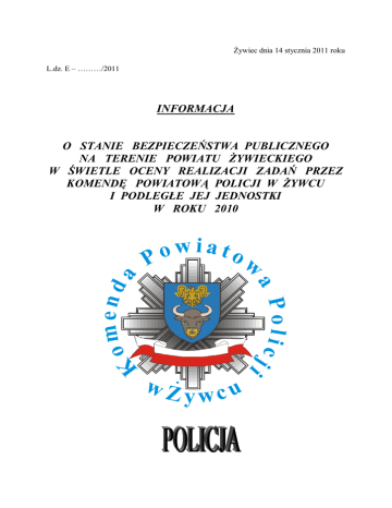 Żywiec dnia 14 stycznia 2011 roku L.dz. E – ………/2011 INFORMACJA O STANIE BEZPIECZEŃSTWA PUBLICZNEGO NA TERENIE POWIATU ŻYWIECKIEGO W ŚWIETLE OCENY REALIZACJI ZADAŃ PRZEZ KOMENDĘ POWIATOWĄ POLICJI W ŻYWCU I PODLEGŁE JEJ JEDNOSTKI W ROKU 2010 K olic j a P i e nd m o a wiato o P w wZ ywcu I. W ZAKRESIE PRZESTĘPCZOŚCI OGÓŁEM I PRZESTĘPCZOŚCI KRYMINALNEJ W 2010 ROKU. W rozpatrywanym okresie w KPP Żywiec wszczęto ogółem 2776 postępowań przygotowawczych tj. o 138 mniej jak w roku 2009, co daje dynamikę na poziomie 95,7 %. Stwierdzono 3286 przestępstw ogółem / dynamika 112,0 %/, osiągając wskaźnik wykrycia przestępstw ogółem na poziomie 70,7 % tj. o 2,2% więcej jak w ubiegłym roku. Najbardziej zagrożonymi przestępczością ogółem są : Komisariat Policji w Gilowicach – dynamika wszczęć 102,9% i Komisariat Policji w Węgierskiej Górce –dynamika 102,4%. W zakresie przestępczości kryminalnej wszczęto 1853 postępowania przygotowawcze tj. o 40 mniej jak w 2009r –dynamika 97,9%. Wzrost dynamiki w tym zakresie odnotowano w KP Gilowice119,9%, w KP Jeleśnia-101,6%, w KP Rajcza- 101,8% i w KP Węgierska Górka-106,6%. Spadek dynamiki wszczęć nastąpił w Żywcu- 87,5% oraz w KP Łodygowice -96,8%. W zakresie przestępczości kryminalnej osiągnięto wskaźnik wykrycia na poziomie 52,5% tj. o 2,9% więcej jak w 2009r. W poszczególnych kategoriach przestępczości kryminalnej uzyskano następujące efekty: W kategorii przestępstw p-ko mieniu odnotowano spadek dynamiki postępowań wszczętych- 99,6% , wzrost dynamiki przestępstw stwierdzonych – 130,6% -przy wykrywalności 52,2 % - wzrost o 13,5%. W kategorii kradzieży odnotowano wzrost dynamiki wszczęć – 107,0%, wzrost dynamiki p-stw stwierdzonych -115,6% , przy wykrywalności 26,7 % -wzrost o 5,2%. W kategorii kradzieży z włamaniem odnotowano dynamikę wszczęć na poziomie 111,6%, dynamika p-stw stwierdzonych na poziomie 124,0% , przy wykrywalności 30,1%.- wzrost o 13,5%. W kategorii bójki-pobicia wszczęto 31 postępowań –dynamika 100,0% , odnotowano spadek liczby przestępstw stwierdzonych z 56 do 37 –dynamika 66,1%, osiągając wskaźnik wykrycia sprawców na poziomie 78,4% - o 14,5 % mniej jak w roku 2009r. W zakresie przestępstw rozbójniczych odnotowano spadek dynamiki wszczęć – 72,2% , stwierdzono 29 przestępstw –dynamika 56,0% , osiągnięto wskaźnik wykrycia na poziomie 51,7 % - spadek o 22,9%. W 2010r wzrosła liczba ujawnionych przestępstw narkotykowych – wskaźnik dynamiki 183,8%. Tak jak w latach ubiegłych prognozowany jest dalszy wzrost liczby przestępstw narkotykowych , co jest wynikiem dużej aktywności policjantów w zakresie ujawniania osób zajmujących się handlem narkotykami . W okresie 2010r ujawniono 98 nieletnich , którzy popełnili 110 przestępstw, w tym m.in.3 rozboje, 18 kradzieży , 7 kradzieży z włamaniem oraz 8 przestępstw narkotykowych. 2 II. W ZAKRESIE BEZPIECZEŃSTWA NA DROGACH POWIATU ŻYWIECKIEGO W roku 2010 na drogach Żywiecczyzny zaistniało 248 (265) wypadków drogowych, co w porównaniu z rokiem 2009 daje dynamikę rzędu 93,6. W wyniku tych zdarzeń 295 (324) uczestników zostało rannych (dynamika 91). Zabitych zostało 11 (11) osób, co daje dynamikę rzędu 100. Odnotowano ponadto 1340 (1186) kolizji drogowych – dynamika 113. Dane za ostatnie pięć lat przedstawia poniższy wykres: Zdarzenia drogowe 1600 1340 1400 1186 1151 1049 1200 926 1000 Rok 2006 800 Rok 2007 Rok 2008 600 Rok 2009 Rok 2010 400 275 287 270 265 248 200 0 Wypadki Kolizje Liczba wypadków w latach 2006-2010 oscylowała w granicach od 248 w roku 2010 do 287 w roku 2007. Średnia wypadków drogowych w omawianym okresie to 269 zdarzeń tej kategorii na rok. Za pozytyw uznać należy, że począwszy od roku 2007 liczba zdarzeń drogowych omawianej kategorii systematycznie spada. W zakresie kolizji drogowych są to liczby w przedziale od 926 w roku 2008 do 1340 w roku 2010. Niestety począwszy od roku 2008 liczba zdarzeń drogowych bez osób rannych systematycznie wzrasta. Średnia roczna kolizji drogowych w omawianym okresie to 1130. WYPADKI DROGOWE SPOWODOWANE PRZEZ KIERUJĄCYCH. Kierujący pojazdami spowodowali w 2010 roku 201 (222)wypadków drogowych. Najczęstszymi przyczynami zdarzeń tej kategorii było: 3 - niedostosowanie prędkości do warunków ruchu - 77 (80) wypadków ( przy dynamice 96,3). Jest to przyczyna 38 % wypadków spowodowanych przez kierujących. - nie udzielenie pierwszeństwa przejazdu - 39 (36) wypadków (dynamika 108,3). Jest to przyczyna 19 % wypadków spowodowanych przez kierujących. Dane liczbowe za okres pięcioletni przedstawia poniższy wykres: Główne przyczyny wypadków drogowych 100 89 90 83 80 80 77 70 60 55 44 50 34 40 38 36 39 Rok 2006 Rok 2007 Rok 2008 Rok 2009 Rok 2010 30 20 10 0 Prędkoś ć Pierwszeństwo przejazdu Analiza przedstawionych danych prowadzi do wniosku, że w dalszym ciągu niedostosowanie prędkości do warunków ruchu stanowi główną przyczynę wypadków drogowych w powiecie żywieckim a ich liczba (pomimo obserwowanej od roku 2007 stałej tendencji spadkowej) utrzymuje się na wysokim poziomie. Liczba wypadków zaistniałych z tej przyczyny jest ponad dwukrotnie wyższa, niż liczba zdarzeń powstałych z powodu nieudzielenia pierwszeństwa przejazdu (drugiej w kolejności przyczyny wypadków). Średnia roczna wypadków spowodowanych niedostosowaniem prędkości do warunków ruchu to 77. Konieczne jest więc kontynuowanie zdecydowanych działań, ukierunkowanych na rozliczanie użytkowników dróg nie stosujących się do ograniczeń prędkości. W ich trakcie należy w sposób maksymalny wykorzystywać w służbie pojazd z videorejestratorem oraz ręczne mierniki służące do pomiaru prędkości pojazdów. WYPADKI ZE SKUTKIEM ŚMIERTELNYM: W 2010 roku na drogach Żywiecczyzny zaistniało 11 (11) wypadków drogowych ze skutkiem śmiertelnym, w których śmierć poniosło 11 (11 )osób