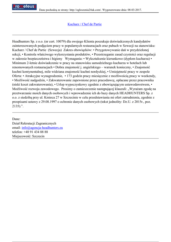 Dane pochodzą ze strony: http://ogloszenia24uk.com/. Wygenerowano dnia: 08-03-2017. Kucharz / Chef de Partie Headhunters Sp. z o.o. (nr cert. 10079) dla swojego Klienta poszukuje doświadczonych kandydatów zainteresowanych podjęciem pracy w popularnych restauracjach oraz pubach w Szwecji na stanowisku: Kucharz / Chef de Partie (Szwecja) Zakres obowiązków: • Przygotowywanie dań w przydzielonej sekcji, • Kontrola właściwego wykorzystania produktów, • Przestrzeganie zasad czystości oraz regulacji w zakresie bezpieczeństwa i higieny Wymagania: • Wykształcenie kierunkowe (dyplom kucharza) • Minimum 2-letnie doświadczenie w pracy na stanowisku samodzielnego kucharza w hotelach lub renomowanych restauracjach • Dobra znajomość j. angielskiego – warunek konieczny, • Znajomość kuchni kontynentalnej, mile widziana znajomość kuchni nordyckiej, • Umiejętność pracy w zespole Oferta: • Atrakcyjne wynagrodzenie, • 173 godzin pracy miesięcznie z możliwością pracy w weekendy, • Możliwość nadgodzin, • Zakwaterowanie zapewnione przez pracodawcę, opłacane przez pracownika (niski koszt zakwaterowania), • Urlop wypoczynkowy zgodnie z obowiązującym ustawodawstwem, • Możliwość rozwoju zawodowego. Prosimy o zamieszczenie następującej klauzuli: „Wyrażam zgodę na przetwarzanie moich danych osobowych i wprowadzenie ich do bazy danych HEADHUNTERS Sp. z o.o. z siedzibą przy ul. Kmieca 27 w Szczecinie w celu przedstawiania mi ofert zatrudnienia, zgodnie z przepisami ustawy z 29.08.1997 o ochronie danych osobowych (tekst jednolity: Dz.U. z 2015r., poz. 2135).”. Dane: Dział Rekrutacji Zagranicznych email: [email protected] telefon: +48 91 434 88 88 Miejscowość: Szczecin