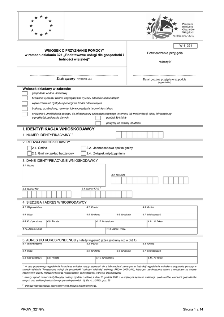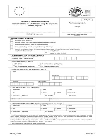 W-1_321 WNIOSEK O PRZYZNANIE POMOCY* w ramach działania 321 „Podstawowe usługi dla gospodarki i ludności wiejskiej” ............................................................................................. Znak sprawy Potwierdzenie przyjęcia /pieczęć/ .................................................................. (wypełnia UM) Data i godzina przyjęcia oraz podpis (wypełnia UM) Wniosek składany w zakresie: gospodarki wodno -ściekowej tworzenia systemu zbiórki, segregacji lub wywozu odpadów komunalnych wytwarzania lub dystrybucji energii ze źródeł odnawialnych budowy, przebudowy, remontu lub wyposażenia targowiska stałego tworzenia i umożliwienia dostępu do infrastruktury szerokopasmowego Internetu lub modernizacji takiej infrastruktury o prędkości pobierania danych: poniżej 30 Mbit/s powyżej lub równej 30 Mbit/s I. IDENTYFIKACJA WNIOSKODAWCY 1. NUMER IDENTYFIKACYJNY 1 12 2. RODZAJ WNIOSKODAWCY 2.1. Gmina 2.2. Jednoosobowa spółka gminy 2.3. Gminny zakład budżetowy 2.4. Związek międzygminny 3. DANE IDENTYFIKACYJNE WNIOSKODAWCY 3.1. Nazwa 3.2. REGON 3.4. Numer KRS 3.3. Numer NIP 2 1 4. SIEDZIBA I ADRES WNIOSKODAWCY 4.1. Województwo 4.2. Powiat 4.4. Ulica 4.5. Nr domu 4.8. Kod pocztowy 4.9. Poczta 4.3. Gmina 4.6. Nr lokalu 4.10. Nr telefonu 4.12. Adres e-mail 4.7. Miejscowość 4.11. Nr faksu 4.13. Adres www. 5. ADRES DO KORESPONDENCJI ( należy wypełnić jeżeli jest inny niż w pkt 4) 5.1. Województwo 5.2. Powiat 5.4. Ulica 5.5. Nr domu 5.8. Kod pocztowy 5.9. Poczta 5.10. Nr telefonu 5.3. Gmina 5.6. Nr lokalu 5.7. Miejscowość 5.11. Nr faksu * W celu poprawnego wypełnienia formularza wniosku należy zapoznać się z informacjami zawartymi w Instrukcji wypełniania wniosku o przyznanie pomocy w ramach działania "Podstawowe usługi dla gospodarki i ludności wiejskiej" objętego PROW 2007-2013, która jest zamieszczona razem z wnioskiem na stronie internetowej urzędu marszałkowskiego / wojewódzkiej samorządowej jednostki organizacyjnej. 1 Należy wpisać numer identyfikacyjny nadany zgodnie z ustawą z dnia 18 grudnia 2003 r. o krajowym systemie ewidencji producentów, ewidencji gospodarstw rolnych oraz ewidencji wniosków o przyznanie płatności t.j. Dz. U. z 2012r. poz. 86 2 Dotyczy jednoosobowej spółki gminy oraz związku międzygminnego. PROW_321/9/z Strona 1 z 14 6. DANE OSÓB UPOWAŻNIONYCH DO REPREZENTOWANIA WNIOSKODAWCY 6.1.1. Imię 6.1.2. Nazwisko 6.1.3. Stanowisko/Funkcja 6.2.1. Imię 6.2.2. Nazwisko 6.2.3. Stanowisko/Funkcja 6.3.1. Imię 6.3.2. Nazwisko 6.3.3. Stanowisko/Funkcja 7. DANE PEŁNOMOCNIKA WNIOSKODAWCY 7.1. Nazwisko/Nazwa 7.2. Imię 7.4. Województwo 7.5. Powiat 7.7. Ulica 7.8. Nr domu 7.11. Kod pocztowy 7.12. Poczta 7.3. Stanowisko/Funkcja 7.6. Gmina 7.9. Nr lokalu 7.10. Miejscowość 7.13. Nr telefonu 7.14. Nr faksu 7.15. Adres e-mail 8. DANE OSOBY UPRAWNIONEJ DO KONTAKTU 8.1. Nazwisko 8.2. Imię 8.4. Nr telefonu 8.3. Stanowisko/Funkcja 8.5. Nr faksu 8.6. Adres e-mail II. OPIS OPERACJI 9. TYTUŁ OPERACJI 10. PLANOWANY CEL OPERACJI 11. MIEJSCE REALIZACJI OPERACJI 11.1. Województwo 11.4.1. Miejscowość A 11.4.2. Liczba mieszkańców 11.3. Gmina 11.4.3. Kod pocztowy 11.4.4. Poczta 11.4.5. Ulica/oznaczenie działki 11.5.1. Miejscowość B 11.2. Powiat 11.4.6. Nr domu 11.5.2. Liczba mieszkańców 11.5.3. Kod pocztowy 11.5.4. Poczta 11.5.5. Ulica/oznaczenie działki 11.6.1. Miejscowość C 11.6.5. Ulica/oznaczenie działki PROW_321/9/z 11.5.6. Nr domu 11.6.2. Liczba mieszkańców 11.6.3. Kod pocztowy 11.6.4. Poczta 11.6.6. Nr domu Strona 2 z 14 11.7.1. Miejscowość 11.7.2. Liczba mieszkańców 11.7.3. Kod pocztowy 11.7.4. Poczta D 11.7.5. Ulica/oznaczenie działki 11.8.1. Miejscowość E 11.8.2. Liczba mieszkańców 11.8.3. Kod pocztowy 11.8.4. Poczta 11.8.5. Ulica/oznaczenie działki 11.9.1. Miejscowość F 11.7.6. Nr domu 11.8.6. Nr domu 11.9.2. Liczba mieszkańców 11.9.3. Kod pocztowy 11.9.4. Poczta 11.9.5. Ulica/oznaczenie działki 11.10.1. Miejscowość 11.9.6. Nr domu 11.10.2. Liczba mieszkańców 11.10.3. Kod pocztowy 11.10.4. Poczta G 11.10.5. Ulica/oznaczenie działki 11.10.6. Nr domu 12. OBSZAR, NA KTÓRYM BĘDZIE REALIZOWANA OPERACJA 12.1. gmina wiejska 12.2. gmina miejsko-wiejska, z wyłączeniem miast liczących powyżej 5 000 mieszkańców 12.3. gmina miejska, z wyłączeniem miejscowości liczących powyżej 5 000 mieszkańców 12.4. miejscowość licząca nie więcej niż 50 000 mieszkańców 13. ZAKRES I KOSZTY OPERACJI Wyszczególnienie Całkowity koszt (w zł) Koszty kwalifikowalne (w zł) 13.1. gospodarka wodno-ściekowa: 13.1.1. zaopatrzenie w wodę 13.1.2. odprowadzanie i oczyszczanie ścieków 13.2. tworzenie systemu zbiórki, segregacji lub wywozu odpadów komunalnych 13.3. wytwarzanie lub dystrybucja energii ze źródeł odnawialnych, w szczególności: 13.3.1. wiatru 13.3.2. wody 13.3.3. energii geotermalnej 13.3.4. słońca 13.3.5. biogazu albo biomasy 13.3.6. inne (jakie?) ……………………… 13.4. targowisko stałe 13.4.1. budowa 13.4.2. przebudowa, remont lub wyposażenie 13.5. Szerokopasmowy dostęp do Internetu, w tym: 13.5.1. tworzenie i umożliwienie dostępu do infrastruktury szerokopasmowego Internetu 13.5.2. modernizacja infrastruktury szerokopasmowego Internetu 13.6. Razem (suma kwot pkt 13.1.1. - 13.5.2.) PROW_321/9/z Strona 3 z 14 14. PLANOWANY TERMIN ZAKOŃCZENIA ETAPU OPERACJI (miesiąc/rok) _ 14.1. Etap I 14.2. Etap II _ III. PLAN FINANSOWY OPERACJI 15. KOSZTY REALIZACJI OPERACJI Rodzaje kosztów Całkowity koszt operacji Koszty kwalifikowalne (w zł) operacji (w zł) 15.1. Koszty inwestycyjne 15.2. Koszty ogólne 15.3. Koszty realizacji operacji (suma kwot pkt 15.1. - 15.2.) 16. KOSZTY KWALIFIKOWALNE ETAPÓW OPERACJI (w zł) 16.1. Koszty kwalifikowalne I etapu operacji 16.2. Koszty kwalifikowalne II etapu operacji 16.3. Koszty kwalifikowalne (suma kwot pkt 16.1. - 16.2.) 17. POZIOM WSPÓŁFINANSOWANIA OPERACJI 17.1. Maksymalny poziom dofinansowania: 17.1.1. w zakre