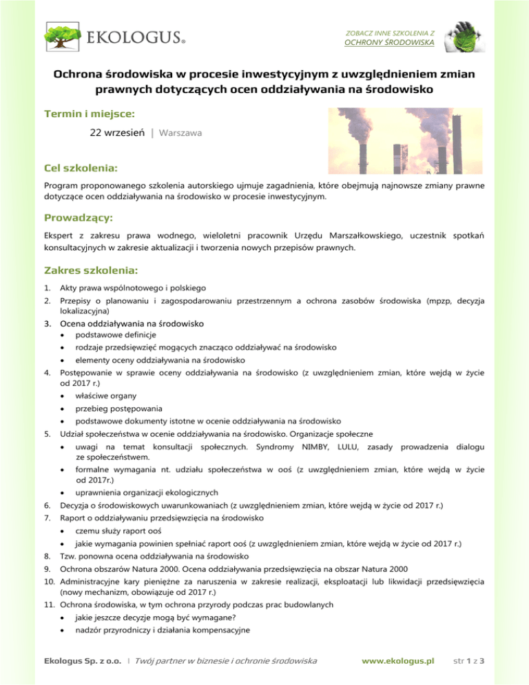 ZOBACZ INNE SZKOLENIA Z OCHRONY ŚRODOWISKA Ochrona środowiska w procesie inwestycyjnym z uwzględnieniem zmian prawnych dotyczących ocen oddziaływania na środowisko Termin i miejsce: 22 wrzesień | Warszawa Cel szkolenia: Program proponowanego szkolenia autorskiego ujmuje zagadnienia, które obejmują najnowsze zmiany prawne dotyczące ocen oddziaływania na środowisko w procesie inwestycyjnym. Prowadzący: Ekspert z zakresu prawa wodnego, wieloletni pracownik Urzędu Marszałkowskiego, uczestnik spotkań konsultacyjnych w zakresie aktualizacji i tworzenia nowych przepisów prawnych. Zakres szkolenia: 1. Akty prawa wspólnotowego i polskiego 2. Przepisy o planowaniu i zagospodarowaniu przestrzennym a ochrona zasobów środowiska (mpzp, decyzja lokalizacyjna) 3. Ocena oddziaływania na środowisko 4. 5. podstawowe definicje rodzaje przedsięwzięć mogących znacząco oddziaływać na środowisko elementy oceny oddziaływania na środowisko Postępowanie w sprawie oceny oddziaływania na środowisko (z uwzględnieniem zmian, które wejdą w życie od 2017 r.) właściwe organy przebieg postępowania podstawowe dokumenty istotne w ocenie oddziaływania na środowisko Udział społeczeństwa w ocenie oddziaływania na środowisko. Organizacje społeczne uwagi na temat konsultacji społecznych. Syndromy NIMBY, LULU, ze społeczeństwem. zasady prowadzenia dialogu formalne wymagania nt. udziału społeczeństwa w ooś (z uwzględnieniem zmian, które wejdą w życie od 2017r.) uprawnienia organizacji ekologicznych 6. Decyzja o środowiskowych uwarunkowaniach (z uwzględnieniem zmian, które wejdą w życie od 2017 r.) 7. Raport o oddziaływaniu przedsięwzięcia na środowisko czemu służy raport ooś jakie wymagania powinien spełniać raport ooś (z uwzględnieniem zmian, które wejdą w życie od 2017 r.) 8. Tzw. ponowna ocena oddziaływania na środowisko 9. Ochrona obszarów Natura 2000. Ocena oddziaływania przedsięwzięcia na obszar Natura 2000 10. Administracyjne kary pieniężne za naruszenia w zakresie realizacji, eksploatacji lub likwidacji przedsięwzięcia (nowy mechanizm, obowiązuje od 2017 r.) 11. Ochrona środowiska, w tym ochrona przyrody podczas prac budowlanych jakie jeszcze decyzje mogą być wymagane? nadzór przyrodniczy i działania kompensacyjne Ekologus Sp. z o.o. | Twój partner w biznesie i ochronie środowiska www.ekologus.pl str 1 z 3 ZOBACZ INNE SZKOLENIA Z OCHRONY ŚRODOWISKA 12. Ochrona środowiska po zakończeniu robót budowlanych zezwolenia emisyjne analiza porealizacyjna przeglądy ekologiczne Na zakończenie każdy uczestnik otrzymuje imienne zaświadczenie o udziale w szkoleniu oraz 10-dniowe mailowe konsultacje z wykładowcą po zakończeniu szkolenia. Cena: TERMIN SZKOLENIA 22.09 | Warszawa CENA netto/os CENA ZAWIERA (szkolenie bez noclegu): udział w szkoleniu, komplet materiałów drukowanych, zaświadczenie imienne potwierdzające udział w szkoleniu, 10-dniowe darmowe mailowe konsultacje z wykładowcą po zakończeniu szkolenia 700 zł +VAT* * Zwolnienie z podatku VAT w przypadku finansowania szkolenia co najmniej w 70% ze środków publicznych (Art. 43 ust. 1 pkt. 29 Ustawy o VAT) wyżywienie: obiady i przerwy kawowe. Istnieje możliwość rezerwacji noclegu – opcja dodatkowo płatna Rabaty: DLA STAŁYCH KLIENTÓW FIRST MINUTE UPUST NALICZANY INDYWIDUALNE -10% PRZY ZGŁOSZENIU DLA OSÓB/PRZEDSIĘBIORSTW, KTÓRE DO 42 DNI (6 TYGODNI) PRZED KORZYSTAJĄ Z NASZYCH USŁUG ROZPOCZĘCIEM SZKOLENIA DLA GRUPY 3+ -50% DLA CO TRZECIEJ OSOBY ZGŁOSZONEJ Z TEJ SAMEJ FIRMY/INSTYTUCJI UWAGA! Rabaty naliczane od cen podstawowych (bez noclegu). Rabaty nie sumują się. Warunkiem uczestnictwa w szkoleniu jest przesłanie do Ekologus Sp. z o.o. wypełnionego formularza zgłoszenia. W ciągu kolejnych 2 dni roboczych nasi pracownicy potwierdzą przyjęcie zgłoszenia. Organizator zastrzega sobie prawo do dokonywania modyfikacji programu lub terminu szkolenia w merytorycznie uzasadnionych przypadkach. O zmianach uczestnik zostanie poinformowany mailowo oraz telefonicznie. ZOBACZ HARMONOGRAM SZKOLEŃ ZAPRASZAMY DO KONTAKTU Z DZIAŁEM SZKOLEŃ NASI SPECJALIŚCI SĄ DO PAŃSTWA DYSPOZYCJI tel.: (33) 496 03 00, wewn. 15 i 20 fax: (33) 496 03 22 kom: e-mail: 606 914 909, 575 914 909 [email protected] A MOŻE SZKOLENIE ZAMKNIĘTE? Jeśli jesteś zainteresowany danym tematem w formie szkolenia zamkniętego napisz do nas. Dobierzemy indywidualnie do potrzeb Klienta zakres, termin i lokalizację szkolenia. KARTA ZGŁOSZENIA NA OSTATNIEJ STRONIE Ekologus Sp. z o.o. | Twój partner w biznesie i ochronie środowiska www.ekologus.pl str 2 z 3 KARTA ZGŁOSZENIA UDZIAŁU W SZKOLENIU Przesłana uzupełniona karta zgłoszenia stanowi umowę uczestnictwa w szkoleniu oraz oznacza akceptację poniższych warunków Warunki uczestnictwa: Podstawą udziału w szkoleniu jest przesłania faxem lub pocztą elektroniczną wypełnionej karty zgłoszenia w terminie do 7 dni roboczych przed rozpoczęciem szkolenia oraz dokonanie wpłaty do 3 dni przed szkoleniem na konto nr: 63 1090 1740 0000 0001 0246 2320 (BZ WBK S.A. O/Bielsko-Biała). W tytule przelewy należy wpisać imię i nazwisko uczestnika szkolenia oraz nr NIP Instytucji zgłaszającej. Zgłaszający upoważnia Ekologus Sp. z o.o. – NIP 547-19-40-780, do wystawienia faktury VAT bez podpisu osoby upoważnionej. Warunki rezygnacji: 1. Rezygnacja musi nastąpić w formie pisemnej w terminie do 7 dni roboczych przed szkoleniem, aby uzyskać zwrot wpłaconej opłaty. 2. W przypadku otrzymania rezygnacji w terminie krótszym niż 7 dni roboczych przed szkoleniem, Zgłaszający zobowiązany będzie do zapłaty pełnej opłaty za szkolenie. Nieobecność na szkoleniu nie zwalnia z konieczności uiszczenia opłaty. 3. Organizator zastrzega sobie prawo do zmiany terminu i miejsca szkolenia ze względów organizacyjnych lub wyznaczenia równoważnego zastępstwa w przypadku, gdy wykładowca nie będzie mógł poprowadzić zajęć z prz