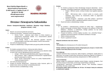 Biuro Podróży Magna Mundi s.c. Michał Poździk & Paweł Rembisz 22-400 Zamość, ul. Zagłoby 10, pok. 37 (00 48) 575 745 000 [email protected] www.magnamundi.pl Drezno i Szwajcaria Saksońska Drezno – Szwajcaria Saksońska – Budziszyn – Wrocław – Książ – Świdnica (program ramowy - 4 dni) I dzień: Wyjazd we wczesnych godzinach porannych. Przejazd do Wrocławia - zwiedzanie stolicy Dolnego Śląska: o Ostrów Tumski - najstarsza część miasta, na której skupione są najważniejsze wrocławskie zabytki, m.in. monumentalna gotycka katedra św. Jana Chrzciciela, o Rynek Starego Miasta z XIII wiecznym gotyckim ratuszem, przypominającym swą bryłą zamek książęcy i kościół równocześnie. Czas wolny do dyspozycji grupy. Przejazd na obiadokolację i nocleg do hotelu przy granicy polsko-niemieckiej. II dzień: Po śniadaniu przejazd do Drezna - historycznej stolicy Saksonii. Zwiedzanie drezdeńskiej starówki całkowicie zniszczonej przez alianckie naloty w czasie II WŚ i wiernie odbudowanej po jej zakończeniu: o Zwinger - XVIII-wieczny późnobarokowy pałac Augusta II Mocnego, o Opera Sempera - jeden z najbardziej renomowanych i najpiękniejszych gmachów operowych na świecie, o Spacer ulicami historycznego centrum do zamku Residenzschloß – rezydencji książąt Saksonii. Czas wolny do dyspozycji grupy. Przejazd do Bautzen (Budziszyna) - historycznej stolicy Łużyczan, gdzie na każdym kroku można się natknąć na słowiańską obecność. Powrót do hotelu na obiadokolację i nocleg. III dzień: Po śniadaniu przejazd do Parku Narodowego Szwajcarii Saksońskiej - terenu słynącego z niezwykłych krajobrazów, majestatycznych skał i licznych zamków: o Stolpen - 800-letni zamek, w którym hrabina Cosel spędziła większość życia, o Bastei - 300-metrowe skały z ruinami zamku na szczycie, punkt widokowy, skąd roztacza się niesamowity widok na pogranicze niemiecko-czeskie, o Twierdza Konigstein - budowana przez kilka wieków z ogromnym rozmachem, jedna z największych górskich twierdz w Europie. Powrót do hotelu na obiadokolację i nocleg. IV dzień: Po śniadaniu i wykwaterowaniu przejazd do zamku Książ – największego obiektu warownego na Dolnym Śląsku i trzeciego co do wielkości w Polsce (po Malborku i Wawelu), w podziemiach, którego podobno ma być ukryta legendarna Bursztynowa Komnata. Przejazd do Świdnicy, w której znajduje się jeden z tzw. „Kościołów Pokoju” największa drewniana budowla o charakterze sakralnym w Europie. Obiad w drodze powrotnej. Powrót w godzinach nocnych. Kolejność zwiedzania może ulec zmianie. Cena: -725 zł/osobę (cena obowiązuje przy 44 osobach płacących) Istnieje możliwość zorganizowania imprezy integracyjnej przy muzyce w trzecim dniu wyjazdu. Koszt takiej imprezy to 65 zł na osobę. Cena obejmuje: -przejazd autokarem klasy turystycznej, opłaty drogowe i parkingowe, opiekę pilota na całej trasie, trzy noclegi w hotelu klasy turystycznej, posiłki wg. programu (3 śniadania, 3 obiadokolacje, obiad w drodze powrotnej), ubezpieczenie KL i NNW, podatek VAT Cena nie obejmuje: -biletów wstępu do zwiedzanych obiektów (zamek Stolpen, twierdza Konigstein, Park Narodowy Szwajcarii Saksońskiej, zamek Książ, Kościół Pokoju w Świdnicy) -wynagrodzenia miejscowych przewodników (Drezno, Park Narodowy Szwajcarii Saksońskiej, Wrocław, zamek Książ) Na powyższe opłaty należy przewidzieć ok. 25 Euro i 45 złotych. Kwoty do rozliczenia na zakończenie wyjazdu.