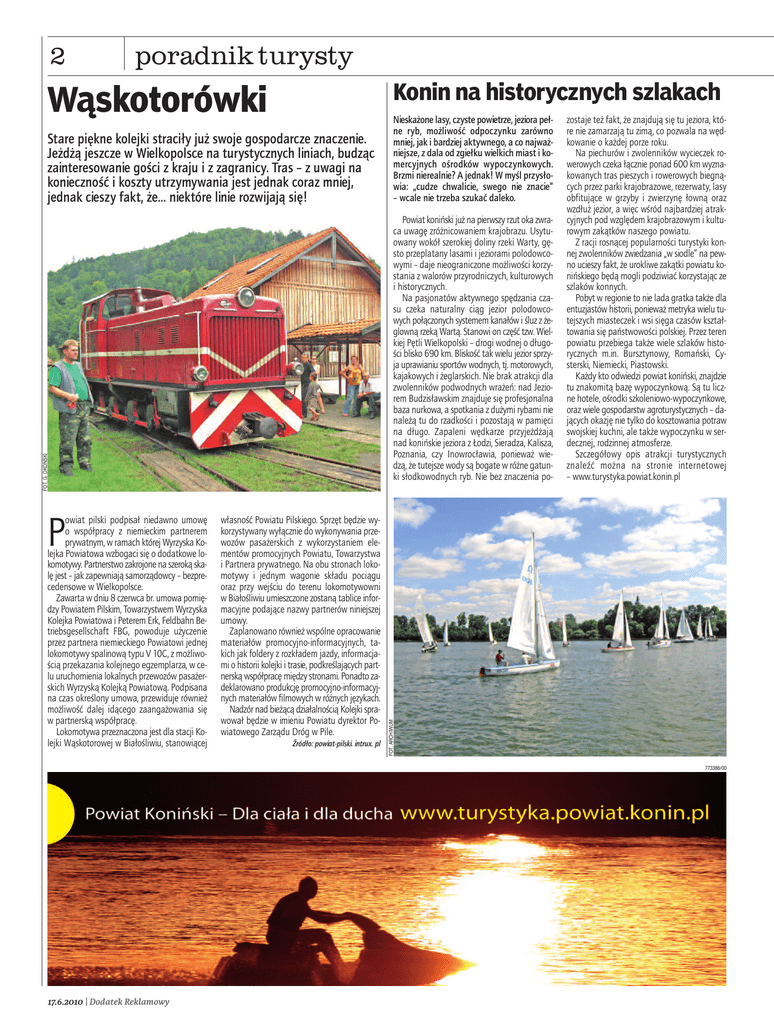 2 poradnik turysty Konin na historycznych szlakach Wąskotorówki Nieskażone lasy, czyste powietrze, jeziora pełne ryb, możliwość odpoczynku zarówno mniej, jak i bardziej aktywnego, a co najważniejsze, z dala od zgiełku wielkich miast i komercyjnych ośrodków wypoczynkowych. Brzmi nierealnie? A jednak! W myśl przysłowia: „cudze chwalicie, swego nie znacie” – wcale nie trzeba szukać daleko. Stare piękne kolejki straciły już swoje gospodarcze znaczenie. Jeżdżą jeszcze w Wielkopolsce na turystycznych liniach, budząc zainteresowanie gości z kraju i z zagranicy. Tras – z uwagi na konieczność i koszty utrzymywania jest jednak coraz mniej, jednak cieszy fakt, że... niektóre linie rozwijają się! owiat pilski podpisał niedawno umowę o współpracy z niemieckim partnerem prywatnym, w ramach której Wyrzyska Kolejka Powiatowa wzbogaci się o dodatkowe lokomotywy. Partnerstwo zakrojone na szeroką skalę jest – jak zapewniają samorządowcy – bezprecedensowe w Wielkopolsce. Zawarta w dniu 8 czerwca br. umowa pomiędzy Powiatem Pilskim, Towarzystwem Wyrzyska Kolejka Powiatowa i Peterem Erk, Feldbahn Betriebsgesellschaft FBG, powoduje użyczenie przez partnera niemieckiego Powiatowi jednej lokomotywy spalinową typu V 10C, z możliwością przekazania kolejnego egzemplarza, w celu uruchomienia lokalnych przewozów pasażerskich Wyrzyską Kolejką Powiatową. Podpisana na czas określony umowa, przewiduje również możliwość dalej idącego zaangażowania się w partnerską współpracę. Lokomotywa przeznaczona jest dla stacji Kolejki Wąskotorowej w Białośliwiu, stanowiącej P własność Powiatu Pilskiego. Sprzęt będzie wykorzystywany wyłącznie do wykonywania przewozów pasażerskich z wykorzystaniem elementów promocyjnych Powiatu, Towarzystwa i Partnera prywatnego. Na obu stronach lokomotywy i jednym wagonie składu pociągu oraz przy wejściu do terenu lokomotywowni w Białośliwiu umieszczone zostaną tablice informacyjne podające nazwy partnerów niniejszej umowy. Zaplanowano również wspólne opracowanie materiałów promocyjno-informacyjnych, takich jak foldery z rozkładem jazdy, informacjami o historii kolejki i trasie, podkreślających partnerską współpracę między stronami. Ponadto zadeklarowano produkcję promocyjno-informacyjnych materiałów filmowych w różnych językach. Nadzór nad bieżącą działalnością Kolejki sprawował będzie w imieniu Powiatu dyrektor Powiatowego Zarządu Dróg w Pile. Źródło: powiat-pilski. intrux. pl fot. ARCHIWUM fot. g. okońskI Powiat koniński już na pierwszy rzut oka zwraca uwagę zróżnicowaniem krajobrazu. Usytuowany wokół szerokiej doliny rzeki Warty, gęsto przeplatany lasami i jeziorami polodowcowymi – daje nieograniczone możliwości korzystania z walorów przyrodniczych, kulturowych i historycznych. Na pasjonatów aktywnego spędzania czasu czeka naturalny ciąg jezior polodowcowych połączonych systemem kanałów i śluz z żeglowną rzeką Wartą. Stanowi on część tzw. Wielkiej Pętli Wielkopolski – drogi wodnej o długości blisko 690 km. Bliskość tak wielu jezior sprzyja uprawianiu sportów wodnych, tj. motorowych, kajakowych i żeglarskich. Nie brak atrakcji dla zwolenników podwodnych wrażeń: nad Jeziorem Budzisławskim znajduje się profesjonalna baza nurkowa, a spotkania z dużymi rybami nie należą tu do rzadkości i pozostają w pamięci na długo. Zapaleni wędkarze przyjeżdżają nad konińskie jeziora z Łodzi, Sieradza, Kalisza, Poznania, czy Inowrocławia, ponieważ wiedzą, że tutejsze wody są bogate w różne gatunki słodkowodnych ryb. Nie bez znaczenia po- zostaje też fakt, że znajdują się tu jeziora, które nie zamarzają tu zimą, co pozwala na wędkowanie o każdej porze roku. Na piechurów i zwolenników wycieczek rowerowych czeka łącznie ponad 600 km wyznakowanych tras pieszych i rowerowych biegnących przez parki krajobrazowe, rezerwaty, lasy obfitujące w grzyby i zwierzynę łowną oraz wzdłuż jezior, a więc wśród najbardziej atrakcyjnych pod względem krajobrazowym i kulturowym zakątków naszego powiatu. Z racji rosnącej popularności turystyki konnej zwolenników zwiedzania „w siodle” na pewno ucieszy fakt, że urokliwe zakątki powiatu konińskiego będą mogli podziwiać korzystając ze szlaków konnych. Pobyt w regionie to nie lada gratka także dla entuzjastów historii, ponieważ metryka wielu tutejszych miasteczek i wsi sięga czasów kształtowania się państwowości polskiej. Przez teren powiatu przebiega także wiele szlaków historycznych m.in. Bursztynowy, Romański, Cysterski, Niemiecki, Piastowski. Każdy kto odwiedzi powiat koniński, znajdzie tu znakomitą bazę wypoczynkową. Są tu liczne hotele, ośrodki szkoleniowo-wypoczynkowe, oraz wiele gospodarstw agroturystycznych – dających okazję nie tylko do kosztowania potraw swojskiej kuchni, ale także wypoczynku w serdecznej, rodzinnej atmosferze. Szczegółowy opis atrakcji turystycznych znaleźć można na stronie internetowej – www.turystyka.powiat.konin.pl 773386/00 17.6.2010 | Dodatek Reklamowy