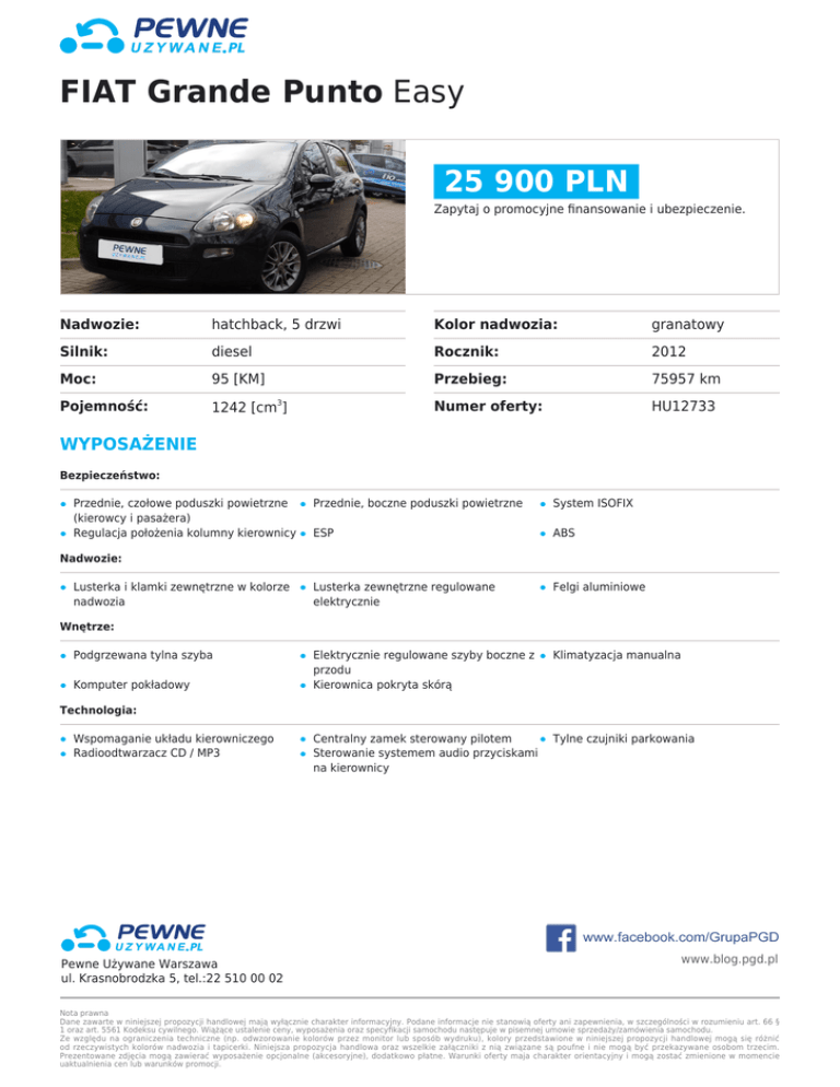 FIAT Grande Punto Easy 25 900 PLN Zapytaj o promocyjne finansowanie i ubezpieczenie. Nadwozie: hatchback, 5 drzwi Kolor nadwozia: granatowy Silnik: diesel Rocznik: 2012 Moc: 95 [KM] Przebieg: 75957 km Pojemność: 1242 [cm ] Numer oferty: HU12733 3 WYPOSAŻENIE Bezpieczeństwo: Przednie, czołowe poduszki powietrzne (kierowcy i pasażera) Regulacja położenia kolumny kierownicy Przednie, boczne poduszki powietrzne System ISOFIX ESP ABS Lusterka zewnętrzne regulowane elektrycznie Felgi aluminiowe Elektrycznie regulowane szyby boczne z przodu Kierownica pokryta skórą Klimatyzacja manualna Centralny zamek sterowany pilotem Sterowanie systemem audio przyciskami na kierownicy Tylne czujniki parkowania Nadwozie: Lusterka i klamki zewnętrzne w kolorze nadwozia Wnętrze: Podgrzewana tylna szyba Komputer pokładowy Technologia: Wspomaganie układu kierowniczego Radioodtwarzacz CD / MP3 Pewne Używane Warszawa ul. Krasnobrodzka 5, tel.:22 510 00 02 www.blog.pgd.pl Nota prawna Dane zawarte w niniejszej propozycji handlowej mają wyłącznie charakter informacyjny. Podane informacje nie stanowią oferty ani zapewnienia, w szczególności w rozumieniu art. 66 § 1 oraz art. 5561 Kodeksu cywilnego. Wiążące ustalenie ceny, wyposażenia oraz specyfikacji samochodu następuje w pisemnej umowie sprzedaży/zamówienia samochodu. Ze względu na ograniczenia techniczne (np. odwzorowanie kolorów przez monitor lub sposób wydruku), kolory przedstawione w niniejszej propozycji handlowej mogą się różnić od rzeczywistych kolorów nadwozia i tapicerki. Niniejsza propozycja handlowa oraz wszelkie załączniki z nią związane są poufne i nie mogą być przekazywane osobom trzecim. Prezentowane zdjęcia mogą zawierać wyposażenie opcjonalne (akcesoryjne), dodatkowo płatne. Warunki oferty maja charakter orientacyjny i mogą zostać zmienione w momencie uaktualnienia cen lub warunków promocji.