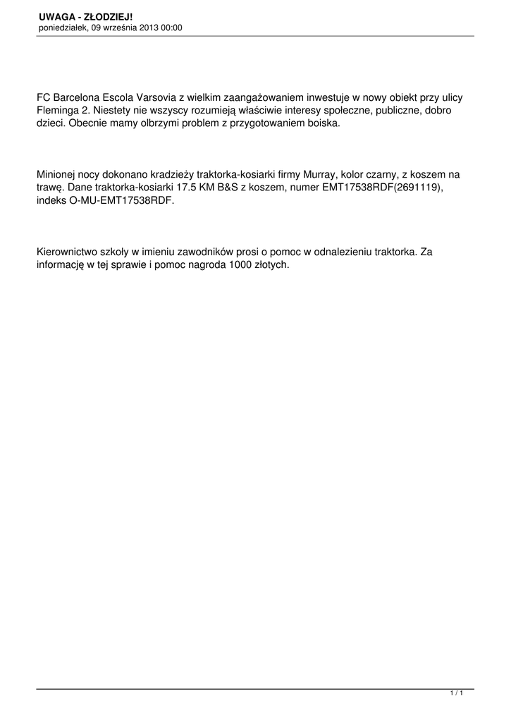 UWAGA - ZŁODZIEJ! poniedziałek, 09 września 2013 00:00 FC Barcelona Escola Varsovia z wielkim zaangażowaniem inwestuje w nowy obiekt przy ulicy Fleminga 2. Niestety nie wszyscy rozumieją właściwie interesy społeczne, publiczne, dobro dzieci. Obecnie mamy olbrzymi problem z przygotowaniem boiska. Minionej nocy dokonano kradzieży traktorka-kosiarki firmy Murray, kolor czarny, z koszem na trawę. Dane traktorka-kosiarki 17.5 KM B&S z koszem, numer EMT17538RDF(2691119), indeks O-MU-EMT17538RDF. Kierownictwo szkoły w imieniu zawodników prosi o pomoc w odnalezieniu traktorka. Za informację w tej sprawie i pomoc nagroda 1000 złotych. 1/1
