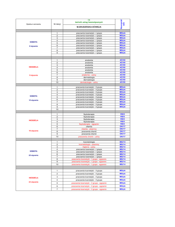 Nr lekcji M.GRUDZIŃSKA-OĆWIEJA SOBOTA 8 stycznia NIEDZIELA 9 stycznia SOBOTA 15 stycznia NIEDZIELA 16 stycznia SOBOTA 22 stycznia NIEDZIELA 23 stycznia 1 2 3 4 5 6 7 8 9 1 2 3 4 5 6 7 8 9 10 1 2 3 4 5 6 7 8 9 10 pracownia kosmetyki - I pracownia kosmetyki - I pracownia kosmetyki - I pracownia kosmetyki - I pracownia kosmetyki - I pracownia kosmetyki - I pracownia kosmetyki - I pracownia kosmetyki - I pracownia kosmetyki - I grupa grupa grupa grupa grupa grupa grupa grupa grupa anatomia anatomia anatomia anatomia anatomia anatomia anatomia - ustny dermatologia dermatologia dermatologia - ustny pracownia kosmetyki - II pracownia kosmetyki - II pracownia kosmetyki - II pracownia kosmetyki - II pracownia kosmetyki - II pracownia kosmetyki - II pracownia kosmetyki - II pracownia kosmetyki - II pracownia kosmetyki - II grupa grupa grupa grupa grupa grupa grupa grupa grupa Nauczyciel/ sala Ik technik usług kosmetycznych Opiekun semestru MG/pk MG/pk MG/pk MG/pk MG/pk MG/pk MG/pk MG/pk MG/pk AĆ/50 AĆ/50 AĆ/50 AĆ/50 AĆ/50 AĆ/50 AĆ/50 AĆ/50 AĆ/50 AĆ/50 MG/pk MG/pk MG/pk MG/pk MG/pk MG/pk MG/pk MG/pk MG/pk 1 2 3 4 5 6 7 8 9 fizykoterapia fizykoterapia fizykoterapia fizykoterapia fizykoterapia - egzamin chemia chemia - pisemny pracownia chemii pracownia chemii RS/5 RS/5 RS/5 RS/5 RS/5 OK/17 OK/17 OK/17 OK/17 10 pracownia chemii - ustny OK/17 1 2 3 4 5 6 7 8 9 kosmetologia kosmetologia - pisemny higiena - ustny pracownia kosmetyki - I grupa pracownia kosmetyki - I grupa pracownia kosmetyki - I grupa pracownia kosmetyki - I grupa pracownia kosmetyki - I grupa - egzamin pracownia kosmetyki - I grupa - egzamin MG/14 MG/14 MG/14 MG/14 MG/14 MG/14 MG/14 MG/14 MG/14 10 pracownia kosmetyki - I grupa - egzamin MG/14 1 pracownia kosmetyki - II grupa MG/pk 2 pracownia kosmetyki - II grupa MG/pk 3 pracownia kosmetyki - II grupa MG/pk 4 pracownia kosmetyki - II grupa MG/pk 5 pracownia kosmetyki - II grupa - egzamin MG/pk 6 pracownia kosmetyki - II grupa - egzamin MG/pk 7 pracownia kosmetyki - II grupa - egzamin MG/pk