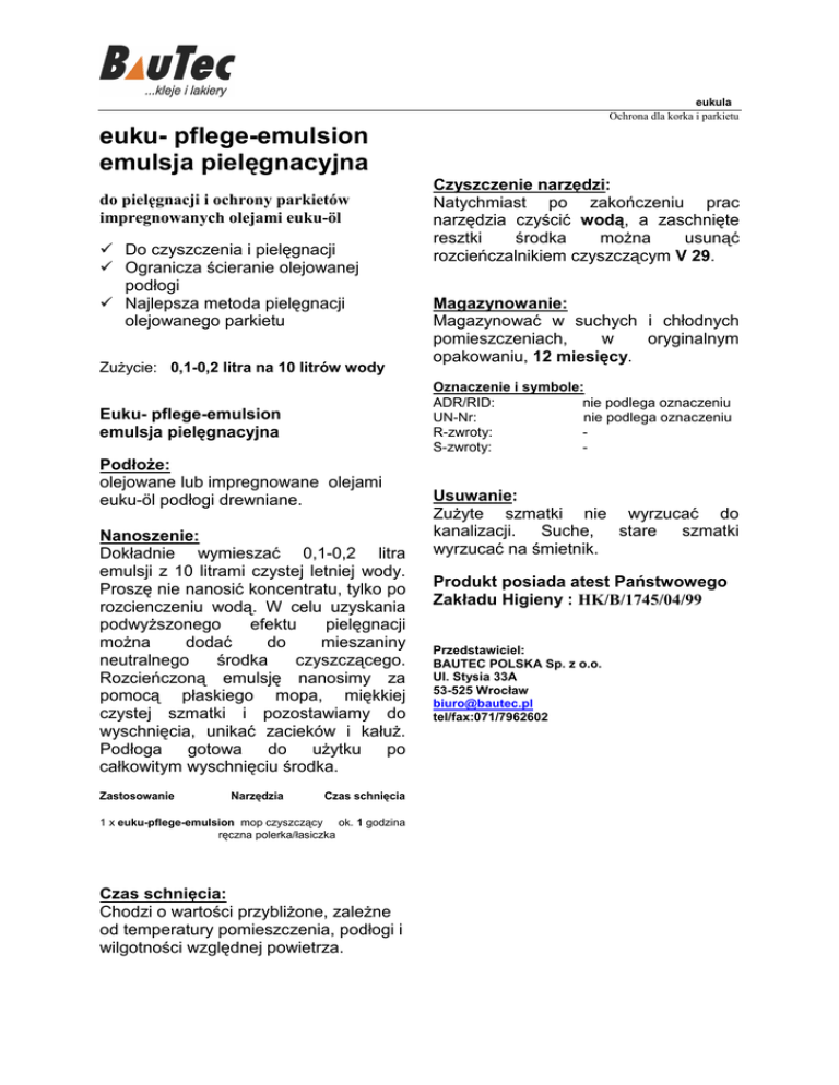 eukula Ochrona dla korka i parkietu euku- pflege-emulsion emulsja pielęgnacyjna do pielęgnacji i ochrony parkietów impregnowanych olejami euku-öl Do czyszczenia i pielęgnacji Ogranicza ścieranie olejowanej podłogi Najlepsza metoda pielęgnacji olejowanego parkietu Zużycie: 0,1-0,2 litra na 10 litrów wody Podłoże: olejowane lub impregnowane olejami euku-öl podłogi drewniane. Nanoszenie: Dokładnie wymieszać 0,1-0,2 litra emulsji z 10 litrami czystej letniej wody. Proszę nie nanosić koncentratu, tylko po rozcienczeniu wodą. W celu uzyskania podwyższonego efektu pielęgnacji można dodać do mieszaniny neutralnego środka czyszczącego. Rozcieńczoną emulsję nanosimy za pomocą płaskiego mopa, miękkiej czystej szmatki i pozostawiamy do wyschnięcia, unikać zacieków i kałuż. Podłoga gotowa do użytku po całkowitym wyschnięciu środka. Narzędzia Magazynowanie: Magazynować w suchych i chłodnych pomieszczeniach, w oryginalnym opakowaniu, 12 miesięcy. Oznaczenie i symbole: ADR/RID: nie podlega oznaczeniu UN-Nr: nie podlega oznaczeniu R-zwroty: S-zwroty: - Euku- pflege-emulsion emulsja pielęgnacyjna Zastosowanie Czyszczenie narzędzi: Natychmiast po zakończeniu prac narzędzia czyścić wodą, a zaschnięte resztki środka można usunąć rozcieńczalnikiem czyszczącym V 29. Czas schnięcia 1 x euku-pflege-emulsion mop czyszczący ok. 1 godzina ręczna polerka/łasiczka Czas schnięcia: Chodzi o wartości przybliżone, zależne od temperatury pomieszczenia, podłogi i wilgotności względnej powietrza. Usuwanie: Zużyte szmatki nie wyrzucać do kanalizacji. Suche, stare szmatki wyrzucać na śmietnik. Produkt posiada atest Państwowego Zakładu Higieny : HK/B/1745/04/99 Przedstawiciel: BAUTEC POLSKA Sp. z o.o. Ul. Stysia 33A 53-525 Wrocław [email protected] tel/fax:071/7962602