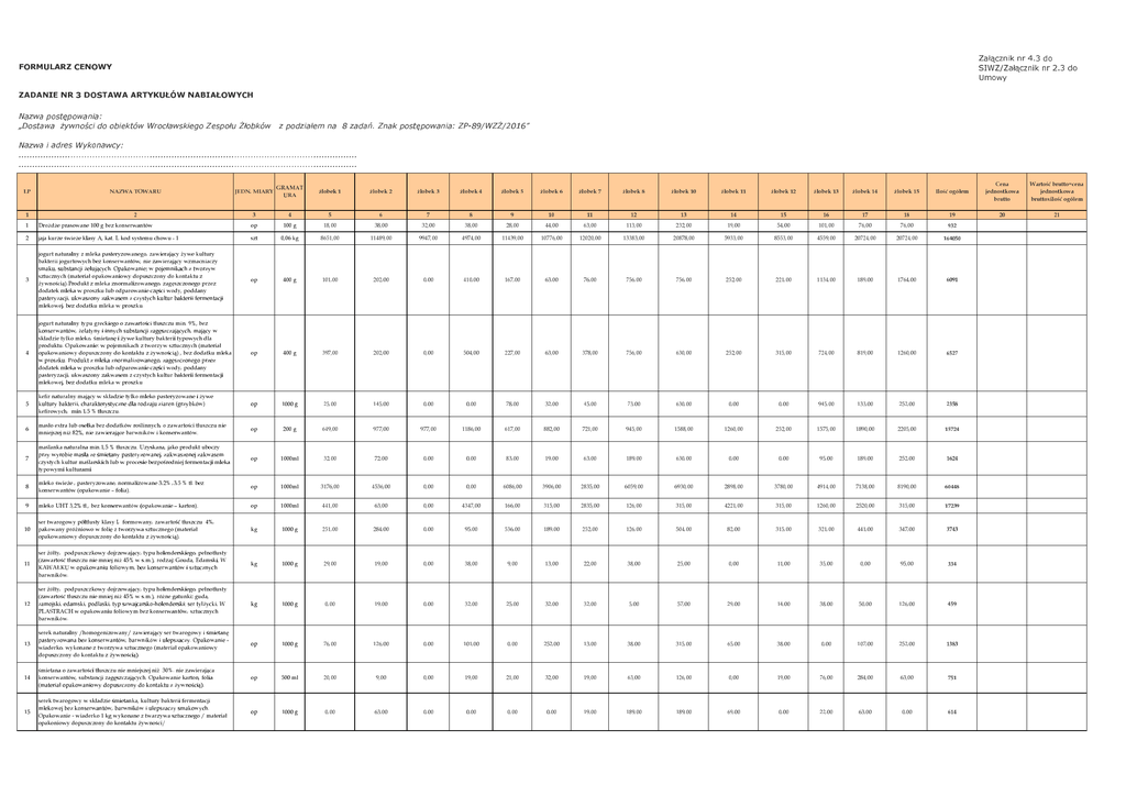 Załącznik nr 4.3 do SIWZ/Załącznik nr 2.3 do Umowy FORMULARZ CENOWY ZADANIE NR 3 DOSTAWA ARTYKUŁÓW NABIAŁOWYCH Nazwa postępowania: „Dostawa żywności do obiektów Wrocławskiego Zespołu Żłobków z podziałem na 8 zadań. Znak postępowania: ZP-89/WZŻ/2016” Nazwa i adres Wykonawcy: ............................................................................................................................ ............................................................................................................................ LP 1 NAZWA TOWARU 2 JEDN. MIARY 3 GRAMAT URA 4 żłobek 1 5 żłobek 2 6 żłobek 3 7 żłobek 4 8 żłobek 5 9 żłobek 6 10 żłobek 7 11 żłobek 8 12 żłobek 10 13 żłobek 11 14 żłobek 12 15 żłobek 13 16 żłobek 14 17 żłobek 15 18 Ilość ogółem Cena jednostkowa brutto Wartość brutto=cena jednostkowa bruttoxilość ogółem 19 20 21 1 2 Drożdże prasowane 100 g bez konserwantów jaja kurze świeże klasy A, kat. L kod systemu chowu - 1 op szt 100 g 0,06 kg 18,00 8651,00 38,00 11489,00 32,00 9947,00 38,00 4974,00 28,00 11439,00 44,00 10776,00 63,00 12020,00 113,00 13383,00 232,00 20878,00 19,00 5933,00 54,00 8553,00 101,00 4559,00 76,00 20724,00 76,00 20724,00 164050 3 jogurt naturalny z mleka pasteryzowanego, zawierający żywe kultury bakterii jogurtowych bez konserwantów, nie zawierający wzmacniaczy smaku, substancji żelujących. Opakowanie: w pojemnikach z tworzyw sztucznych (materiał opakowaniowy dopuszczony do kontaktu z żywnością).Produkt z mleka znormalizowanego, zagęszczonego przez dodatek mleka w proszku lub odparowanie części wody, poddany pasteryzacji, ukwaszony zakwasem z czystych kultur bakterii fermentacji mlekowej, bez dodatku mleka w proszku. op 400 g 101,00 202,00 0,00 410,00 167,00 63,00 76,00 756,00 756,00 252,00 221,00 1134,00 189,00 1764,00 6091 4 jogurt naturalny typu greckiego o zawartości tłuszczu min. 9%, bez konserwantów, żelatyny i innych substancji zagęszczających, mający w składzie tylko mleko, śmietanę i żywe kultury bakterii typowych dla produktu. Opakowanie: w pojemnikach z tworzyw sztucznych (materiał opakowaniowy dopuszczony do kontaktu z żywnością) , bez dodatku mleka w proszku. Produkt z mleka znormalizowanego, zagęszczonego przez dodatek mleka w proszku lub odparowanie części wody, poddany pasteryzacji, ukwaszony zakwasem z czystych kultur bakterii fermentacji mlekowej, bez dodatku mleka w proszku op 400 g 397,00 202,00 0,00 504,00 227,00 63,00 378,00 756,00 630,00 252,00 315,00 724,00 819,00 1260,00 6527 5 kefir naturalny mający w składzie tylko mleko pasteryzowane i żywe kultury bakterii, charakterystyczne dla rodzaju ziaren (grzybków) kefirowych, min.1,5 % tłuszczu. op 1000 g 25,00 145,00 0,00 0,00 78,00 32,00 45,00 73,00 630,00 0,00 0,00 945,00 133,00 252,00 2358 6 masło extra lub osełka bez dodatków roślinnych, o zawartości tłuszczu nie mniejszej niż 82%, nie zawierające barwników i konserwantów. op 200 g 649,00 977,00 977,00 1186,00 617,00 882,00 721,00 945,00 1588,00 1260,00 252,00 1575,00 1890,00 2205,00 15724 7 maślanka naturalna min.1,5 % tłuszczu. Uzyskana, jako produkt uboczy przy wyrobie masła ze śmietany pasteryzowanej, zakwaszonej zakwasem czystych kultur maślarskich lub w procesie bezpośredniej fermentacji mleka typowymi kulturami. op 1000ml 32,00 72,00 0,00 0,00 83,00 19,00 63,00 189,00 630,00 0,00 0,00 95,00 189,00 252,00 1624 8 mleko świeże , pasteryzowane, normalizowane 3,2% ,3,5 % tł. bez konserwantów (opakowanie – folia). op 1000ml 3176,00 4536,00 0,00 0,00 6086,00 3906,00 2835,00 6059,00 6930,00 2898,00 3780,00 4914,00 7138,00 8190,00 60448 9 mleko UHT 3,2% tł., bez konserwantów (opakowanie – karton). op 1000ml 441,00 63,00 0,00 4347,00 166,00 315,00 2835,00 126,00 315,00 4221,00 315,00 1260,00 2520,00 315,00 17239 ser twarogowy półtłusty klasy I, formowany, zawartość tłuszczu 4%, 10 pakowany próżniowo w folię z tworzywa sztucznego (materiał opakowaniowy dopuszczony do kontaktu z żywnością). kg 1000 g 251,00 284,00 0,00 95,00 536,00 189,00 252,00 126,00 504,00 82,00 315,00 321,00 441,00 347,00 3743 ser żółty, podpuszczkowy dojrzewający, typu holenderskiego, pełnotłusty tłuszczu nie mniej niż 45% w s.m.), rodzaj: Gouda, Edamski, W 11 (zawartość KAWAŁKU w opakowaniu foliowym, bez konserwantów i sztucznych barwników. kg 1000 g 29,00 19,00 0,00 38,00 9,00 13,00 22,00 38,00 25,00 0,00 11,00 35,00 0,00 95,00 334 ser żółty, podpuszczkowy dojrzewający, typu holenderskiego, pełnotłusty (zawartość tłuszczu nie mniej niż 45% w s.m.), różne gatunki: guda, 12 zamojski, edamski, podlaski, typ szwajcarsko-holenderski: ser tylżycki, W PLASTRACH w opakowaniu foliowym bez konserwantów, sztucznych barwników. kg 1000 g 0,00 19,00 0,00 32,00 25,00 32,00 32,00 5,00 57,00 29,00 14,00 38,00 50,00 126,00 459 serek naturalny /homogenizowany/ zawierający ser twarogowy i śmietanę bez konserwantów, barwników i ulepszaczy. Opakowanie 13 pasteryzowana wiaderko, wykonane z tworzywa sztucznego (materiał opakowaniowy dopuszczony do kontaktu z żywnością). op 1000 g 76,00 126,00 0,00 101,00 0,00 252,00 13,00 38,00 315,00 65,00 38,00 0,00 107,00 252,00 1383 śmietana o zawartości tłuszczu nie mniejszej niż 30%. nie zawierająca 14 konserwantów, substancji zagęszczających. Opakowanie karton, folia (materiał opakowaniowy dopuszczony do kontaktu z żywnością). op 500 ml 20,00 9,00 0,00 19,00 21,00 32,00 19,00 63,00 126,00 0,00 19,00 76,00 284,00 63,00 751 serek twarogowy w składzie śmietanka, kultury bakterii fermentacji bez konserwantów, barwników i ulepszaczy smakowych. 15 mlekowej Opakowanie - wiaderko 1 kg wykonane z twarzywa sztucznego / materiał opakoniowy dopuszczony do kontaktu żywności/ op 1000 g 0,00 63,00 0,00 0,00 0,00 0,00 19,00 189,00 189,00 69,00 0,00 22,00 63,00 0,00 614 932 śmietana o zawartości tłuszczu nie mniejszej niż 18%, nie zawierająca 16 konserwantów, substan