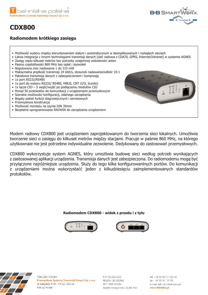 CDX800 Radiomodem krótkiego zasięgu • • • • • • • • • • • • • • • • Możliwość wyboru między kierunkowaniem stałym i automatycznym w skomplikowanych i rozległych sieciach Łatwa integracja z innymi technologiami transmisji danych (sieć radiowa z CDA70, GPRS, Internet/Intranet) w systemie AGNES Zasięg rzędu kilkuset metrów bez potrzeby wzajemnej widzialności anten Pasmo częstotliwości 869 MHz bez opłat i zezwoleń Regulowana moc nadawania 1 do 315 mW Maksymalna prędkość transmisji 24 kbit/s, stosunek nadawanie/odbiór 10:1 Pakietowa transmisja danych z zabezpieczeniem i kompresją 1x port RS232/RS485 1x port do wyboru RS232/ RS485, MBUS, CNT (I/O, liczniki) 1x łącze CIO – 5 wejść/wyjść po podłączeniu modułów CIO Ponad 50 protokołów do komunikacji z urządzeniami przemysłowymi Szerokie możliwości konfiguracji, zdalnego zarządzania Bogaty pakiet funkcji diagnostycznych i serwisowych Przemysłowa konstrukcja Możliwość montażu na szynie DIN 35mm Bezpłatne oprogramowanie RADWIN do zarządzania urządzeniem Modem radiowy CDX800 jest urządzeniem zaprojektowanym do tworzenia sieci lokalnych. Umożliwia tworzenie sieci o zasięgu do kilkuset metrów między stacjami. Pracuje w paśmie 860 MHz, na którego użytkownaie nie jest potrzebne indywidualne zezwolenie. Dedykowany do zastosowań przemysłowych. CDX800 wykorzystuje system AGNES, który umożliwia budowę sieci według potrzeb wynikających z zastosowanej aplikacji urządzenia. Transmisja danych jest zabezpieczona. Do radiomodemu mogą być przyłączone najróżniejsze urządzenia. Służy do tego kilka konfigurowanlnych portów. Do komunikacji z urządzeniami można wykorzystaćć jeden z kilkudziesięciu zaimplementowanych standardów protokołów. Radiomodem CDX800 - widok z przodu i z tyłu