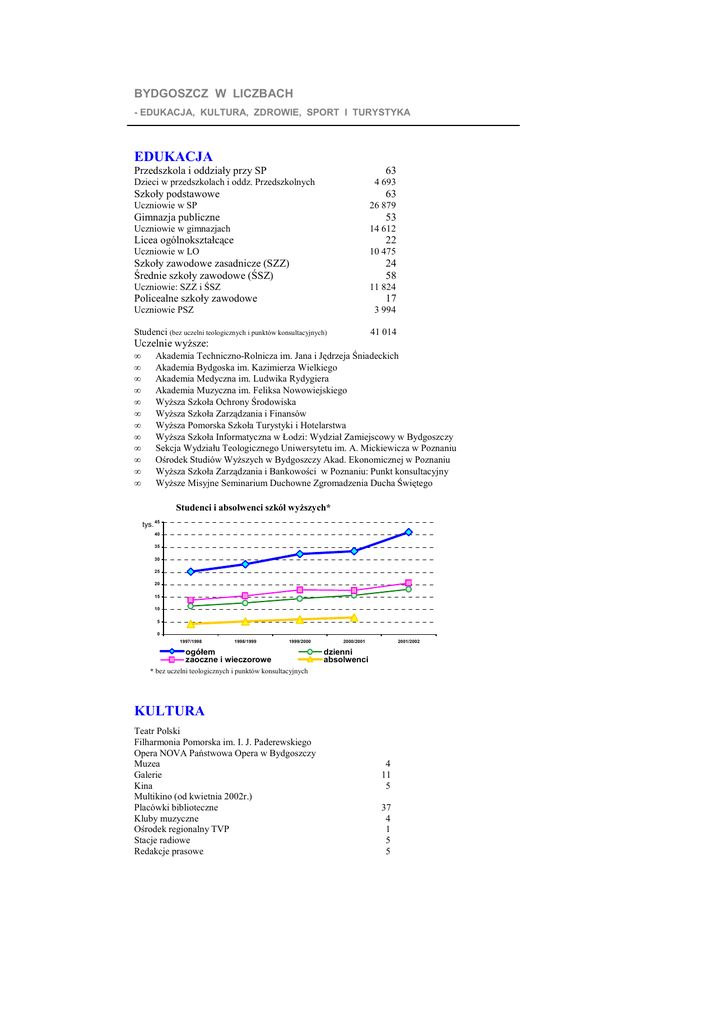 BYDGOSZCZ W LICZBACH - EDUKACJA, KULTURA, ZDROWIE, SPORT I TURYSTYKA EDUKACJA Przedszkola i oddziały przy SP 63 Dzieci w przedszkolach i oddz. Przedszkolnych 4 693 Szkoły podstawowe 63 Uczniowie w SP 26 879 Gimnazja publiczne 53 Uczniowie w gimnazjach 14 612 Licea ogólnokształcące 22 Uczniowie w LO 10 475 Szkoły zawodowe zasadnicze (SZZ) Średnie szkoły zawodowe (ŚSZ) 24 58 Uczniowie: SZZ i ŚSZ 11 824 Policealne szkoły zawodowe 17 Uczniowie PSZ 3 994 Studenci (bez uczelni teologicznych i punktów konsultacyjnych) 41 014 Uczelnie wyŜsze: • • • • • • • • • • • • Akademia Techniczno-Rolnicza im. Jana i Jędrzeja Śniadeckich Akademia Bydgoska im. Kazimierza Wielkiego Akademia Medyczna im. Ludwika Rydygiera Akademia Muzyczna im. Feliksa Nowowiejskiego WyŜsza Szkoła Ochrony Środowiska WyŜsza Szkoła Zarządzania i Finansów WyŜsza Pomorska Szkoła Turystyki i Hotelarstwa WyŜsza Szkoła Informatyczna w Łodzi: Wydział Zamiejscowy w Bydgoszczy Sekcja Wydziału Teologicznego Uniwersytetu im. A. Mickiewicza w Poznaniu Ośrodek Studiów WyŜszych w Bydgoszczy Akad. Ekonomicznej w Poznaniu WyŜsza Szkoła Zarządzania i Bankowości w Poznaniu: Punkt konsultacyjny WyŜsze Misyjne Seminarium Duchowne Zgromadzenia Ducha Świętego Studenci i absolwenci szkół wyŜszych* tys. 45 40 35 30 25 20 15 10 5 0 1997/1998 1998/1999 1999/2000 ogółem zaoczne i wieczorowe 2000/2001 2001/2002 dzienni absolwenci * bez uczelni teologicznych i punktów konsultacyjnych KULTURA Teatr Polski Filharmonia Pomorska im. I. J. Paderewskiego Opera NOVA Państwowa Opera w Bydgoszczy Muzea Galerie Kina Multikino (od kwietnia 2002r.) Placówki biblioteczne Kluby muzyczne Ośrodek regionalny TVP Stacje radiowe Redakcje prasowe 4 11 5 37 4 1 5 5 BYDGOSZCZ W LICZBACH - EDUKACJA, KULTURA, ZDROWIE, SPORT I TURYSTYKA ZDROWIE I OPIEKA SPOŁECZNA Szpitale Liczba łóŜek w szpitalach Szpitale resortowe Sanatorium śłobki Dzieci w Ŝłobkach Domy Pomocy Społecznej Miejsca w DPS Domy Dziennego Pobytu 7 ok. 3 tys. 2 1 10 445 4 365 6 SPORT I REKREACJA Stadiony Baseny kryte Baseny otwarte Sztuczne lodowisko Hale sportowe Tor ŜuŜlowy Tor kartingowy Tor łuczniczy Tor regatowy Strzelnice Przystanie kajakowe Przystanie Ŝeglarskie Przystanie wioślarskie Ogniska TKKF Towarzystwa gimnastyczne „Sokół” 8 6 3 1 3 1 1 1 1 2 7 11 4 10 3 Kompleks rekreacyjno-sportowy „Leśny Park Kultury i Wypoczynku” w Myślęcinku (m.in.: wyciąg narciarski z armatką śniegową, tor saneczkowy, Ośrodek Rekreacji Konnej, autodrom, Myślęcińska Kolejka Parkowa) Hala sportowo – widowiskowa (6 tys. osób; II kwartał 2002r.) BAZA TURYSTYCZNA Hotele / miejsca w hotelach Motele / miejsca w motelach Kempingi / miejsca na kempingach Schroniska młodzieŜowe PTTK 20 / 1 671 1 / 46 1 / 250 1 / 100 Obsługa ruchu turystycznego: • • • • Kujawsko-Pomorska Agencja Rozwoju Turystyki Miejskie Centrum Informacji Turystycznej w PLB S.A. Biura podróŜy Kasy lotnicze PTTK – oddziały, kluby, pracownie 15 6 13