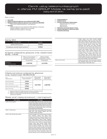 Cennik usług telekomunikacyjnych w ofercie FM GROUP Mobile na kartę (pre-paid) ważny od 01.07.2014 r. Spis treści: Usługi dodatkowe Zasilenie konta Serwisy rozrywkowe i informacyjne Połączenia głosowe Premium SMS Premium MMS Premium Pakietowa transmisja danych w kraju Usługi niedostępne w ofercie pre-paid Pozostałe informacje Karta SIM Krajowe połączenia głosowe oraz wiadomości SMS i MMS Międzynarodowe połączenia głosowe oraz wiadomości SMS/MMS Tabela stref międzynarodowych i roamingowych Roaming Połączenia głosowe oraz wiadomości SMS odebrane w roamingu Połączenia głosowe wykonywane w roamingu Wiadomości SMS wysyłane w roamingu Jamajka, Jordania, Kenia, Kiribati, Koreańska Republika Ludowo-Demokratyczna, Kuwejt, Laos, Liban, Lesoto, Liberia, Makau, Malawi, Malediwy, Mali, Wyspy Mariana, Wyspy Marshala, Mauretania, Mauritius, Majotta, Mikronezja, Mongolia, Montserrat, Mozambik, Myanmar, Namibia, Nepal, Antyle Holenderskie, Nowa Kaledonia, Nowa Zelandia, Nikaragua, Niger, Nigeria, Niue, Oman, Pakistan, Palau, Palestyna, Panama, Papua Nowa Gwinea, Paragwaj, Filipiny, Portoryko, Katar, Rwanda, Arabia Saudyjska, Senegal, Seszele, Sierra Leone, Wyspy Salomona, Somalia, Republika Południowej Afryki, Sri Lanka, Wyspy St. Kitts i Nevis, St. Lucia, Wyspy St. Pierre i Miquelon, St. Vincent i Grenadyny, Sudan, Surinam, Suazi, Syria, Tadżykistan, Tajwan, Tanzania, Tajlandia, Togo, Tonga, Trynidad i Tobago, Turks i Caicos, Tuvalu, Uganda, Zjednoczone Emiraty Arabskie, Stany Zjednoczone, Urugwaj, Vanuatu, Wenezuela, Samoa Zachodnia, Jemen, Zambia, Zimbabwe Karta SIM Karta SIM Cena Opłata jednorazowa 15 PLN Początkowa wartość konta na karcie 15 PLN Krajowe połączenia głosowe oraz wiadomości SMS i MMS Stawki podstawowe Opłata za minutę połączenia głosowego do wszystkich krajowych sieci stacjonarnych i komórkowych* Opłata za wysłanie jednego SMS-a / MMS-a do wszystkich krajowych sieci komórkowych 0,29 PLN 0,15 PLN Strefa 3: reszta świata * Opłata naliczana jest za każdą rozpoczętą sekundę połączenia. Międzynarodowe połączenia głosowe oraz wiadomości SMS/MMS Strefa międzynarodowa** Opłata za minutę połączenia międzynarodowego*** Strefa: Unia Europejska 2 PLN Strefa 1: reszta Europy 3 PLN Strefa 2: USA, Kanada, Azja i Afryka 5 PLN Strefa 3: reszta świata 8 PLN Opłata za wysłanie jednego SMS-a międzynarodowego Opłata za wysłanie jednego MMS-a międzynarodowego 0,41 PLN 2,46 PLN ** Zgodnie z Tabelą stref międzynarodowych zawartą w niniejszym Cenniku. *** Opłata jest naliczana za każde rozpoczęte 30 sekund połączenia. ****Opłata za wy słanie MMS do jednego adresata za każde rozpoczęte 100 kB wysłanych danych naliczana jest oddzielnie Tabela stref międzynarodowych i roamingowych Strefa Kraje Strefa: Unia Europejska Austria, Belgia, Bułgaria, Chorwacja, Cypr, Czechy, Dania, Estonia, Finlandia, Francja, Gibraltar, Grecja, Gujana Francuska, Gwadelupa, Hiszpania, Holandia, Islandia, Irlandia, Lichtenstein, Litwa, Luksemburg, Łotwa, Malta, Martynika, Monako, Niemcy, Norwegia, Portugalia, Rumunia, San Marino, Słowacja, Słowenia, Szwecja, Węgry, Włochy, Wyspa Reunion, Wielka Brytania Strefa 1: reszta Europy Albania, Algieria, Andora, Armenia, Białoruś, Bośnia i Hercegowina, Wyspy Owcze, Gruzja, Macedonia, Mołdawia, Rosja, Serbia i Czarnogóra, Szwajcaria, Turcja, Ukraina Strefa 2: USA, Kanada, Azja i Afryka Australia, Azerbejdżan, Chiny, Hong Kong, Japonia, Kazachstan, Korea Południowa, Kirgistan, Libia, Malezja, Maroko, Singapur, Tunezja, Uzbekistan, Turkmenistan, Afganistan, Samoa Amerykańskie, Angola, Antigua i Barbuda, Argentyna, Aruba, Wyspy Wniebowstąpienia, Bahamy, Bahrajn, Bangladesz, Barbados, Belize, Benin, Boliwia, Botswana, Brazylia, Brytyjskie Wyspy Dziewicze, Brunei, Burkina Faso, Burundi, Kambodża, Kamerun, Kanada, Wyspy Zielonego Przylądka, Kajmany, Republika Środkowo-Afrykańska, Czad, Kolumbia, Komory, Kongo, Demokratyczna Republika Konga, Kostaryka, Wyspy Diego Garcia, Dżibuti, Dominika, Dominikana, Timor Wschodni, Egipt, Salwador, Gwinea Równikowa, Erytrea, Etiopia, Falklandy, Fidżi, Francuska Polinezja, Gabon, Gambia, Ghana, Grenlandia, Grenada, Guam, Gwinea, Gwinea-Bissau, Gujana, Haiti, Honduras, Indonezja, Iran, Irak, Izrael, Wybrzeże Kości Słoniowej, strona 1 z 4 Anguilla, Bermudy, Bhutan, Chile, Kuba, Ekwador, Gwatemala, Indie, Madagaskar, Meksyk, Nauru, Peru, Wyspy Św. Tomasza i Księżyca, Wyspa Św. Heleny, Wallis i Futuna Roaming Połączenia głosowe oraz wiadomości SMS odebrane w roamingu Opłata za połączenie głosowe odebrane w roamingu zależy od strefy roamingowej, odpowiadającej krajowi lub terytorium, w którym znajduje się Abonent. Opłata za odebranie SMS-a w roamingu Opłata za minutę połączenia Strefa roamingowa**** odebranego w roamingu***** Strefa: Unia Europejska 0,25 PLN Strefa 1: reszta Europy 4,00 PLN Strefa 2: USA, Kanada, Azja i Afryka 6,50 PLN Bezpłatnie (w ramach opłaty za udostępnienie usług) Strefa 3: reszta świata 11,00 PLN **** Zgodnie z Tabelą stref międzynarodowych i roamingowych zawartą w niniejszym Cenniku. ***** Za pierwsze rozpoczęte 30 sekund połączenia opłata wynosi połowę stawki za minutę połączenia. Po upływie pierwszych 30 sekund połączenia, opłata naliczana jest w wysokości 1/60 stawki za minutę połączenia (naliczanie sekundowe). Połączenia głosowe wykonywane w roamingu Połączenia głosowe w roamingu wykonywane są za pomocą kodu: *111*numer wywoływany# oraz akceptację klawiszem dzwonienia. Numer wywoływany musi zostać poprzedzony numerem kierunkowym kraju lub terytorium, do którego wykonywane jest połączenie, np. w przypadku połączenia do Abonenta z Polski o numerze telefonu 0 727 900 032, wpisujemy *111*48727900032# i akceptujemy przyciskiem dzwonienia. Opłata za połączenie głosowe wykonane w roamingu zależy od strefy roamingowej, odpowiadającej krajowi lub terytorium, w którym znaj