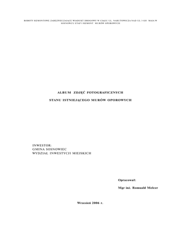 ROBOTY REMONTOWE ZABEZPIECZAJĄCE WIADUKT DROGOWY W CIĄGU UL. NARUTOWICZA N A D UL 3-GO MAJA W S O S N O W C U ETAP I REMONT M U R Ó W OPOROWYCH ALBUM ZDJĘĆ FOTOGRAFICZNYCH STANU ISTNIEJĄCEGO MURÓW OPOROWYCH INWESTOR: GMINA SOSNOWIEC WYDZIAŁ INWESTYCJI MIEJSKICH Opracował: Mgr inż. Romuald Melcer Wrzesień 2006 r. ROBOTY REMONTOWE ZABEZPIECZAJĄCE WIADUKT DROGOWY W CIĄGU UL. NARUTOWICZA NAD Ul. 3-GO MAJA W SOSNOWCU ETAP I REMONT MURÓW OPOROWYCH