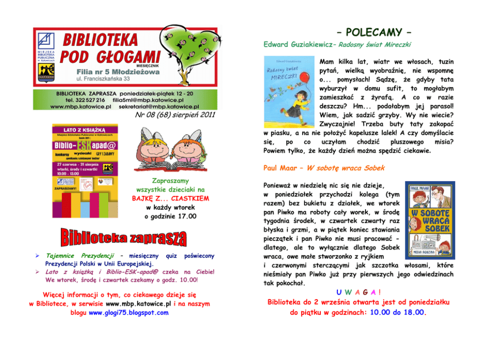 – POLECAMY – Edward Guziakiewicz– Radosny świat Mireczki Nr 08 (68) sierpień 2011 Mam kilka lat, wiatr we włosach, tuzin pytań, wielką wyobraźnię, nie wspomnę o... pomysłach! Sądzę, Ŝe gdyby tata wyburzył w domu sufit, to mogłabym zamieszkać z Ŝyrafą. A co w razie deszczu? Hm... podałabym jej parasol! Wiem, jak sadzić grzyby. Wy nie wiecie? Zwyczajnie! Trzeba buty taty zakopać w piasku, a na nie połoŜyć kapelusze lalek! A czy domyślacie się, po co uczyłam chodzić pluszowego misia? Powiem tylko, Ŝe kaŜdy dzień moŜna spędzić ciekawie. Paul Maar – W sobotę wraca Sobek Zapraszamy wszystkie dzieciaki na BAJKĘ Z... CIASTKIEM w kaŜdy wtorek o godzinie 17.00 Tajemnice Prezydencji – miesięczny Prezydencji Polski w Unii Europejskiej. Lato z ksiąŜką i Biblio-ESK-apad@ czeka na Ciebie! We wtorek, środę i czwartek czekamy o godz. 10.00! quiz poświecony Więcej informacji o tym, co ciekawego dzieje się w Bibliotece, w serwisie www.mbp.katowice.pl i na naszym blogu www.glogi75.blogspot.com PoniewaŜ w niedzielę nic się nie dzieje, w poniedziałek przychodzi kolega (tym razem) bez bukietu z działek, we wtorek pan Piwko ma roboty cały worek, w środę tygodnia środek, w czwartek czwarty raz błyska i grzmi, a w piątek koniec stawiania pieczątek i pan Piwko nie musi pracować dlatego, ale to wyłącznie dlatego Sobek wraca, owe małe stworzonko z ryjkiem i czerwonymi sterczącymi jak szczotka włosami, które nieśmiały pan Piwko juŜ przy pierwszych jego odwiedzinach tak pokochał. U W A G A ! Biblioteka do 2 września otwarta jest od poniedziałku do piątku w godzinach: 10.00 do 18.00. – POLECAMY – Edward Guziakiewicz– Radosny świat Mireczki Nr 08 (68) sierpień 2011 Mam kilka lat, wiatr we włosach, tuzin pytań, wielką wyobraźnię, nie wspomnę o... pomysłach! Sądzę, Ŝe gdyby tata wyburzył w domu sufit, to mogłabym zamieszkać z Ŝyrafą. A co w razie deszczu? Hm... podałabym jej parasol! Wiem, jak sadzić grzyby. Wy nie wiecie? Zwyczajnie! Trzeba buty taty zakopać w piasku, a na nie połoŜyć kapelusze lalek! A czy domyślacie się, po co uczyłam chodzić pluszowego misia? Powiem tylko, Ŝe kaŜdy dzień moŜna spędzić ciekawie. Paul Maar – W sobotę wraca Sobek Zapraszamy wszystkie dzieciaki na BAJKĘ Z... CIASTKIEM w kaŜdy wtorek o godzinie 17.00 Tajemnice Prezydencji – miesięczny Prezydencji Polski w Unii Europejskiej. Lato z ksiąŜką i Biblio-ESK-apad@ czeka na Ciebie! We wtorek, środę i czwartek czekamy o godz. 10.00! quiz poświecony Więcej informacji o tym, co ciekawego dzieje się w Bibliotece, w serwisie www.mbp.katowice.pl i na naszym blogu www.glogi75.blogspot.com PoniewaŜ w niedzielę nic się nie dzieje, w poniedziałek przychodzi kolega (tym razem) bez bukietu z działek, we wtorek pan Piwko ma roboty cały worek, w środę tygodnia środek, w czwartek czwarty raz błyska i grzmi, a w piątek koniec stawiania pieczątek i pan Piwko nie musi pracować dlatego, ale to wyłącznie dlatego Sobek wraca, owe małe stworzonko z ryjkiem i czerwonymi sterczącymi jak szczotka włosami, które nieśmiały pan Piwko juŜ przy pierwszych jego odwiedzinach tak pokochał. U W A G A ! Biblioteka do 2 września otwarta jest od poniedziałku do piątku w godzinach: 10.00 do 18.00.