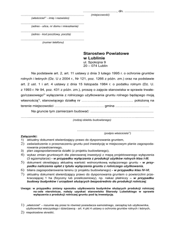 .................................., dn. .............................. ................................................................ (miejscowość) (właściciel1) - imię i nazwisko) ................................................................ (adres - ulica, nr domu i mieszkania) ................................................................ (adres - kod pocztowy, poczta) ................................................................ (numer telefonu) Starostwo Powiatowe w Lublinie ul. Spokojna 9 20 – 074 Lublin Na podstawie art. 2, art. 11 ustawy z dnia 3 lutego 1995 r. o ochronie gruntów rolnych i leśnych (Dz. U z 2004 r., Nr 121, poz. 1266 z późn. zm.) oraz na podstawie art. 2 ust. 1 i art. 4 ustawy z dnia 15 listopada 1984 r. o podatku rolnym (Dz. U. z 1993 r. Nr 94, poz. 431 z późn. zm.), proszę o zajęcie stanowiska w sprawie trwałego/czasowego2) wyłączenia z rolniczego użytkowania gruntu rolnego będącego moją własnością1), stanowiącego działkę nr …………...................................... położoną na terenie miejscowości …………………………………… gmina ……………………….. Na gruncie tym zamierzam budować: ................................................................ ……...............................................…………………….………………………................... (rodzaj obiektu budowlanego) .............................................................................. (podpis właściciela1)) Załączniki: 1) aktualny dokument stwierdzający prawo do dysponowania gruntem, 2) zaświadczenie o przeznaczeniu gruntu pod inwestycję w miejscowym planie zagospodarowania przestrzennego, 3) plan zagospodarowania działki (z projektu budowlanego), 4) wykaz zmian gruntowych dla planowanej inwestycji z mapą projektowanego wyłączenia (3 egzemplarze) - w przypadku wyłączenia z produkcji użytków rolnych klas I-III, 5) dokument określający aktualną wartość wolnorynkową wyłączonego gruntu - w przypadku naliczenia opłat z tytułu wyłączenia gruntu z rolniczego użytkowania, 6) bilans zagospodarowania terenu (z projektu budowlanego) - w przypadku klas IV-VI, 7) aktualny dokument stwierdzający prawo do dysponowania gruntem o powierzchni przekraczającej 1 ha (fizyczny lub przeliczeniowy), np. nakaz płatniczy – w przypadku budowy budynków i urządzeń służących bezpośrednio do produkcji rolniczej. Uwaga: w przypadku zmiany sposobu użytkowania budynków służących produkcji rolniczej na cele nierolnicze, należy uzyskać stanowisko Starosty Lubelskiego w sprawie wyłączenia z produkcji rolniczej gruntu pod tą inwestycję. 1) „właściciel” – rozumie się przez to również posiadacza samoistnego, zarządcę lub użytkownika, użytkownika wieczystego i dzierżawcę - art. 4 pkt 4 ustawy o ochronie gruntów rolnych i leśnych, 2) niepotrzebne skreślić.