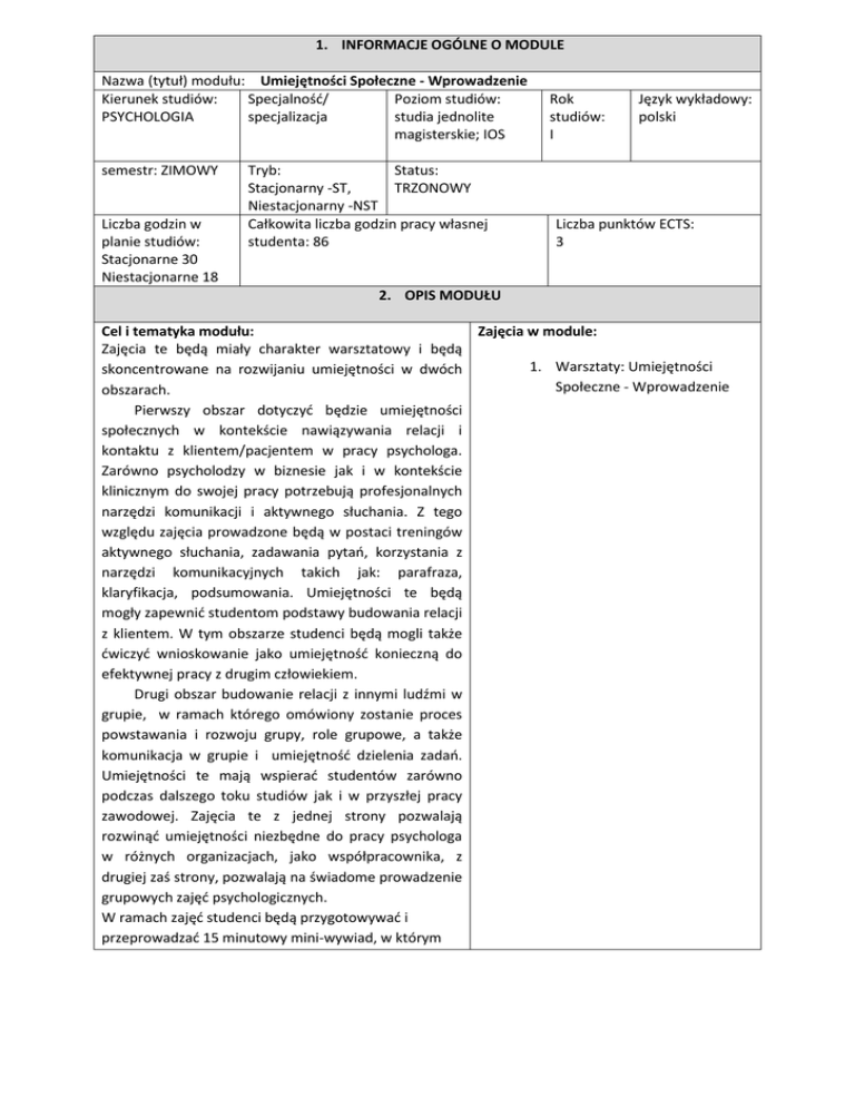 1. INFORMACJE OGÓLNE O MODULE Nazwa (tytuł) modułu: Umiejętności Społeczne - Wprowadzenie Kierunek studiów: Specjalność/ Poziom studiów: PSYCHOLOGIA specjalizacja studia jednolite magisterskie; IOS semestr: ZIMOWY Liczba godzin w planie studiów: Stacjonarne 30 Niestacjonarne 18 Tryb: Status: Stacjonarny -ST, TRZONOWY Niestacjonarny -NST Całkowita liczba godzin pracy własnej studenta: 86 Rok studiów: I Język wykładowy: polski Liczba punktów ECTS: 3 2. OPIS MODUŁU Cel i tematyka modułu: Zajęcia w module: Zajęcia te będą miały charakter warsztatowy i będą 1. Warsztaty: Umiejętności skoncentrowane na rozwijaniu umiejętności w dwóch Społeczne - Wprowadzenie obszarach. Pierwszy obszar dotyczyć będzie umiejętności społecznych w kontekście nawiązywania relacji i kontaktu z klientem/pacjentem w pracy psychologa. Zarówno psycholodzy w biznesie jak i w kontekście klinicznym do swojej pracy potrzebują profesjonalnych narzędzi komunikacji i aktywnego słuchania. Z tego względu zajęcia prowadzone będą w postaci treningów aktywnego słuchania, zadawania pytań, korzystania z narzędzi komunikacyjnych takich jak: parafraza, klaryfikacja, podsumowania. Umiejętności te będą mogły zapewnić studentom podstawy budowania relacji z klientem. W tym obszarze studenci będą mogli także ćwiczyć wnioskowanie jako umiejętność konieczną do efektywnej pracy z drugim człowiekiem. Drugi obszar budowanie relacji z innymi ludźmi w grupie, w ramach którego omówiony zostanie proces powstawania i rozwoju grupy, role grupowe, a także komunikacja w grupie i umiejętność dzielenia zadań. Umiejętności te mają wspierać studentów zarówno podczas dalszego toku studiów jak i w przyszłej pracy zawodowej. Zajęcia te z jednej strony pozwalają rozwinąć umiejętności niezbędne do pracy psychologa w różnych organizacjach, jako współpracownika, z drugiej zaś strony, pozwalają na świadome prowadzenie grupowych zajęć psychologicznych. W ramach zajęć studenci będą przygotowywać i przeprowadzać 15 minutowy mini-wywiad, w którym będą mogli przećwiczyć nabyte umiejętności komunikacji i pracy na relacji z drugim człowiekiem i otrzymać informacje zwrotne dotyczące ich postępów. Drugim zadaniem w ramach zajęć będzie praca w zespołach polegająca na stworzeniu broszury z informacjami dotyczącymi miejsc w których można poszukiwać pomocy psychologicznej w ramach NFZ. 3. EFEKTY KSZTAŁCENIA Obowiązkowa literatura: Efekty modułowe: Student zna obszar pracy psychologa. Student zna narzędzia komunikacji. Student zna miejsca w których udzielana jest pomoc psychologiczna. Student potrafi prowadzić swobodną rozmowę z klientem. Student rozumie obowiązek dokształcania się zarówno w trakcie jak i po studiach. Student potrafi skierować klienta do odpowiedniej pomocy. Student potrafi korzystać z narzędzi komunikacyjnych. Landsberg, M. (1999). Tao szkolenia. Warszawa: Studio EMKA (s. 49- 56) Szustrowa, T. (1991). Swobodne techniki diagnostyczne. Wywiad i obserwacja. Warszawa: Wydawnictwa Uniwersytetu Warszawskiego. (s. 4080) McBurney, D. (2008). Myśleć jak psycholog. Miller W., Rollnick, S. (2013). Wywiad Motywujący, (roz. 6, str. 66-91) Kraków: WUJ.