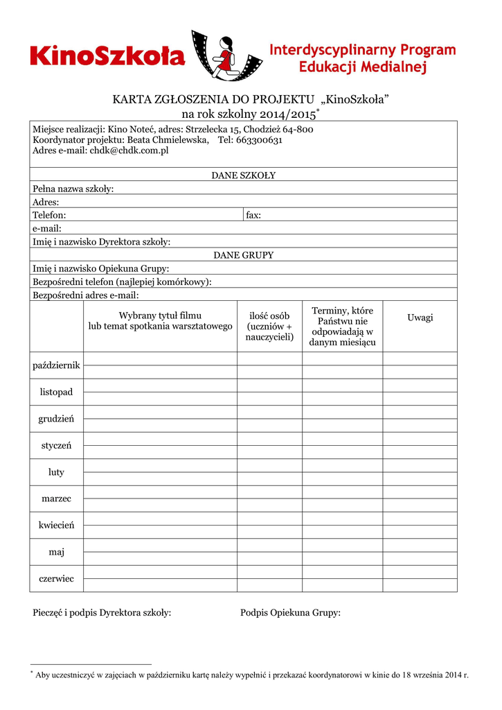 KARTA ZGŁOSZENIA DO PROJEKTU „KinoSzkoła” na rok szkolny 2014/2015 Miejsce realizacji: Kino Noteć, adres: Strzelecka 15, Chodzież 64-800 Koordynator projektu: Beata Chmielewska, Tel: 663300631 Adres e-mail: [email protected] DANE SZKOŁY Pełna nazwa szkoły: Adres: Telefon: e-mail: Imię i nazwisko Dyrektora szkoły: fax: DANE GRUPY Imię i nazwisko Opiekuna Grupy: Bezpośredni telefon (najlepiej komórkowy): Bezpośredni adres e-mail: Wybrany tytuł filmu lub temat spotkania warsztatowego ilość osób (uczniów + nauczycieli) Terminy, które Państwu nie odpowiadają w danym miesiącu Uwagi październik listopad grudzień styczeń luty marzec kwiecień maj czerwiec Pieczęć i podpis Dyrektora szkoły: Podpis Opiekuna Grupy: Aby uczestniczyć w zajęciach w październiku kartę należy wypełnić i przekazać koordynatorowi w kinie do 18 września 2014 r.