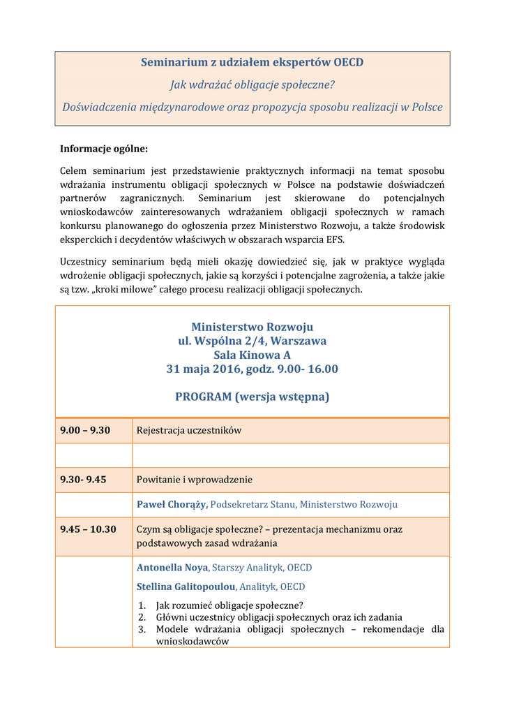 Seminarium z udziałem ekspertów OECD Jak wdrażać obligacje społeczne? Doświadczenia międzynarodowe oraz propozycja sposobu realizacji w Polsce Informacje ogólne: Celem seminarium jest przedstawienie praktycznych informacji na temat sposobu wdrażania instrumentu obligacji społecznych w Polsce na podstawie doświadczeń partnerów zagranicznych. Seminarium jest skierowane do potencjalnych wnioskodawców zainteresowanych wdrażaniem obligacji społecznych w ramach konkursu planowanego do ogłoszenia przez Ministerstwo Rozwoju, a także środowisk eksperckich i decydentów właściwych w obszarach wsparcia EFS. Uczestnicy seminarium będą mieli okazję dowiedzieć się, jak w praktyce wygląda wdrożenie obligacji społecznych, jakie są korzyści i potencjalne zagrożenia, a także jakie są tzw. „kroki milowe” całego procesu realizacji obligacji społecznych. Ministerstwo Rozwoju ul. Wspólna 2/4, Warszawa Sala Kinowa A 31 maja 2016, godz. 9.00- 16.00 PROGRAM (wersja wstępna) 9.00 – 9.30 Rejestracja uczestników 9.30- 9.45 Powitanie i wprowadzenie Paweł Chorąży, Podsekretarz Stanu, Ministerstwo Rozwoju 9.45 – 10.30 Czym są obligacje społeczne? – prezentacja mechanizmu oraz podstawowych zasad wdrażania Antonella Noya, Starszy Analityk, OECD Stellina Galitopoulou, Analityk, OECD 1. 2. 3. Jak rozumieć obligacje społeczne? Główni uczestnicy obligacji społecznych oraz ich zadania Modele wdrażania obligacji społecznych – rekomendacje dla wnioskodawców 4. 5. Korzyści i zagrożenia wynikające z wdrażania społecznych Przykłady realizowanych obligacji społecznych 10.30 – 11.00 Pytania i dyskusja 11.00 – 11.15 Przerwa kawowa 11.15 – 12.15 Propozycja sposobu wdrażania obligacji społecznych w Polsce obligacji Monika Groszkowska, Zastępca Dyrektora w Departamencie Europejskiego Funduszu Społecznego, Ministerstwo Rozwoju 1. Koncepcja oraz główne założenia konkursu w temacie Obligacje społeczne jako narzędzie zwiększenia efektywności świadczenia usług społecznych w obszarach wsparcia EFS 2. Wymagania stawiane wnioskodawcom 12.15 – 13.00 Pytania i dyskusja 13.00 – 13.45 Przerwa obiadowa 13.45 – 15.15 Praktyczne aspekty wdrażania obligacji społecznych w obszarze pieczy zastępczej i bezdomności – prezentacja doświadczeń partnerów zagranicznych Antonella Noya, Starszy Analityk, OECD Stellina Galitopoulou, Analityk, OECD Praktycy realizujący obligacje społeczne w innych krajach – nazwiska do potwierdzenia 1. Określenie, wycena i monitorowanie wyników (efektów) obligacji społecznych 2. Zainicjowanie procesu wykorzystania obligacji społecznych 3. Identyfikacja i zaangażowanie uczestników obligacji społecznych (inwestorzy, usługodawcy, operatorzy) 4. Partnerstwo i umowa pomiędzy partnerami obligacji społecznych – praktyczne aspekty 15.15 – 15.45 Pytania i dyskusja 15.45 – 16.00 Podsumowanie seminarium